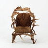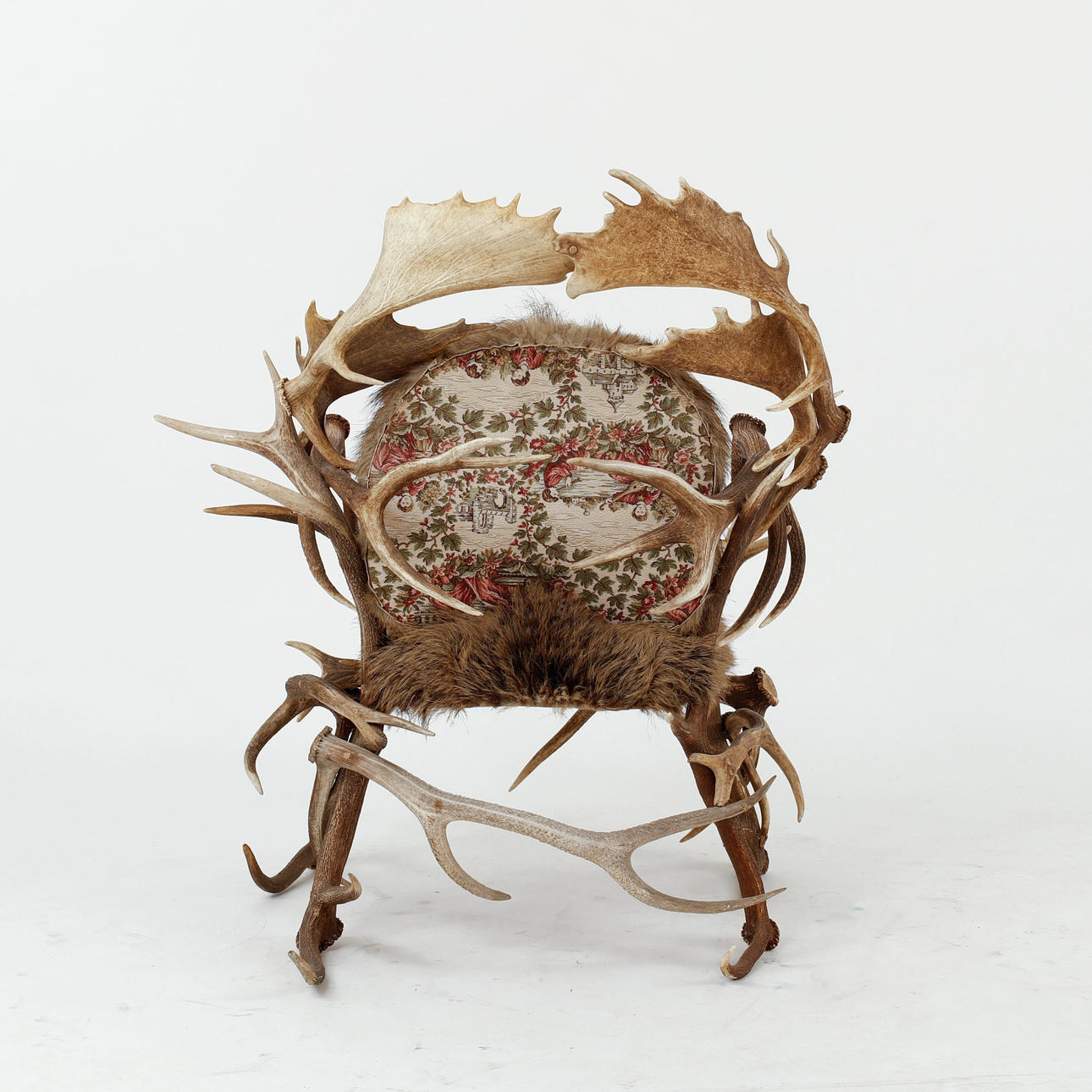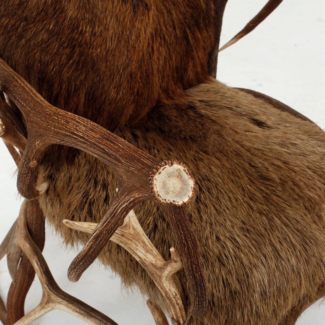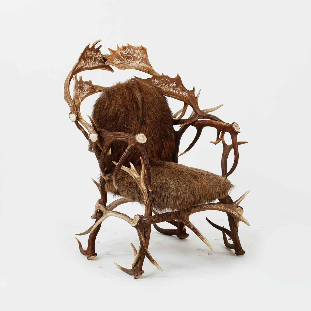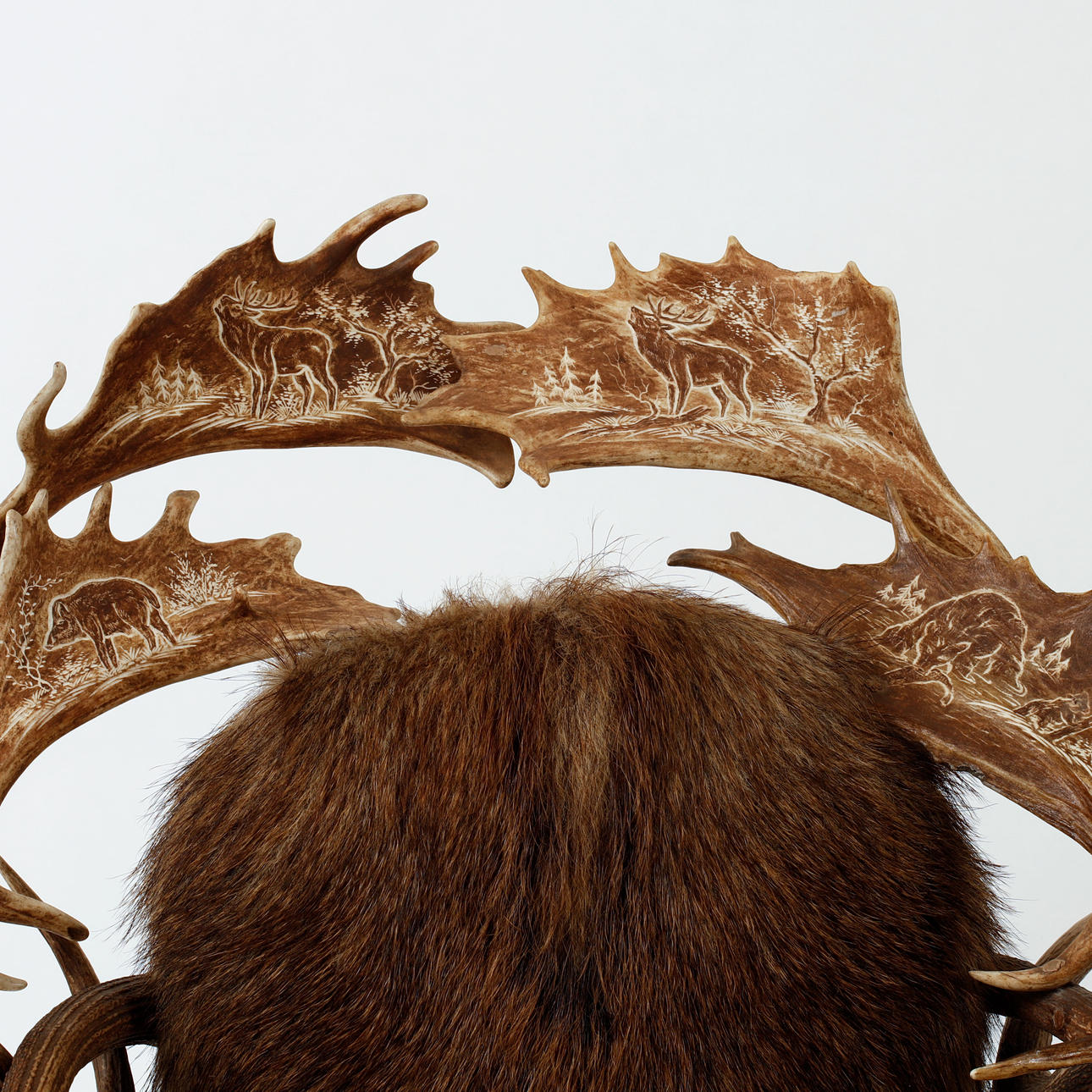 veistetty sisustus, jossa karhu, villisika ja peura, istuin ja selkänoja puupaneeleilla päällystetty tekstiileillä, luultavasti hirviansa.