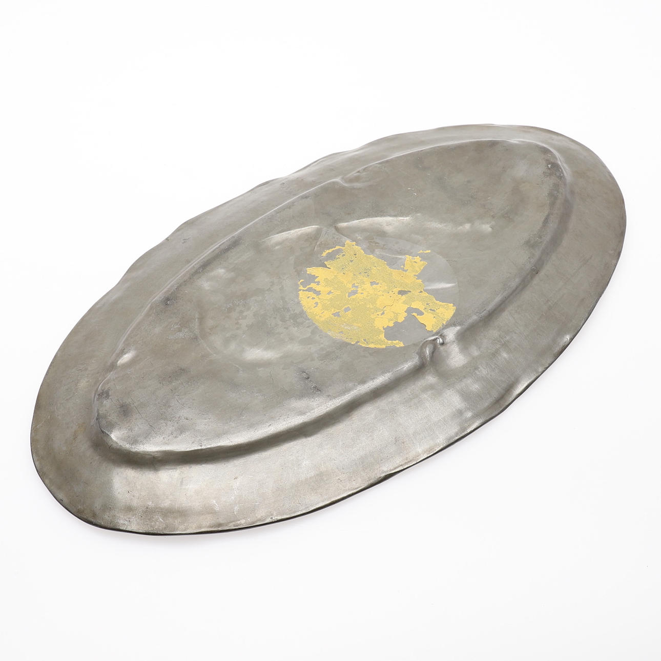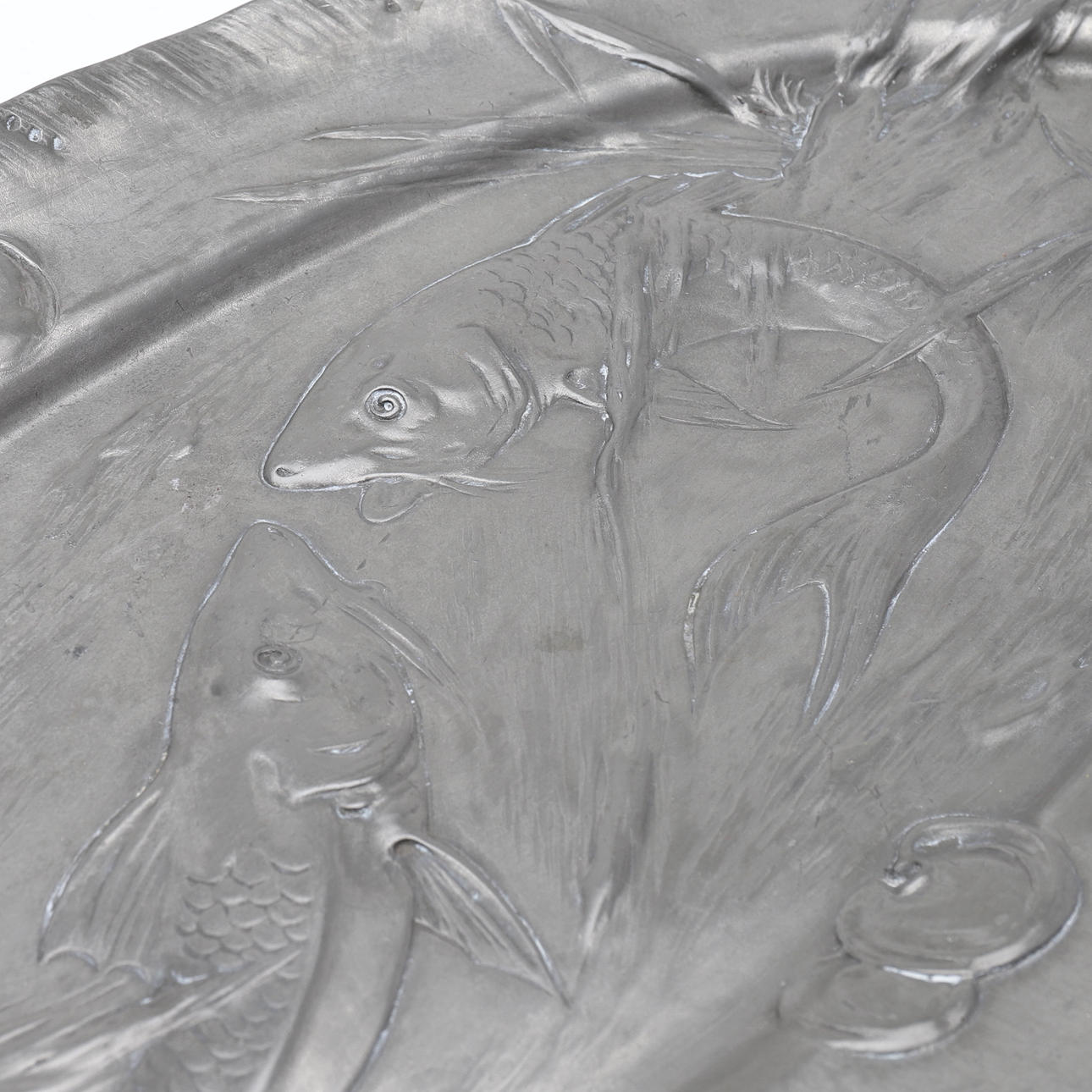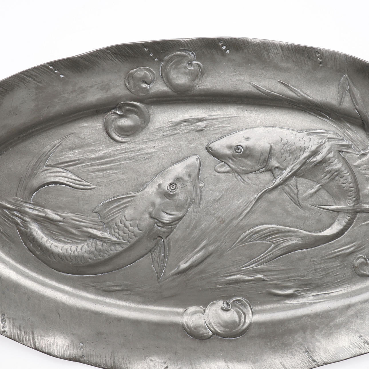 Soikea muoto kalakoristeella, luultavasti Kayserzinn, pituus 46 cm.