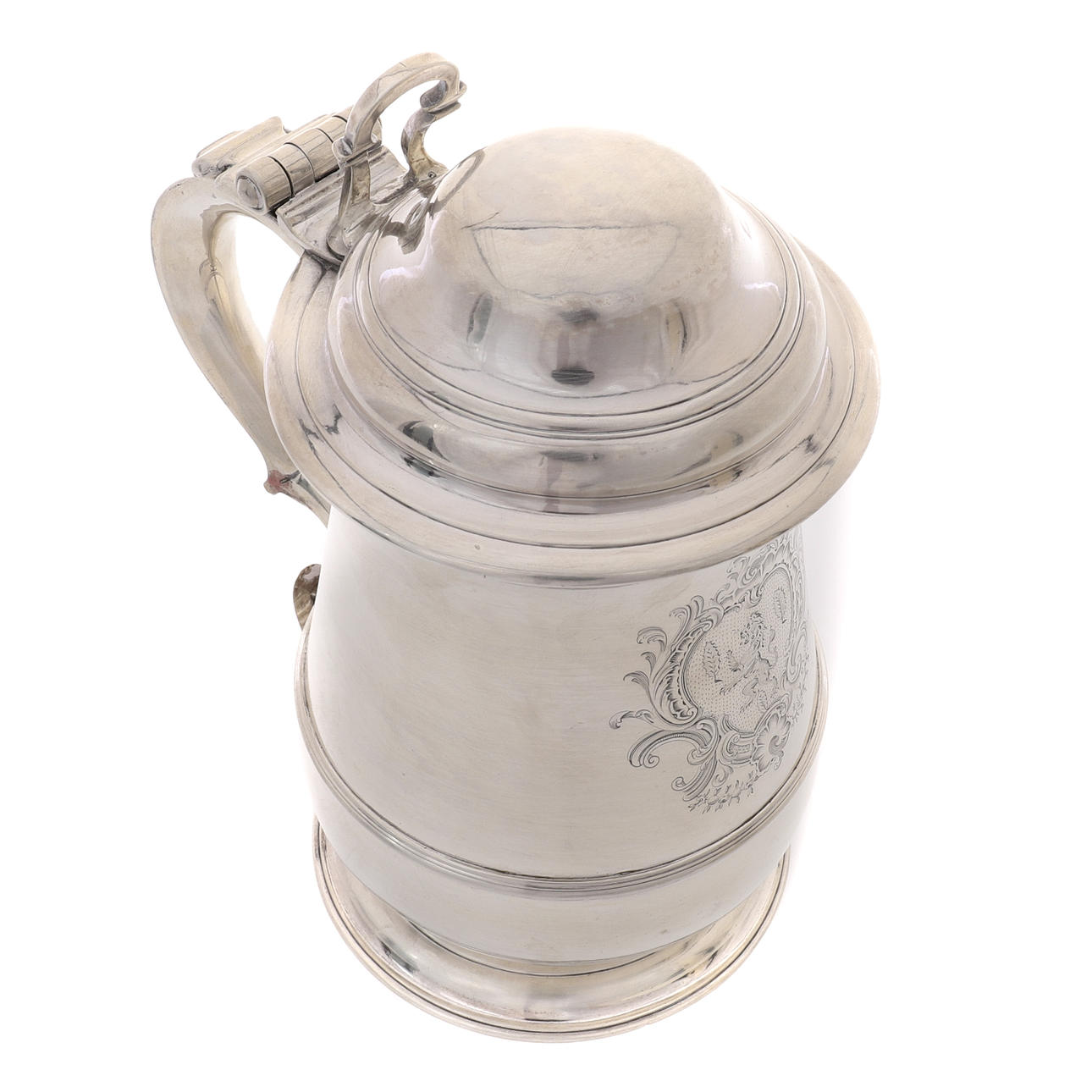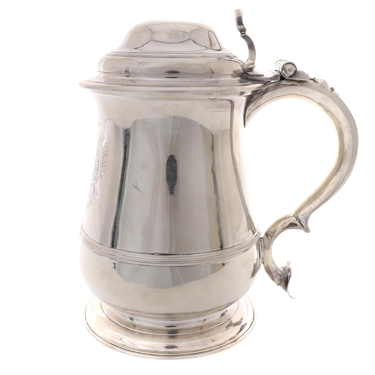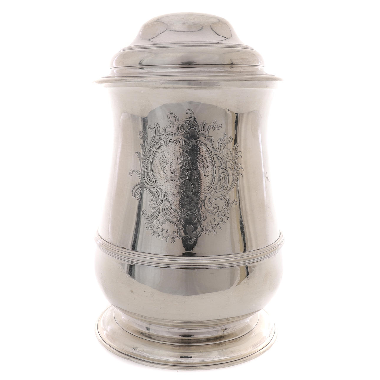 Richard Gurney & Co, Lontoo 1746, muotoiltu vyö, kupumainen saranoitu kansi muotoilluilla nauhoilla, kaksoisrullakahva avoimella "c" vierityspeukalokappaleella ja sydämenmuotoinen pääte, porrastetussa, leviävässä pyöreässä jalassa, jossa on muotoiltu reuna, sivuille kaiverrettu rocaille-kartussi, jossa harja lyönnissä olevaa maata vasten, 20 cm korkea, 897,9 g, 28,87 unssia English Country House Collection osa II.