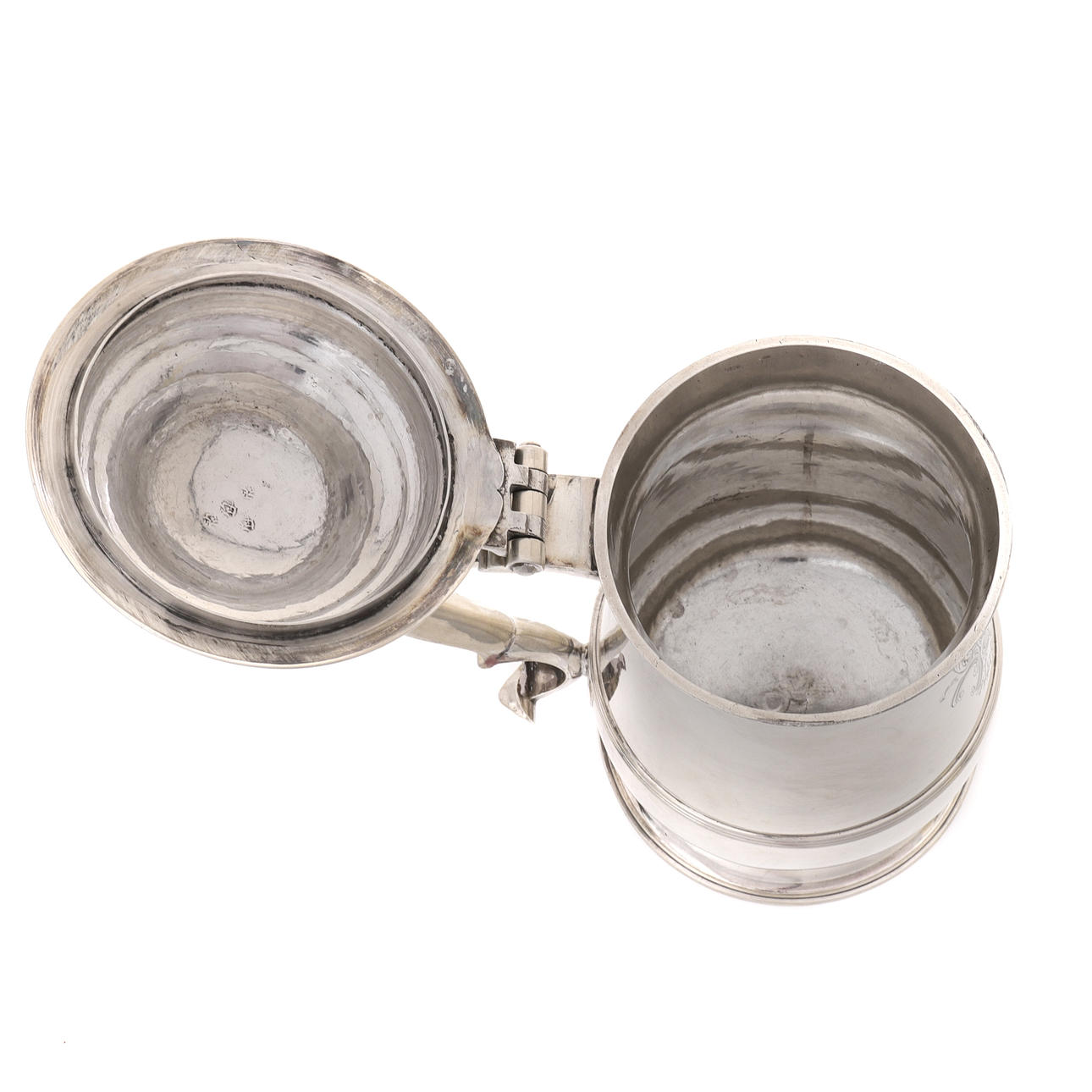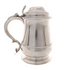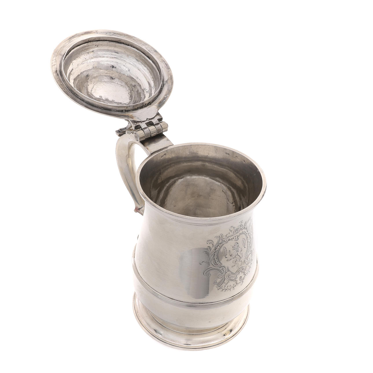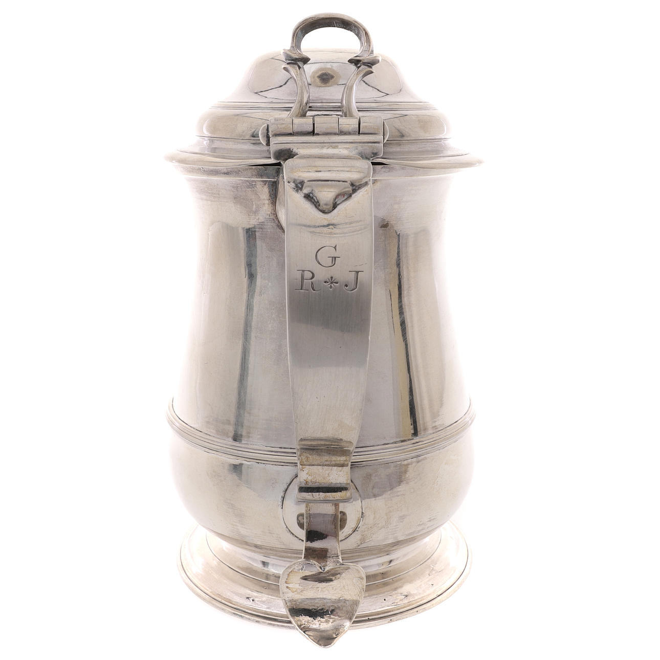Richard Gurney & Co, Lontoo 1746, muotoiltu vyö, kupumainen saranoitu kansi muotoilluilla nauhoilla, kaksoisrullakahva avoimella "c" vierityspeukalokappaleella ja sydämenmuotoinen pääte, porrastetussa, leviävässä pyöreässä jalassa, jossa on muotoiltu reuna, sivuille kaiverrettu rocaille-kartussi, jossa harja lyönnissä olevaa maata vasten, 20 cm korkea, 897,9 g, 28,87 unssia English Country House Collection osa II.
