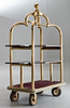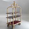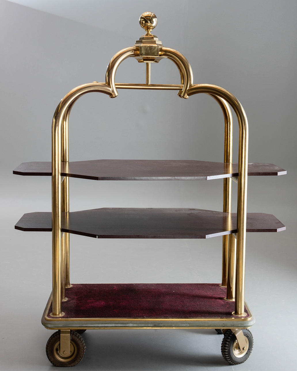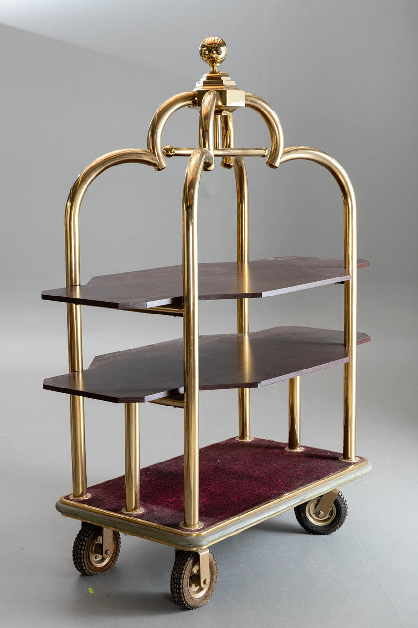 Ruostumaton teräs, kullanvärinen. Suorakaiteen muotoinen kokolattiamatto kääntyvillä pyörillä kahdella jarrulla. Kaksi pyöreää tukia, joissa molemmissa on vaakasuora keskipalkki. Kaareva ylöspäin. Pallon pää keskellä. 2 puusta valmistettua hyllyä/buffet-aluetta.