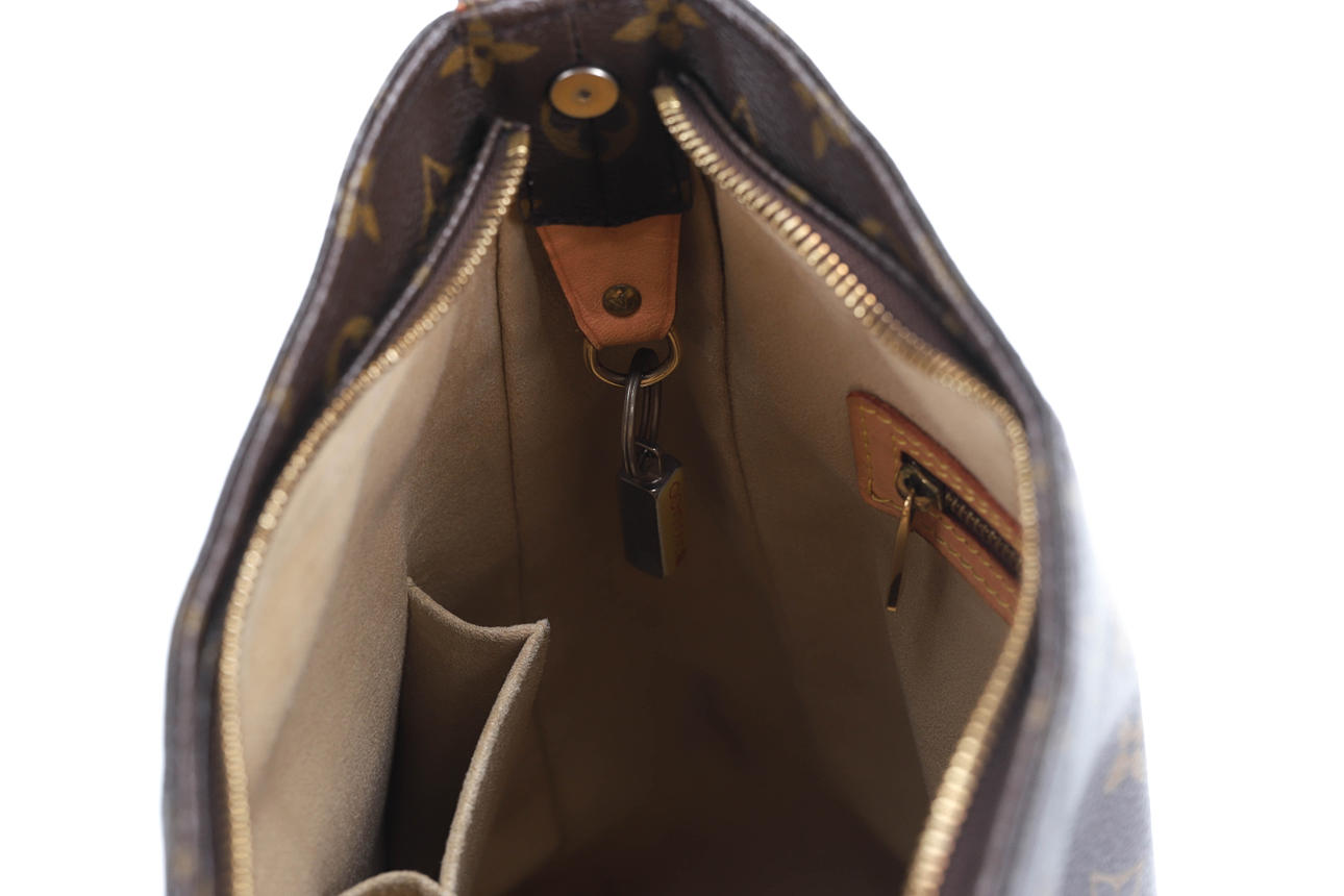 Monogrammikangas, jossa nahkayksityiskohtia, merkintä LOUIS VUITTON PARIS, Made in France. Mitat n. 28x31x10 cm. Sisäinen kännykkätasku, vetoketjullinen sisätasku.