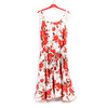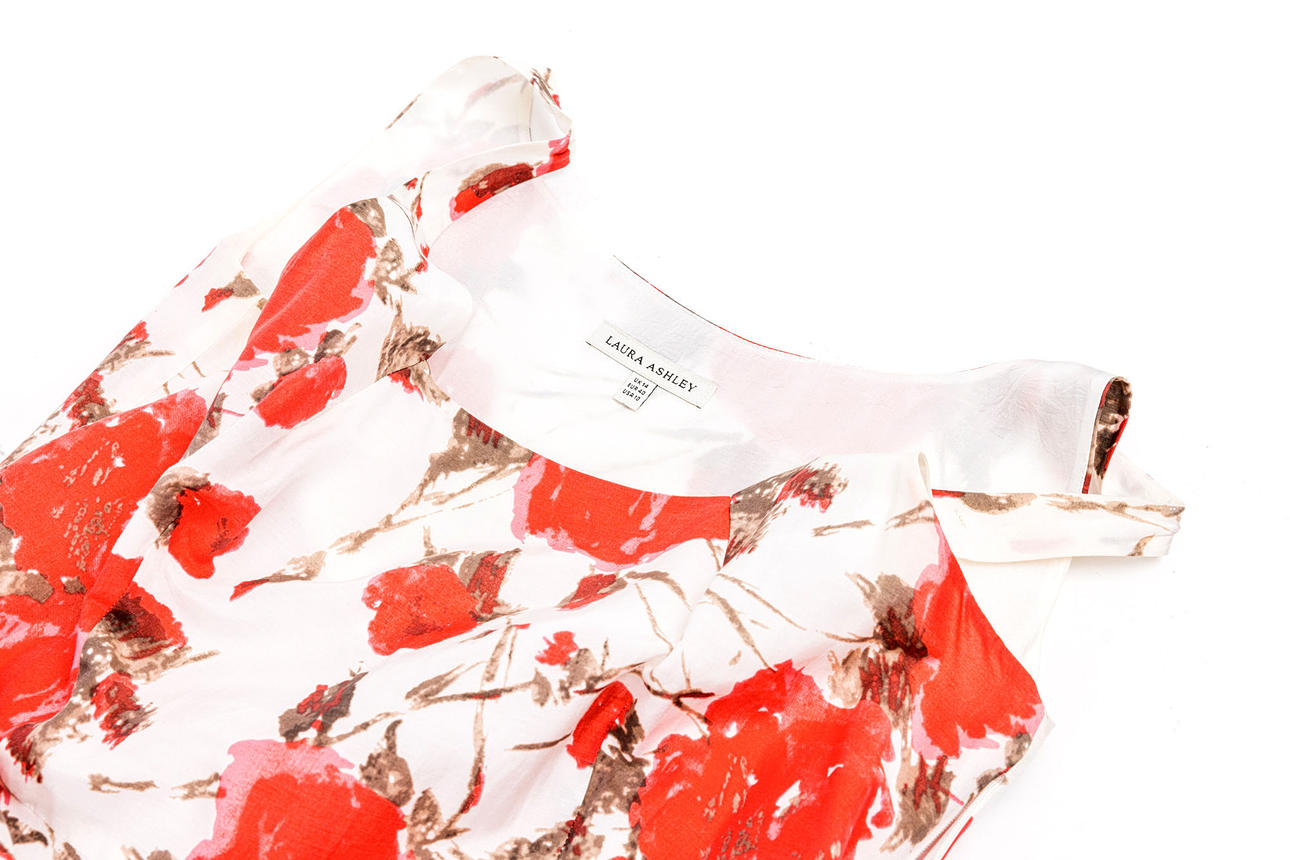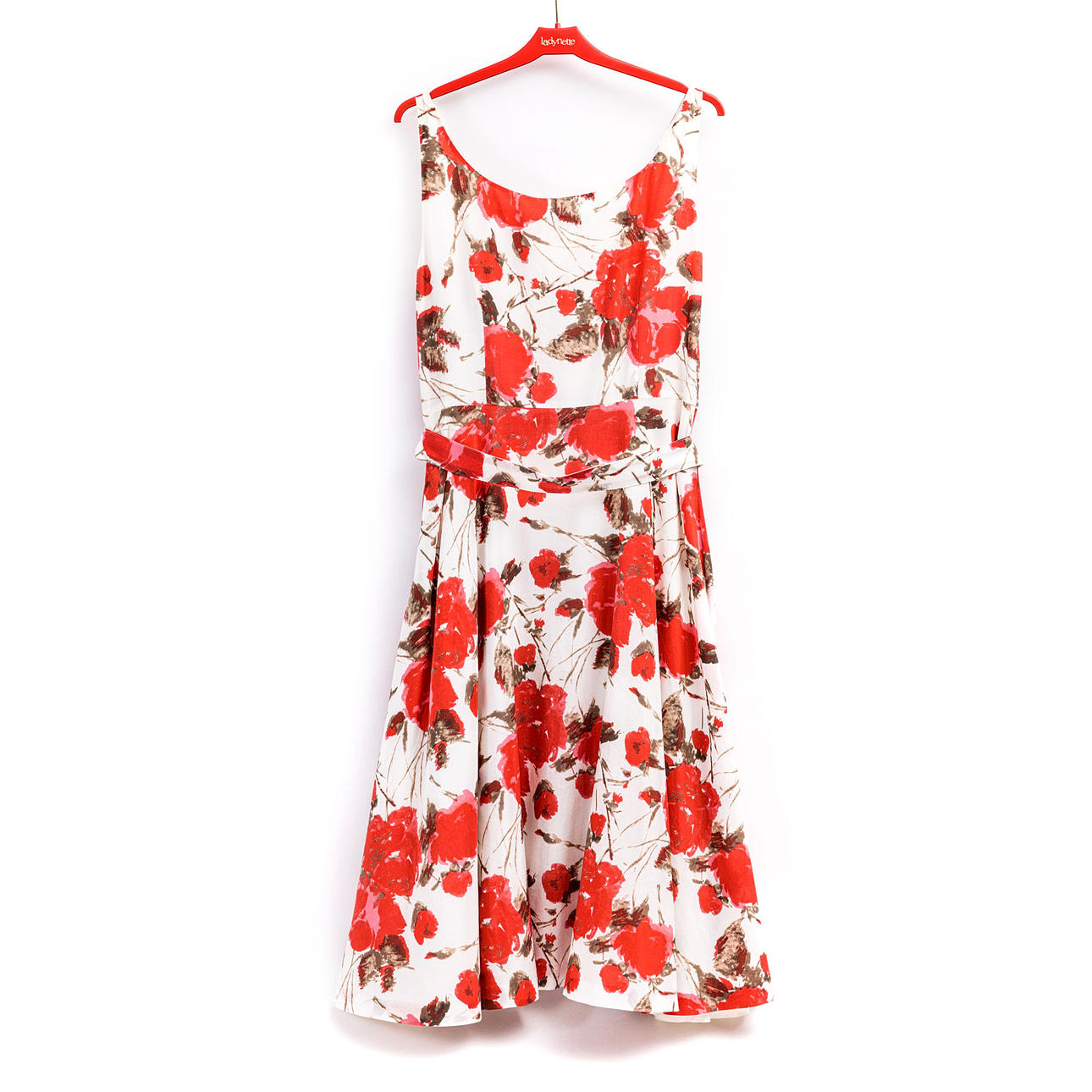 Kukkakuvioinen kangas, jossa rusetti vyötärönauhalla. Sivussa vetoketju. Vuorattu laskostetulla helmalla alareunassa. Koko 40 etiketin mukaan.