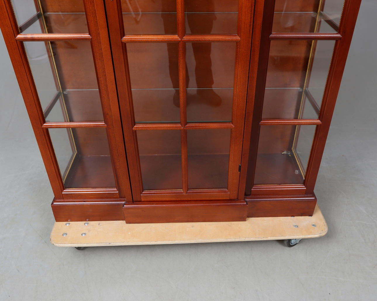 Lasiset hyllyt. Valaistus. Pituus n. 118, leveys 37, korkeus 198 cm.