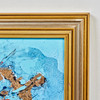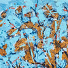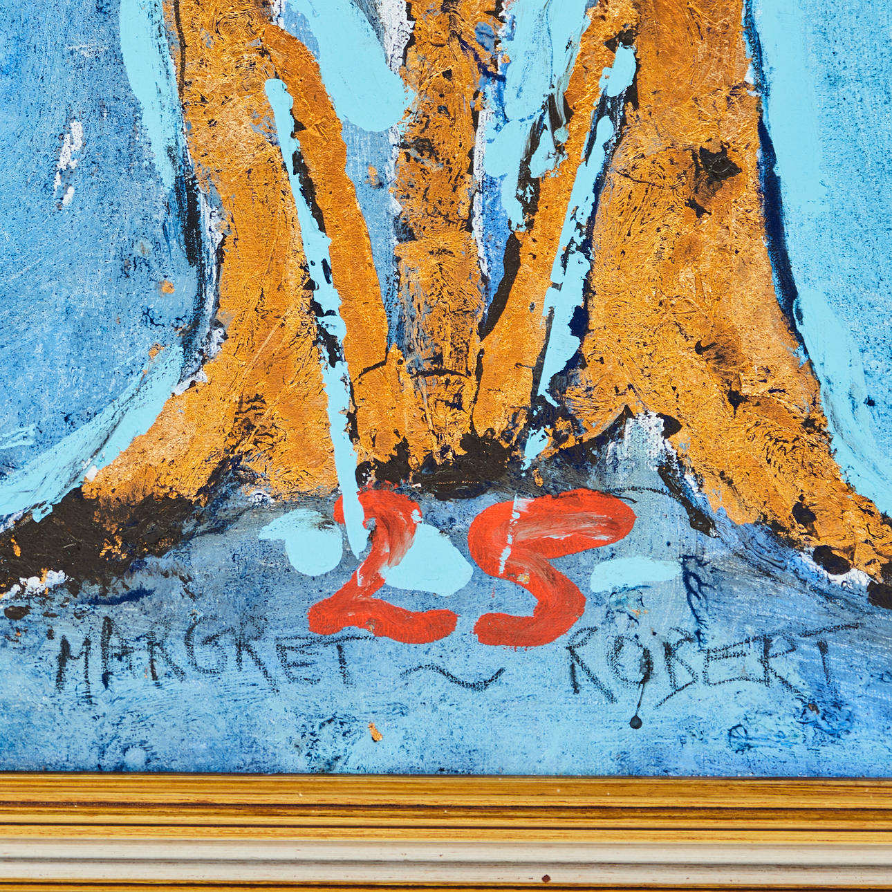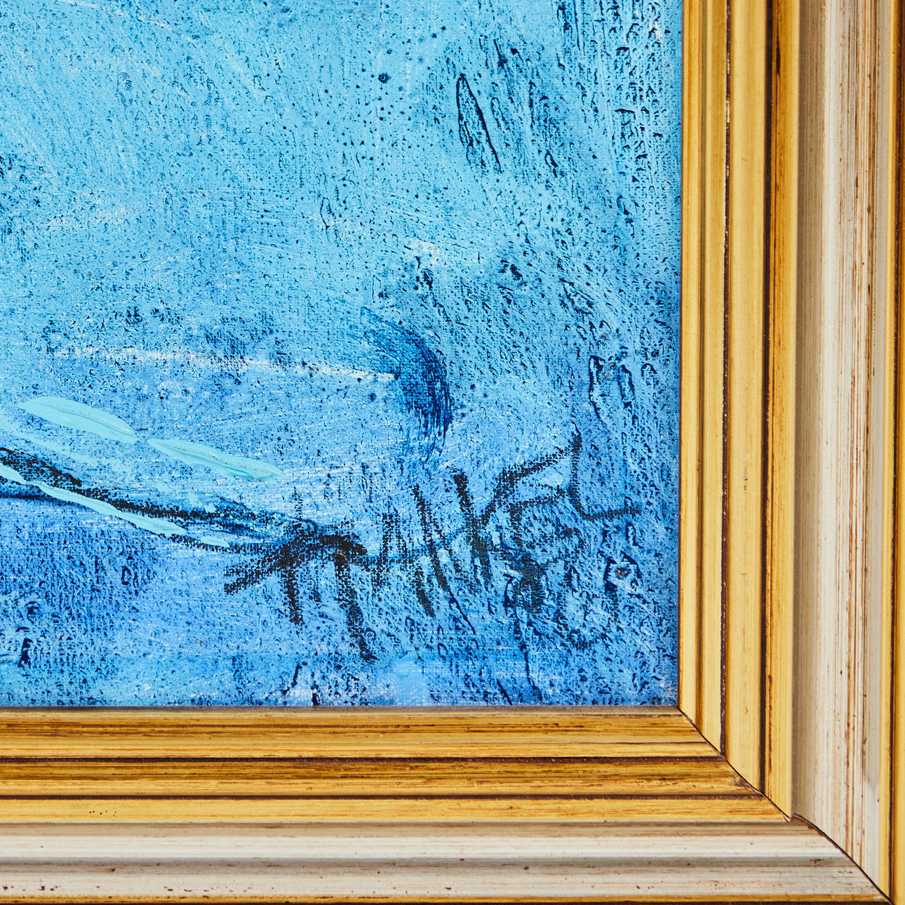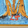 Thomas Mikel (s. 1948), maalaus, puu, sekatekniikka kankaalle. Abstrakti kuva puusta kullan ja punaisen sinisellä pohjalla, signeerattu alhaalla oikealla, 79x58cm (88x68cm).