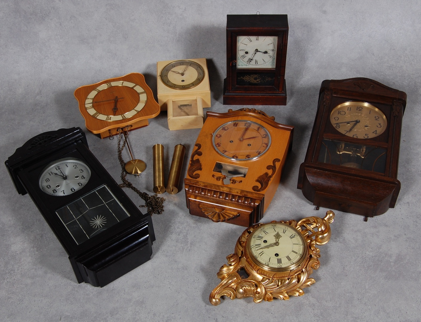 20340. Erä , PÖYTÄKELLOT, 7 st.1900-1960s.