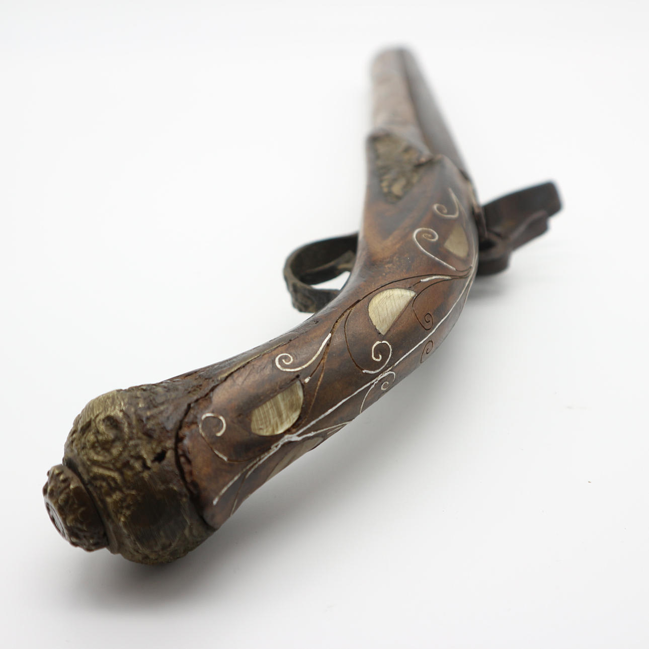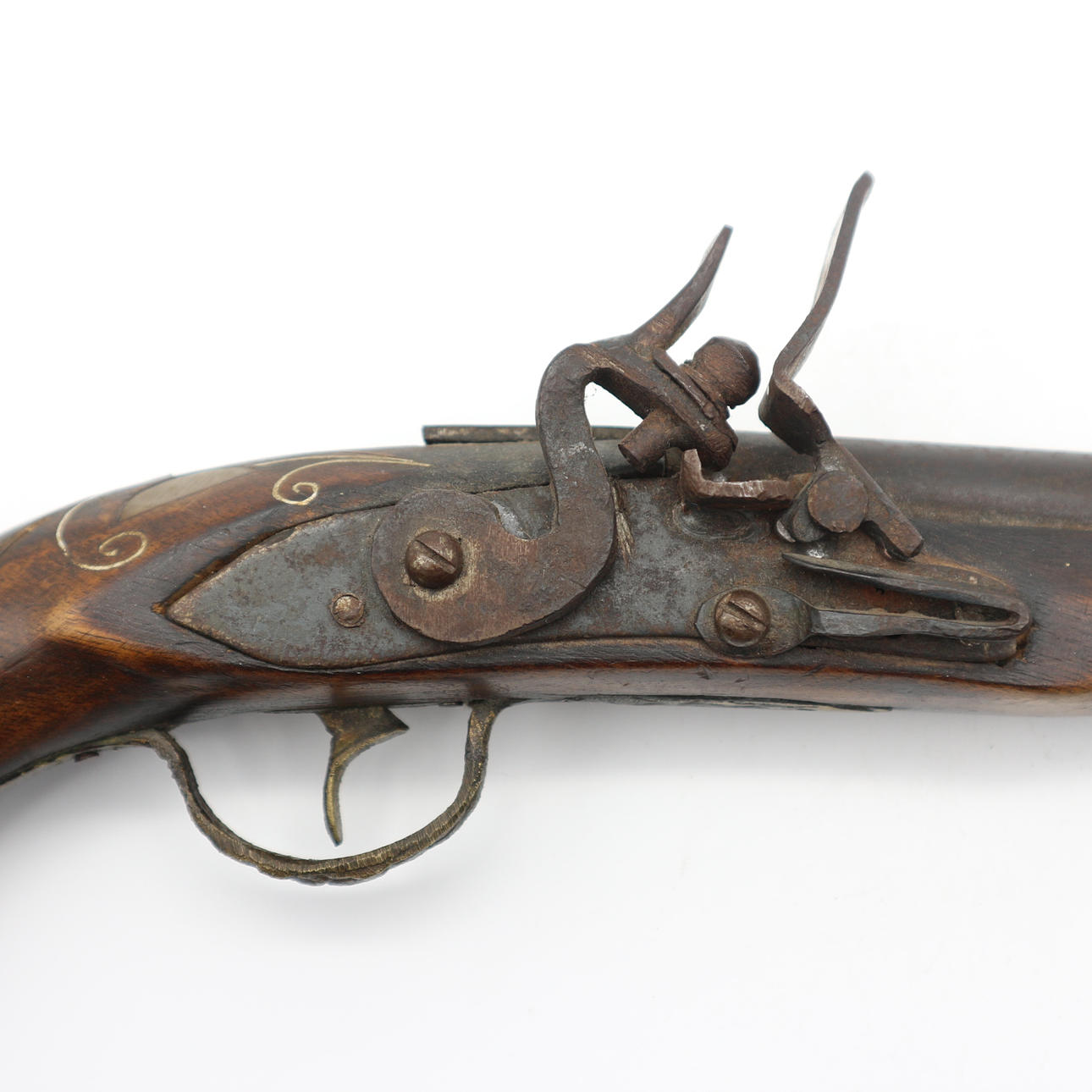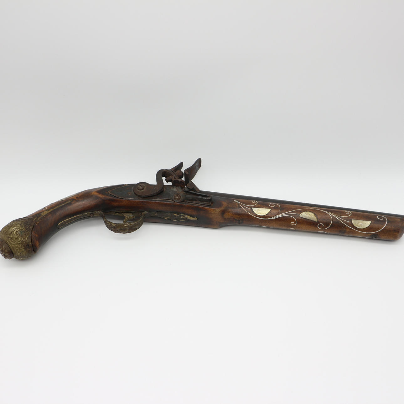 Koristeellinen piikivipistooli upotuksilla Pituus: n. 42 cm.