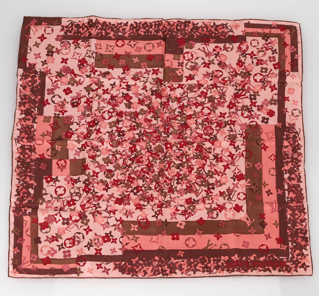 Monogrammi, vaaleanpunaisen ja ruskean sävyissä. Valmistettu Italiassa. Noin 66x66 cm, alkuperäinen laatikko ja laukku mukana.