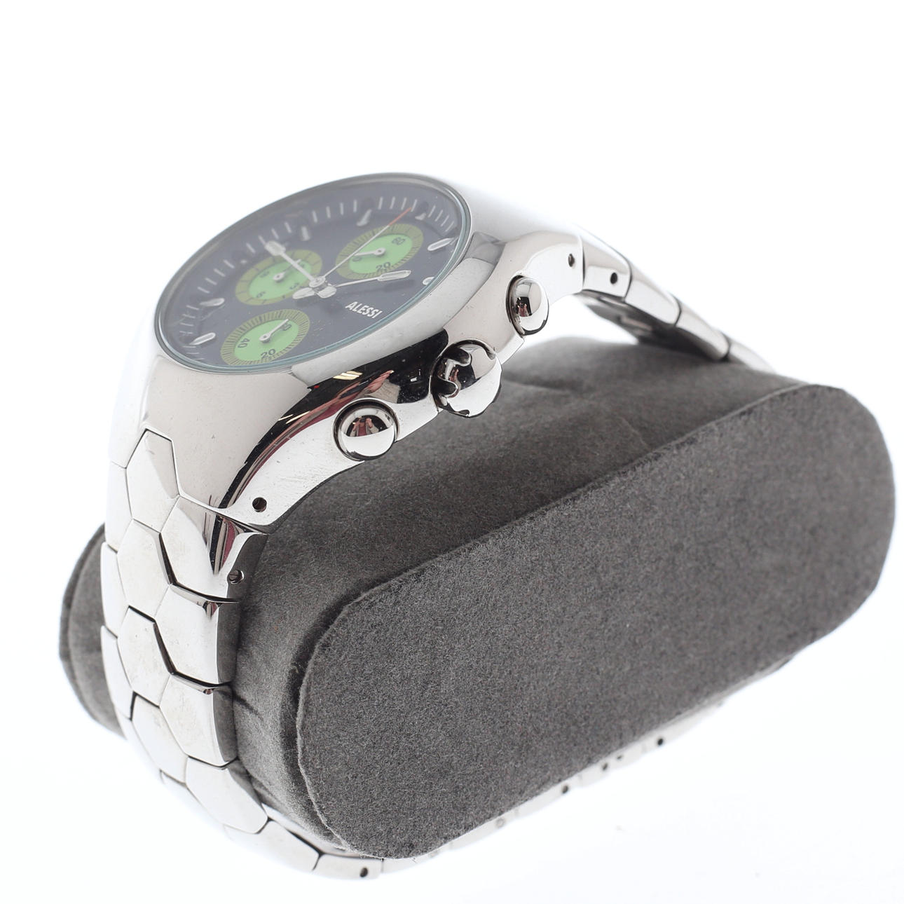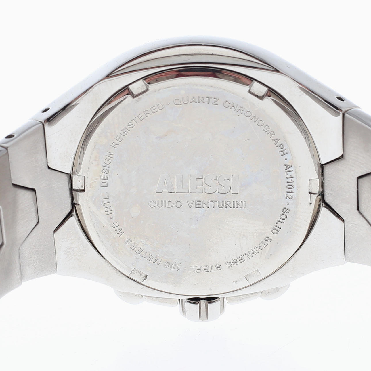 Terästä, kalenteri. Halkaisija ilman kruunua n. 41 mm. Kotelon kannessa merkintä Alessi Guido Venturini. Malli AL11012.