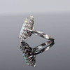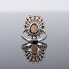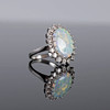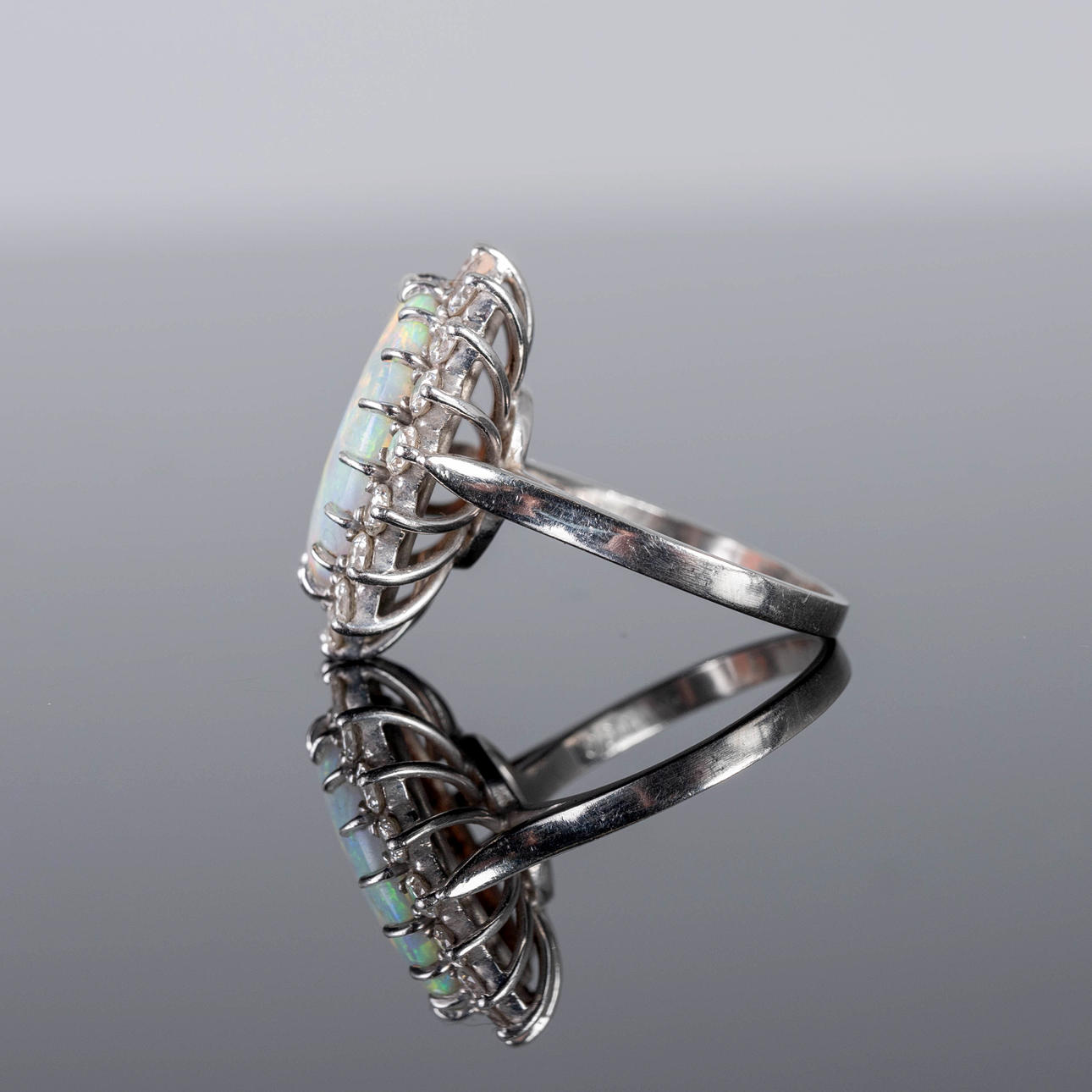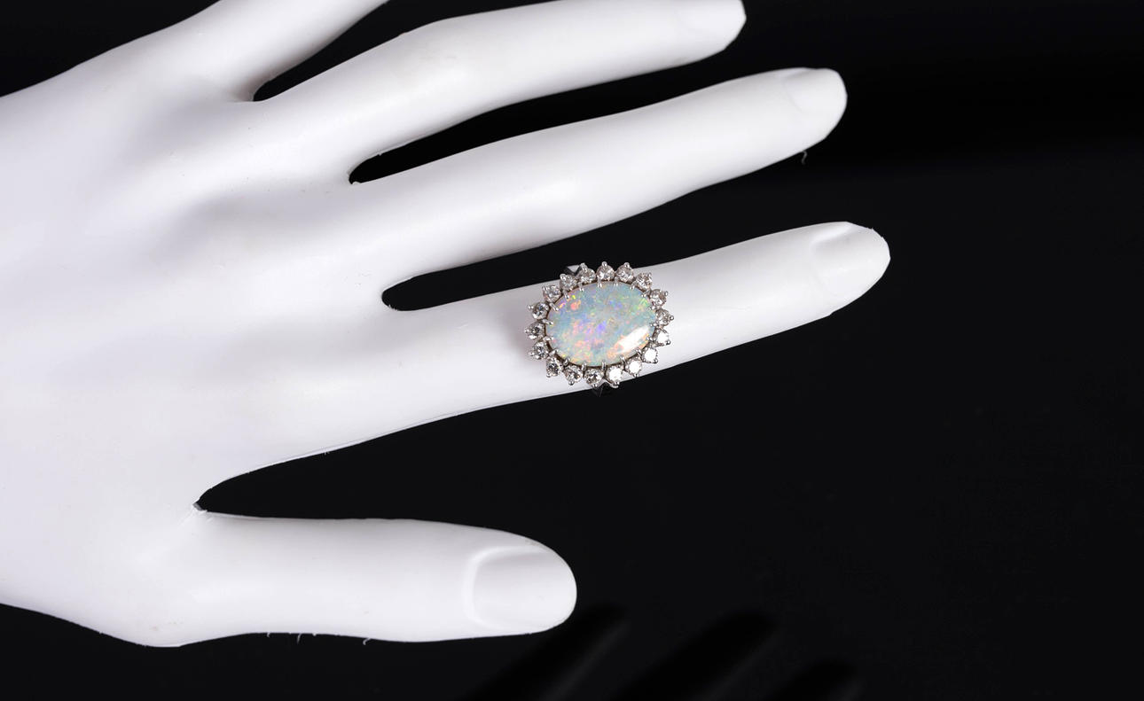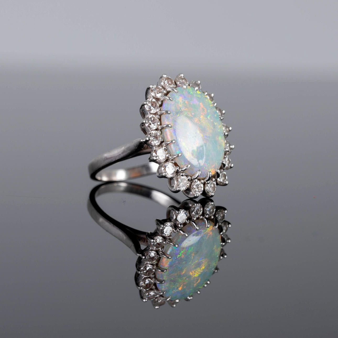 Platinasormus, keskellä opaali ja timantteja yhteensä n. 0,70 ct. Väri.: Top Crystal (I), puhtaus.: VS-SI. Opaalin mitat n. 11mm x 15mm. renkaan koko n. 50 paino n. 7,9 grammaa.