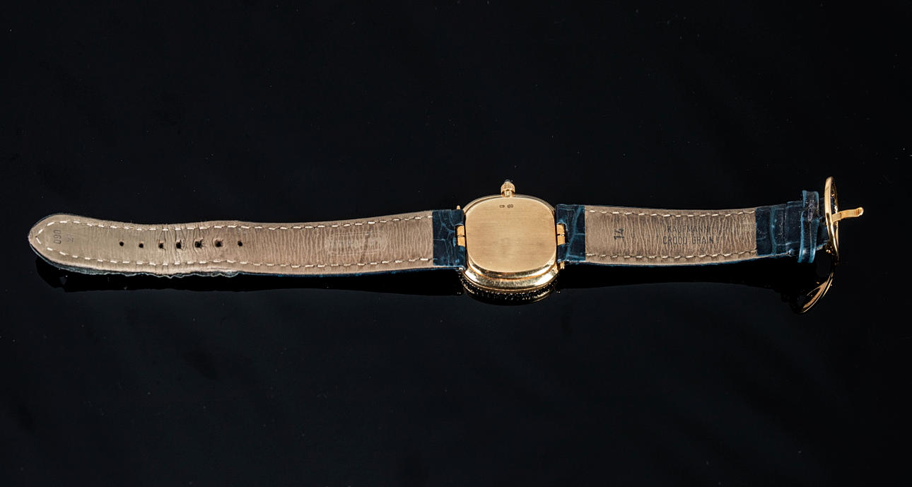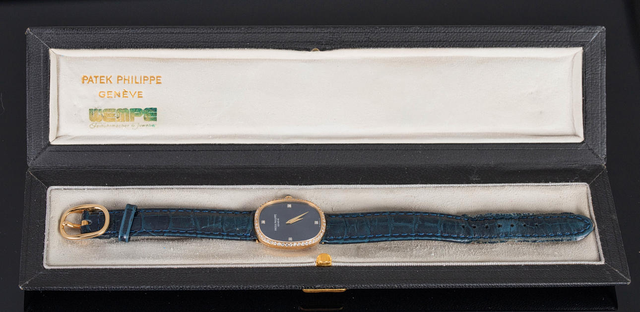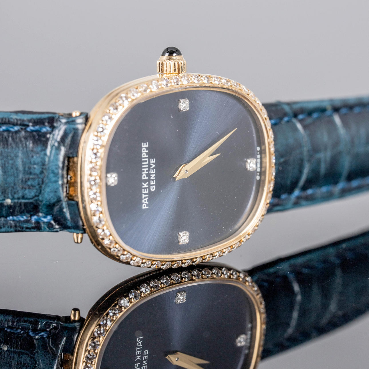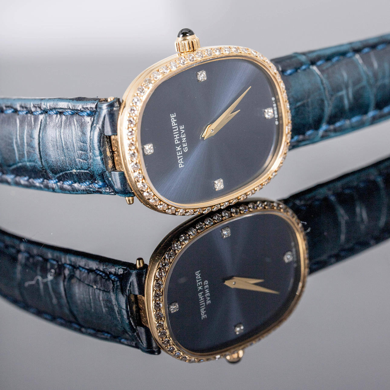 Patek Philippe naisten rannekello, malli "Ellipse". viite 4382. kotelo valmistettu 18kt. Kultasetti timanteilla. Sininen kellotaulu minuutti- ja tuntiosoittimilla, käämityskruunu safiirilla, mineraalilasia, nahkaranneke 750 kultasoljella, manuaalinen käämitys. mitat n. 22,5 x 228 mm. Kello toimii, Stockhoms Auctions ei takaa toimivuutta.