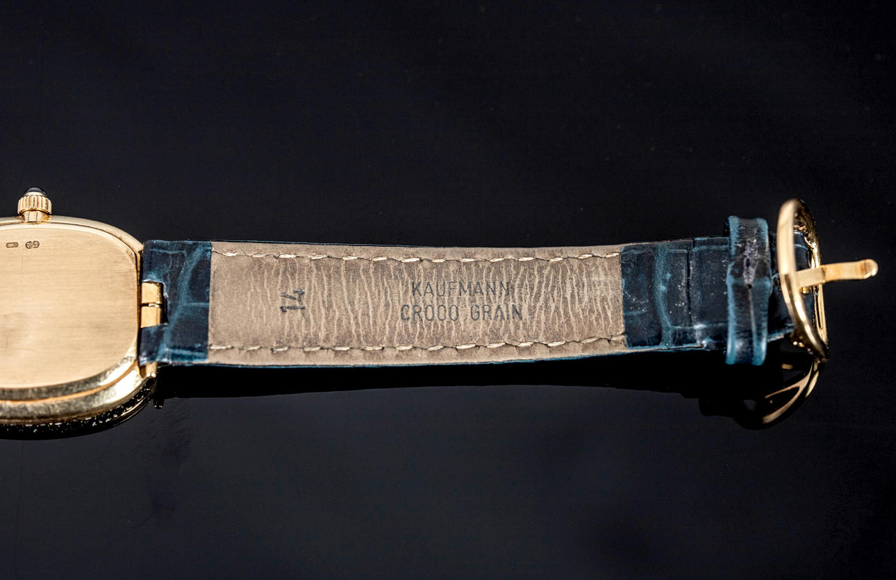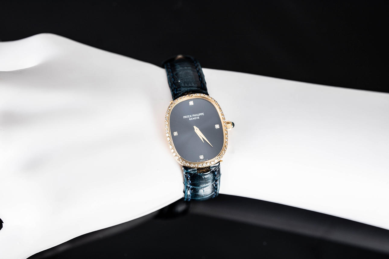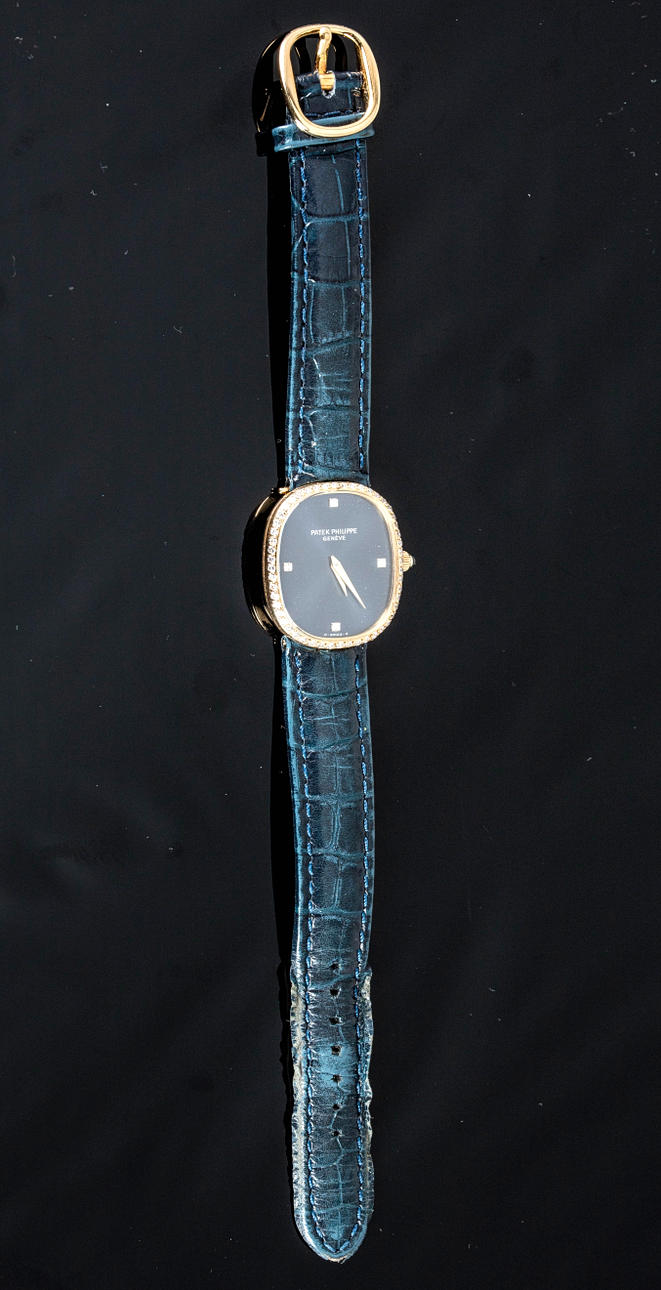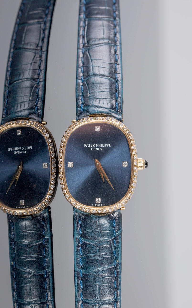 Patek Philippe naisten rannekello, malli "Ellipse". viite 4382. kotelo valmistettu 18kt. Kultasetti timanteilla. Sininen kellotaulu minuutti- ja tuntiosoittimilla, käämityskruunu safiirilla, mineraalilasia, nahkaranneke 750 kultasoljella, manuaalinen käämitys. mitat n. 22,5 x 228 mm. Kello toimii, Stockhoms Auctions ei takaa toimivuutta.