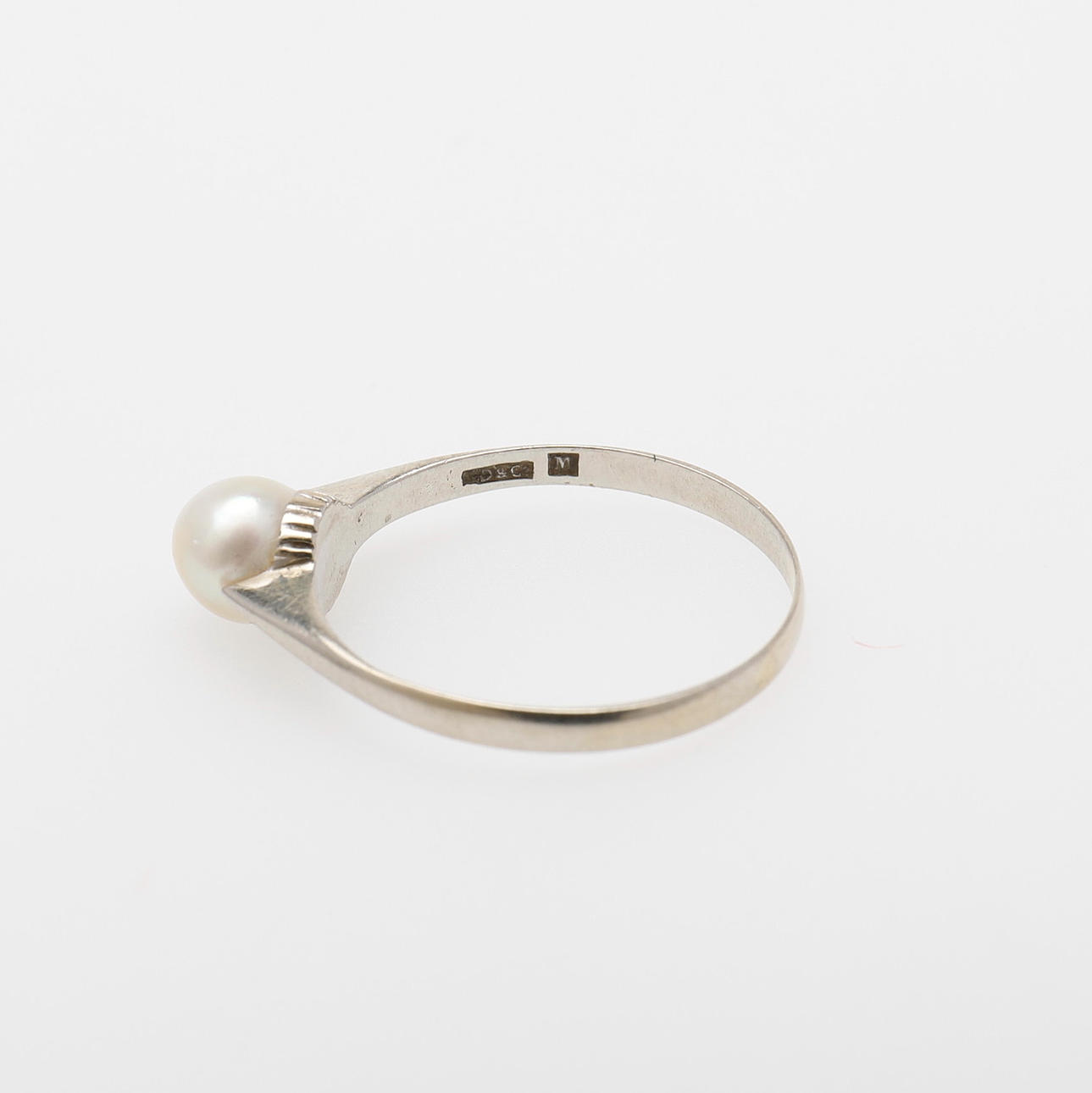 Sormuskisko 18k valkokultaa, leimattu Malmö 1967, viljelty helmi 5 mm, paino 1,7 grammaa, koko 18.