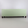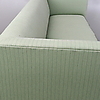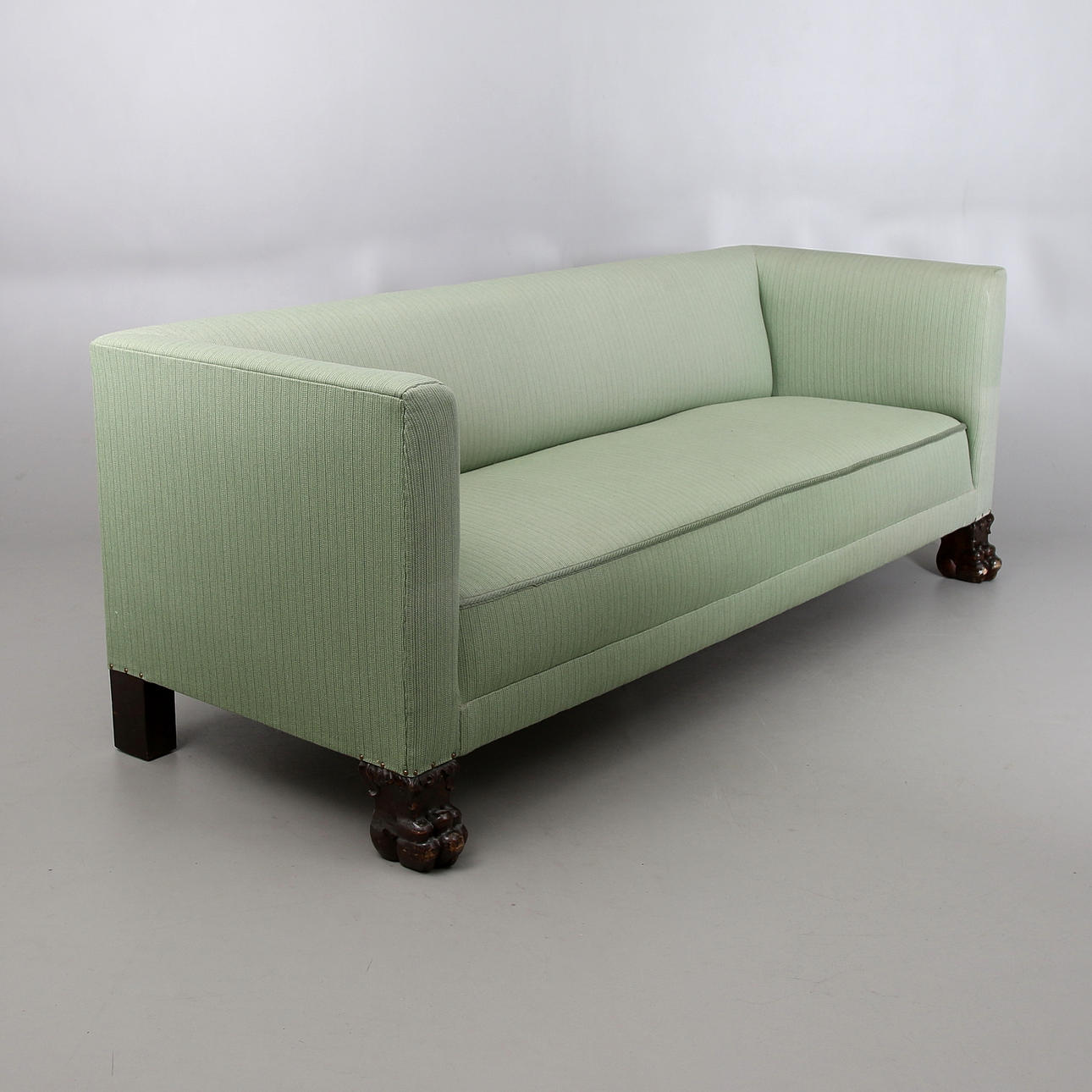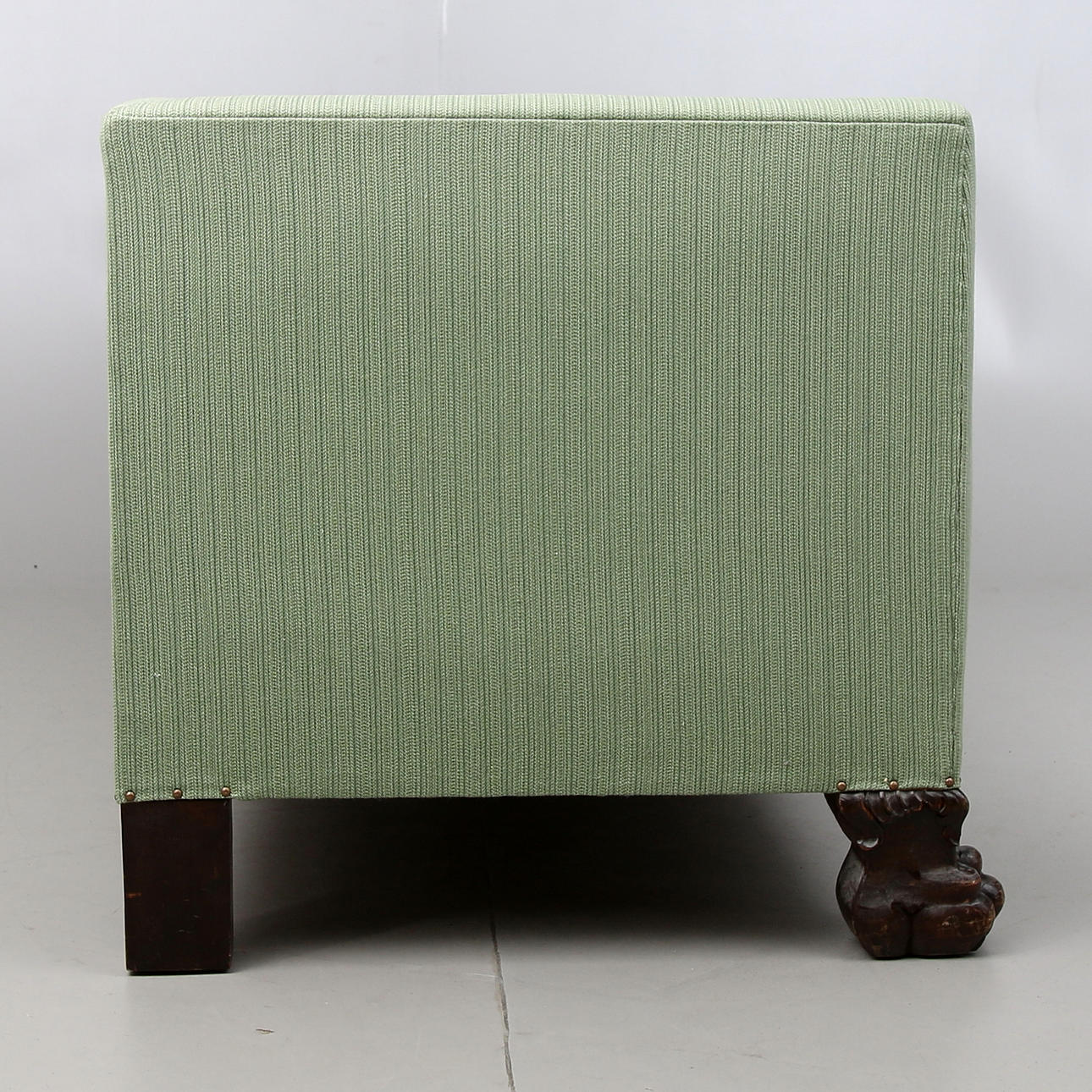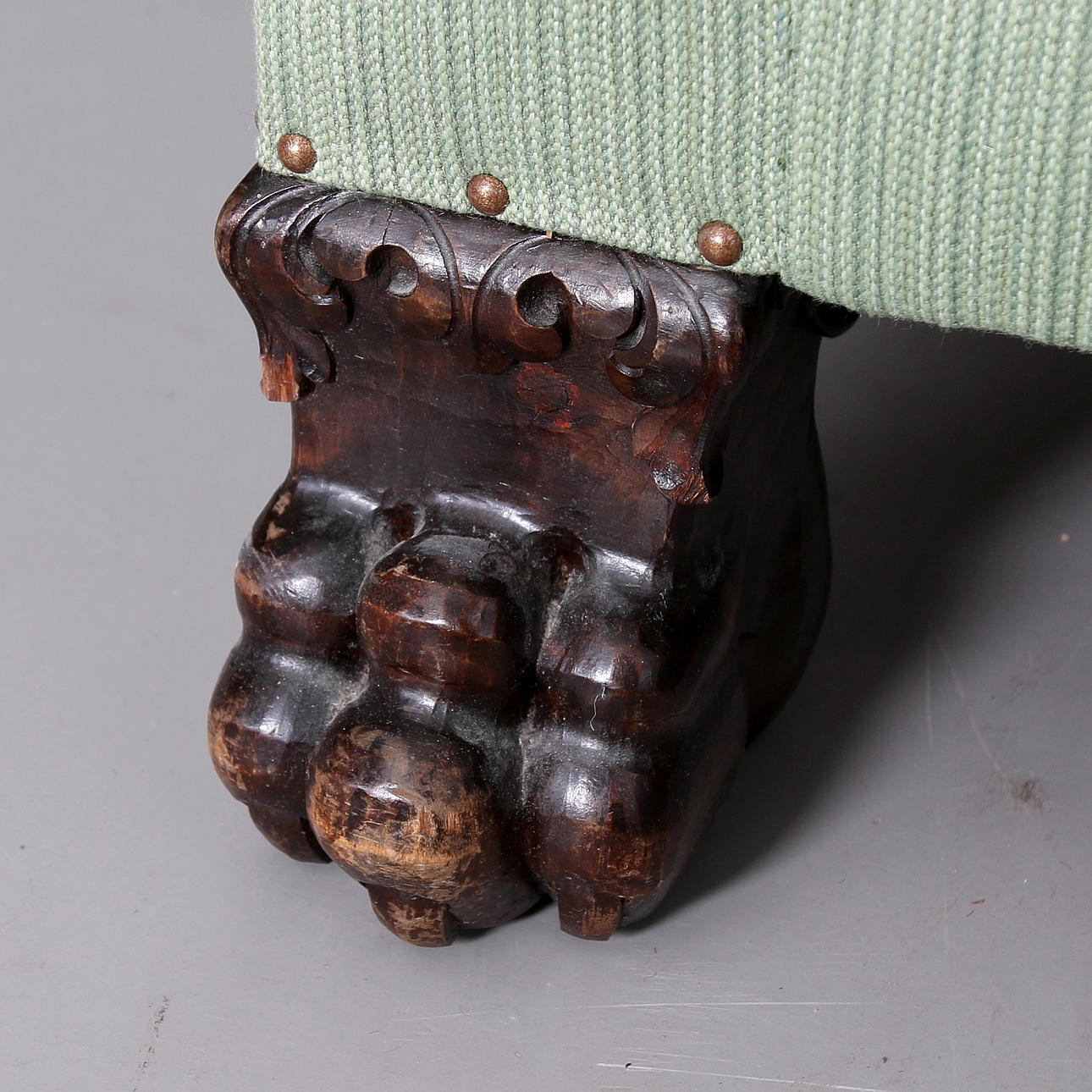 Täysin verhoiltu selkänoja ja istuin, vihreä tekstiili, jalan etuosa veistettyä puuta leijonatassujen muodossa. Varmaan myöhempi puku. Leveys/pituus 210, syvyys 76, korkeus 76 cm.