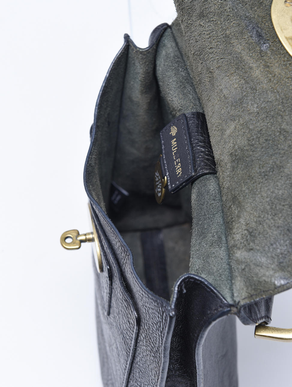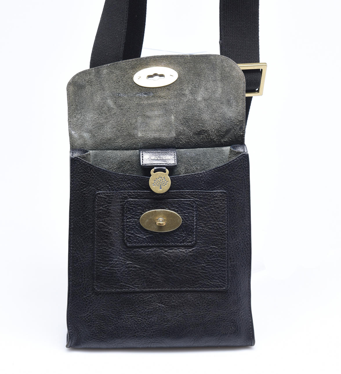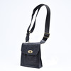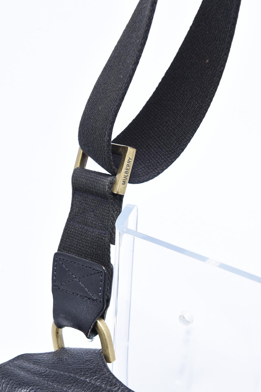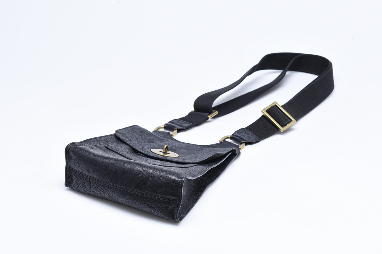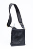 "Messenger bag" mustaa nahkaa olkahihnalla mustaa kudottua puuvillaa. Plakki- ja etikettimerkitty. Mitat noin 27x20x7 cm.