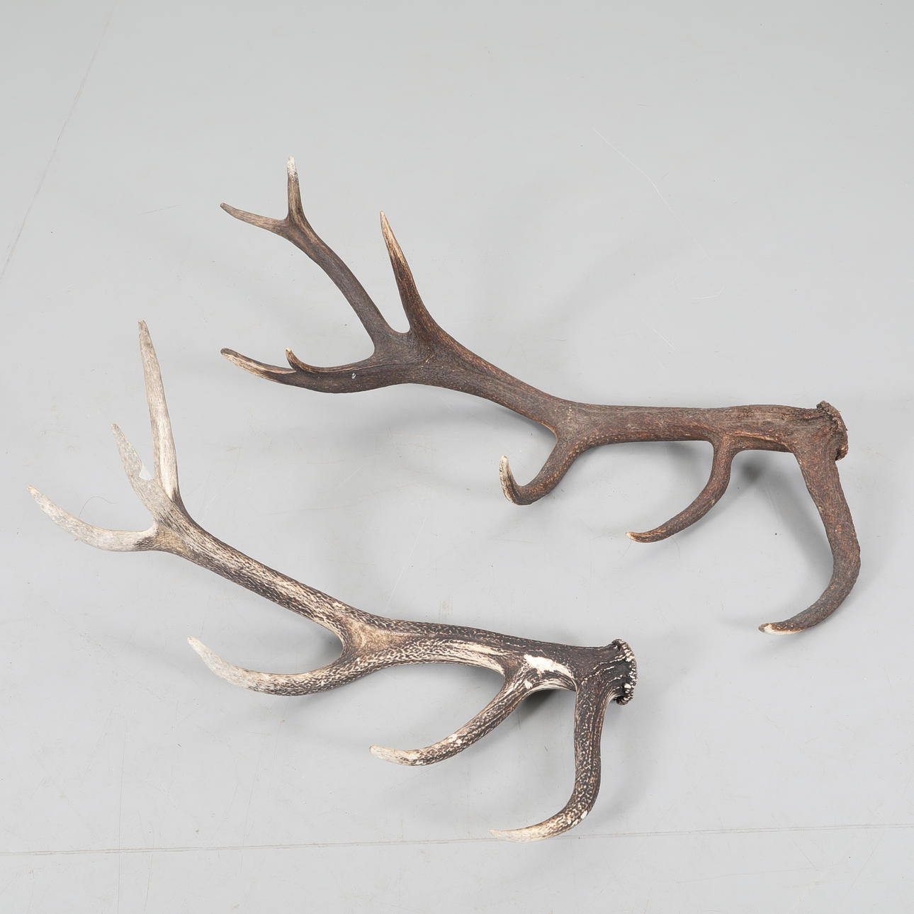 2 irrallista hirven sarvia 8 piikkiä, pituus n. 90 cm 6 piikkiä, pituus n. 78 cm.
