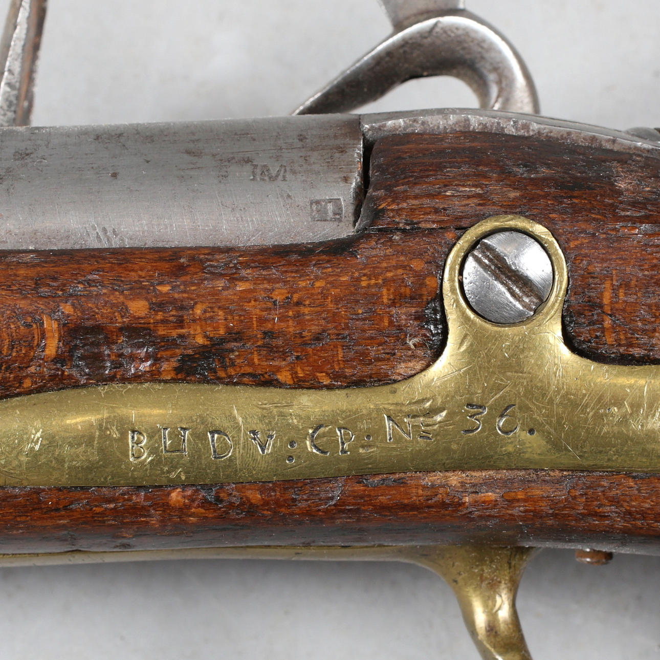 Lukko ja piippu merkitty "436". Messinkiset liittimet, joissa on merkintä "BUDV: CP No 36".