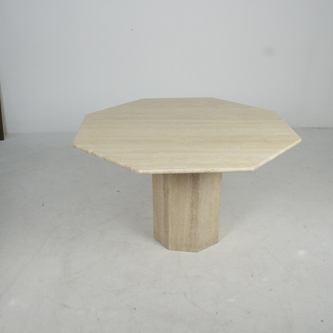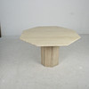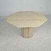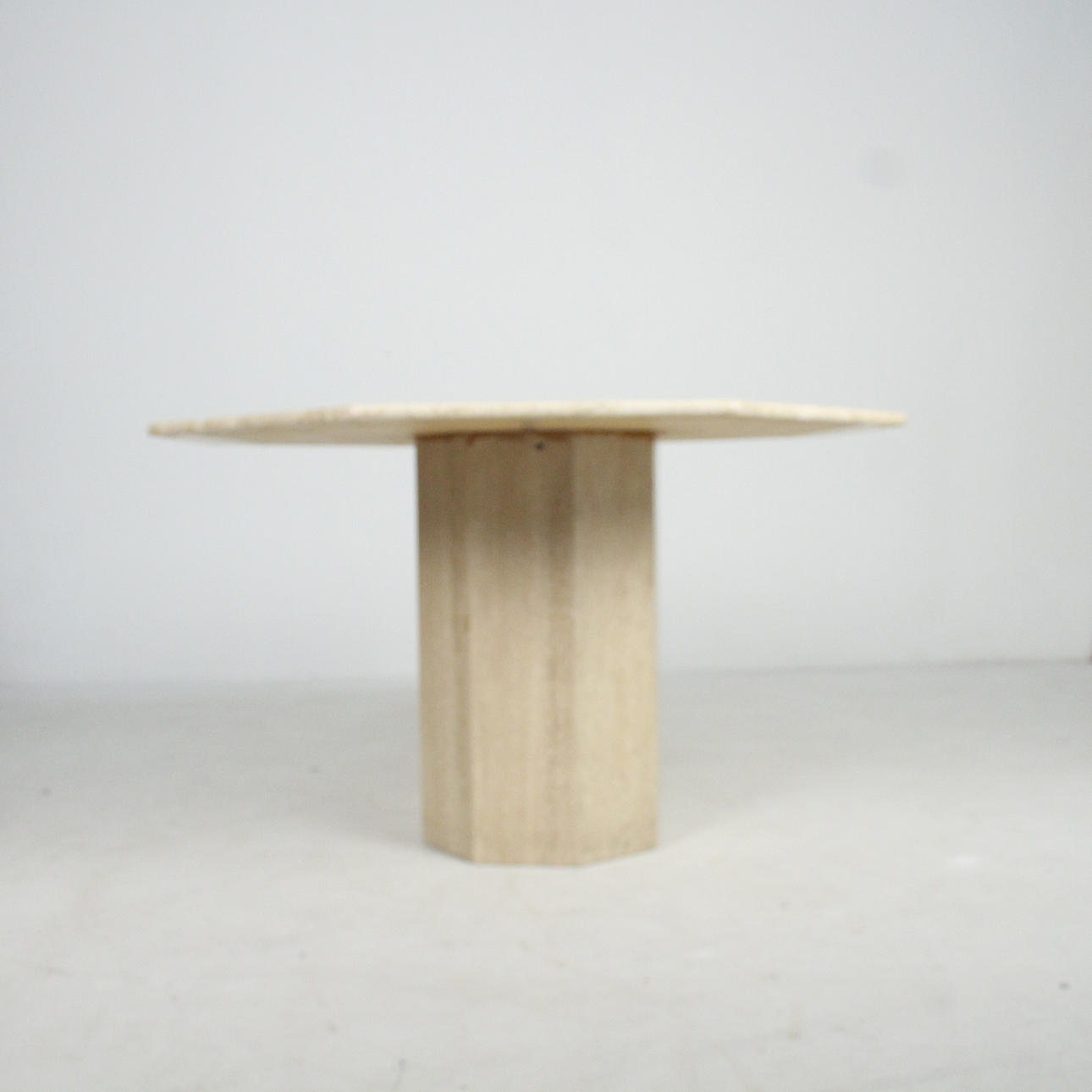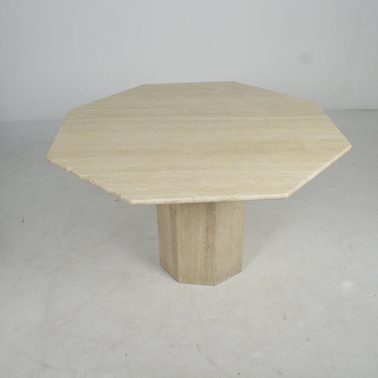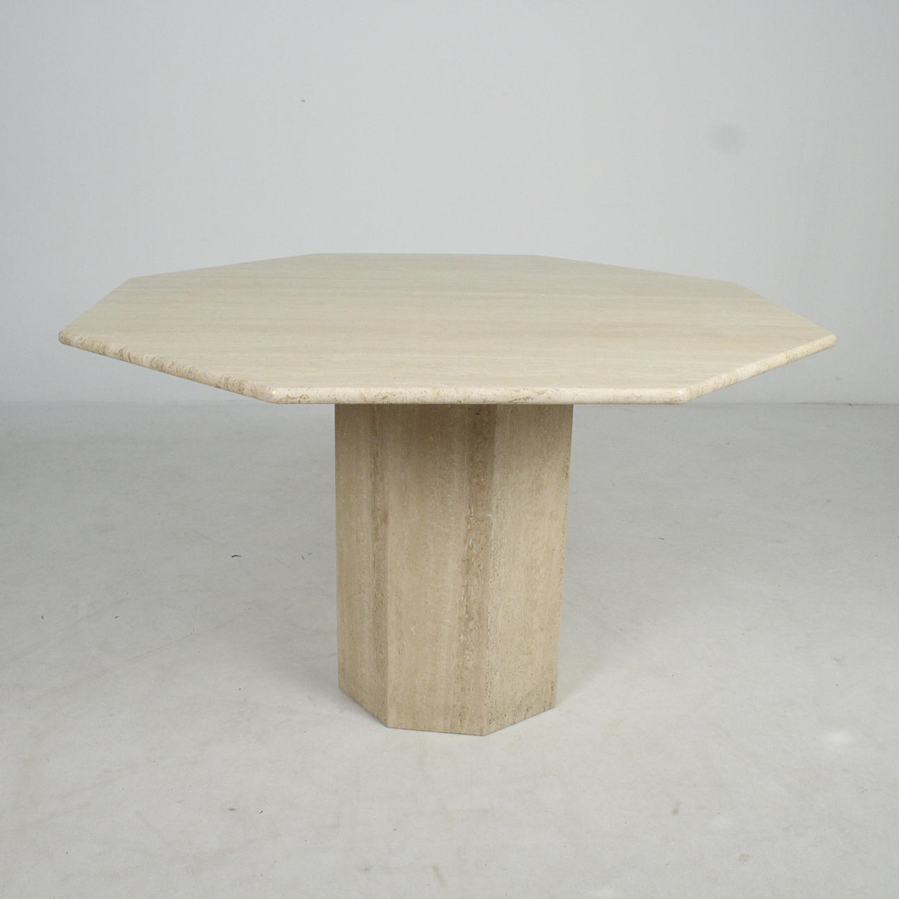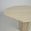 Travertiini ruokapöytä 1980-luvulta. Kahdeksankulmainen muoto. Sekä runko että levy. Levy liimattu runkoon. Korkeus 72 cm, L. 120cm, halkaisija 120cm.