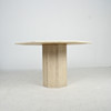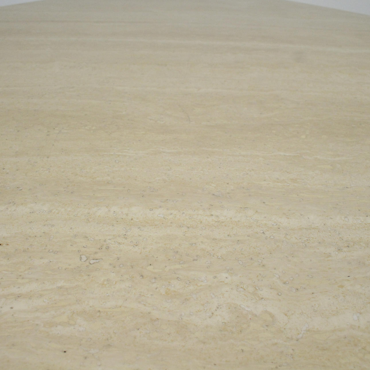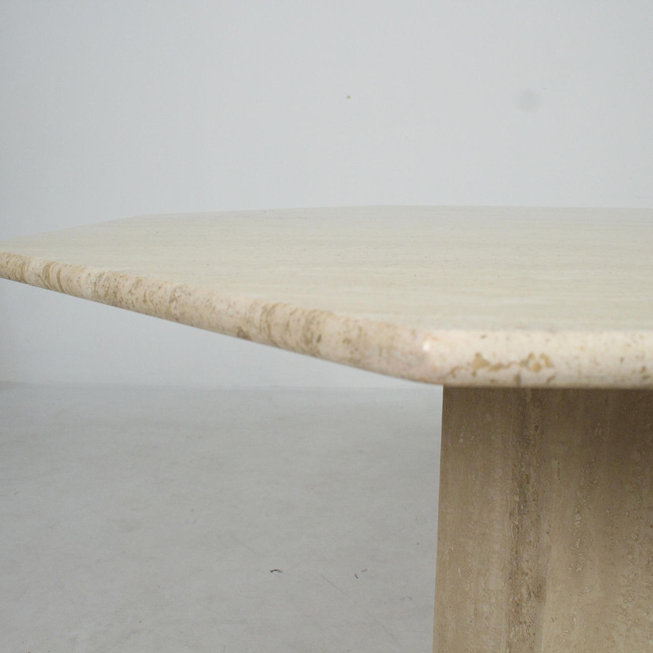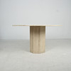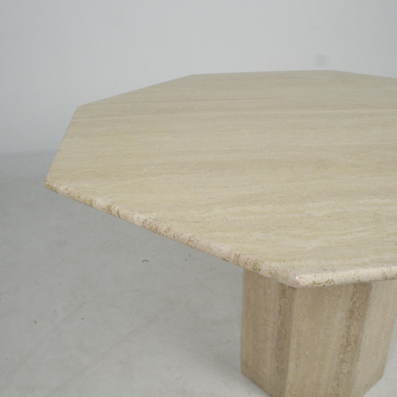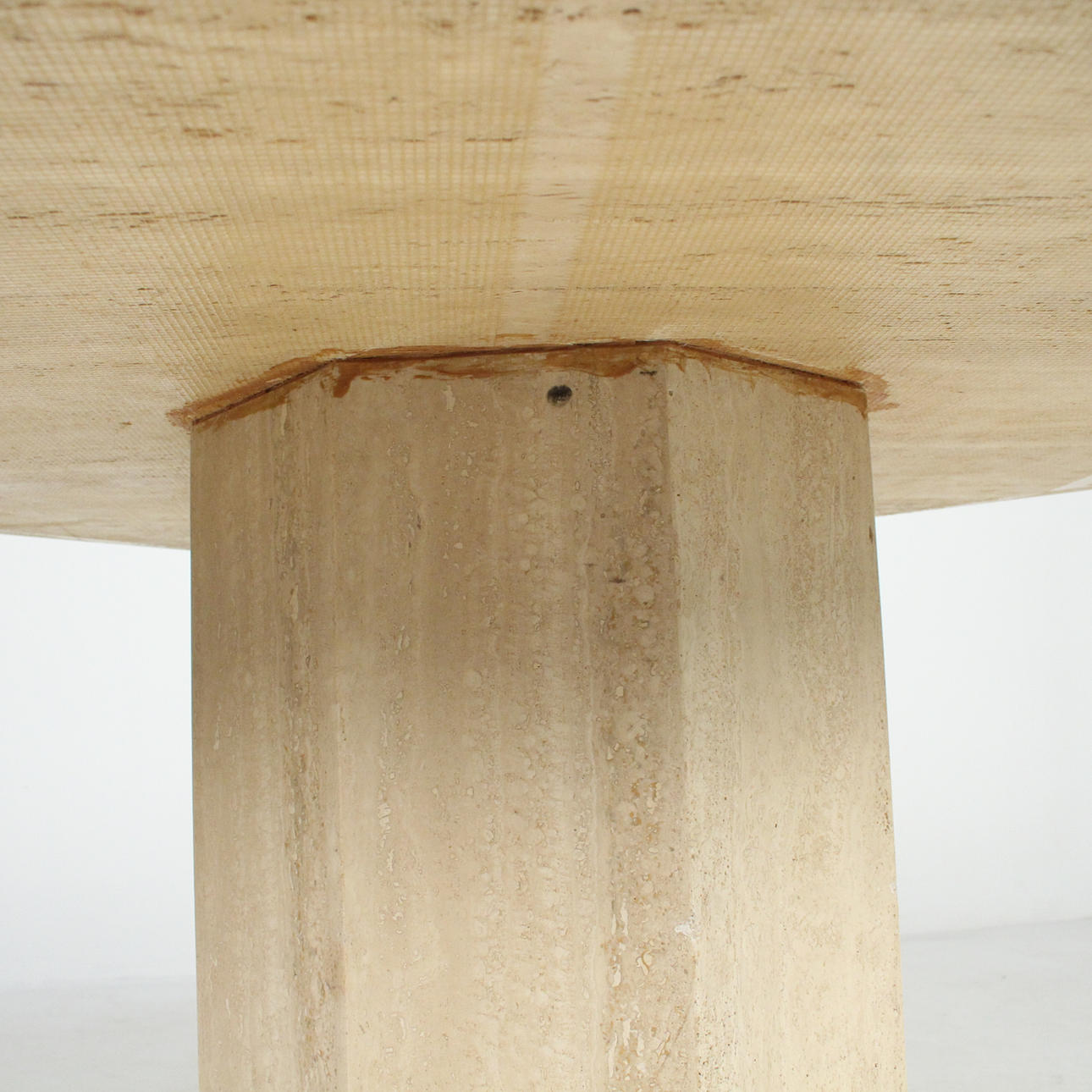 Travertiini ruokapöytä 1980-luvulta. Kahdeksankulmainen muoto. Sekä runko että levy. Levy liimattu runkoon. Korkeus 72 cm, L. 120cm, halkaisija 120cm.