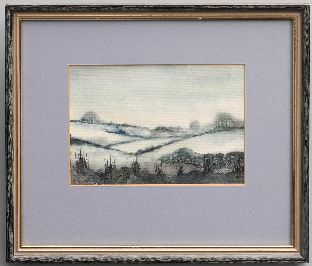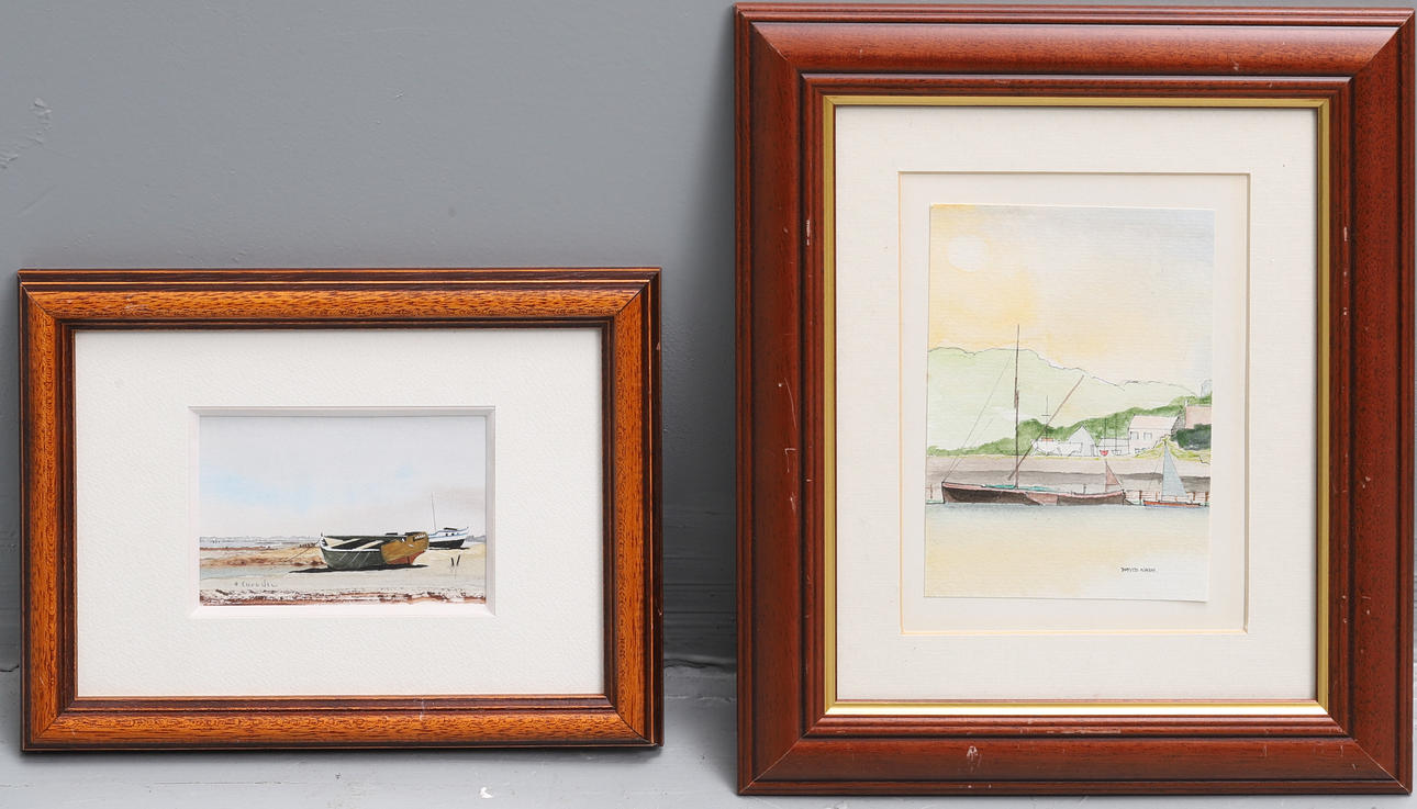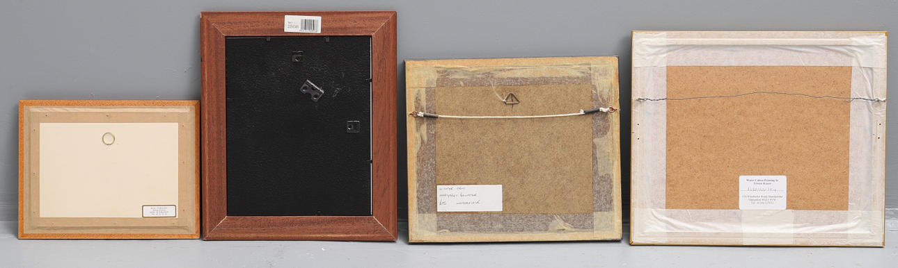signeerattu, vesiväri, asennettu ja kehystetty, 29 x 34 cm haalari, kaiverrettu tarraversioon, Margaret Bowater - Winter View, signeerattu, vesiväri, asennettu ja kehystetty, 25,5 x 29,5 cm haalari, kaiverrettu tarraversioon, Henri Caradec - Veneet sidottuina up, signeerattu, vesiväri, asennettu ja kehystetty, haalari 20 x 25 cm, ja David Nash - Veneet laiturilla, signeerattu, vesiväri, asennettu ja kehystetty, haalari 32 x 27 cm (4).