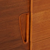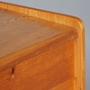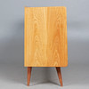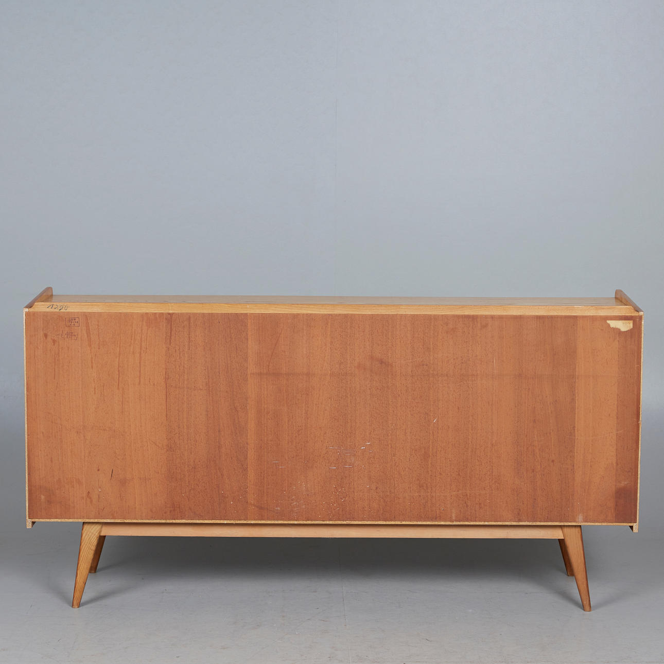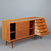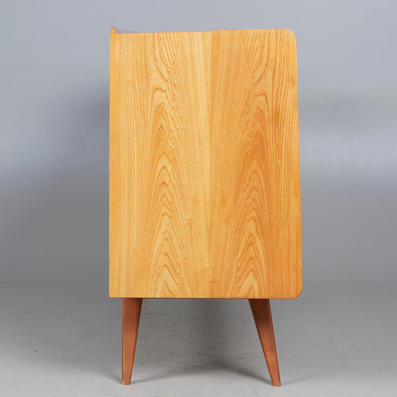 Senkki / lipasto, saarni, tiikki. Laatikon muotoinen saarnisekki, jossa pyöristetyt kulmat, viisi laatikkoa oikealla ja kaksi liukuovea kahdella hyllyllä, sisäpuoli tiikkipuusta ja neljä kartiomaista ja jäykistettyä jalkaa, K.92cm, L.180cm, D.48cm.