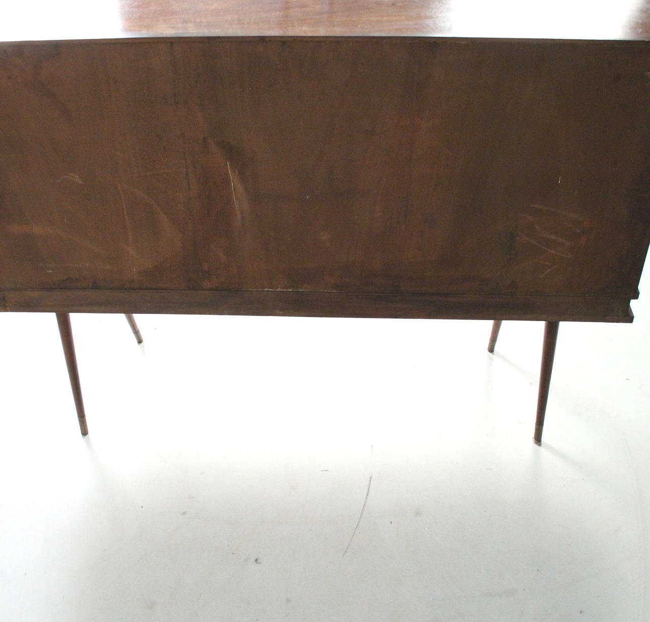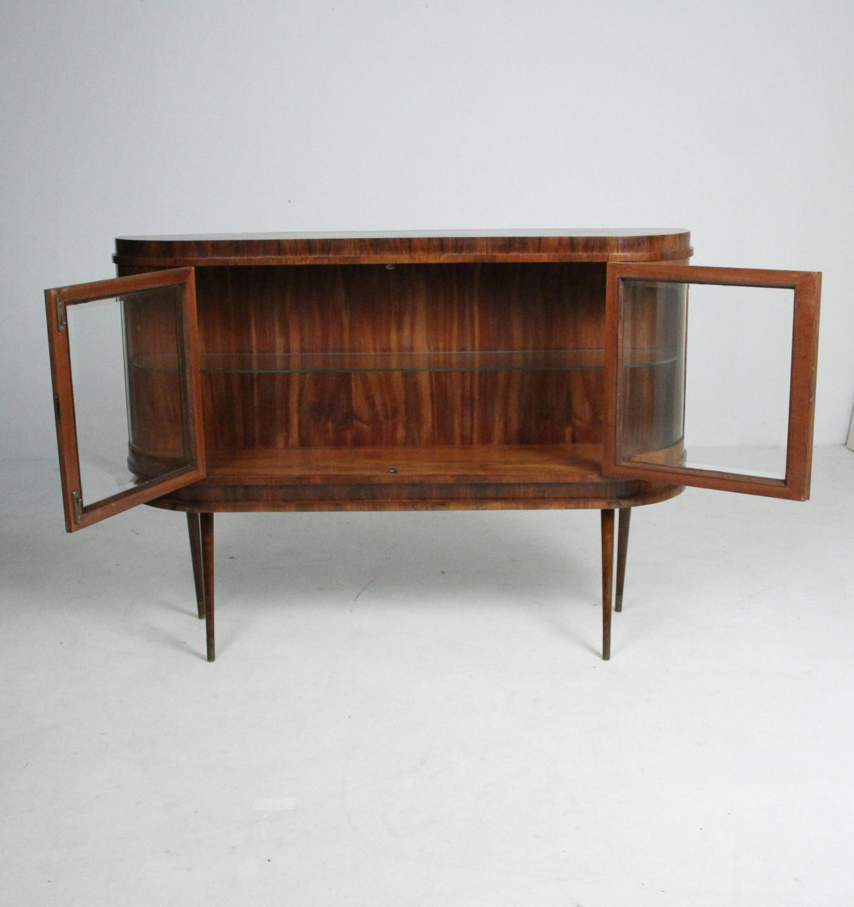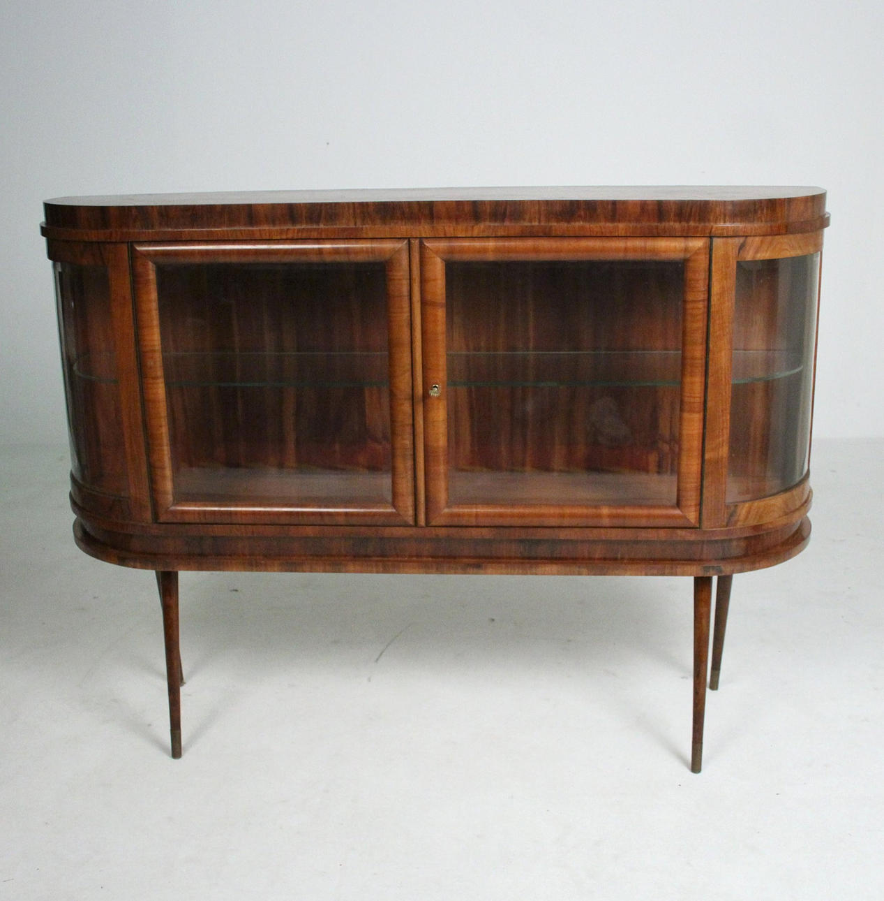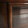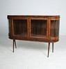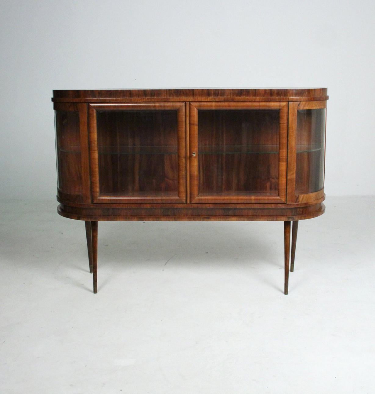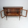 Materiaali: Kirkas lakattu pähkinä, messinki, lasi Mitat: K: 101 cm, L: 140 cm, S: 37 cm.