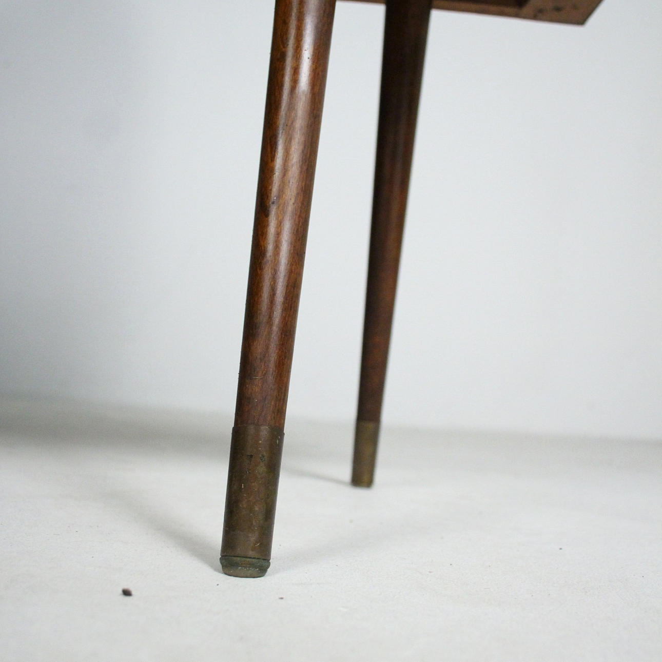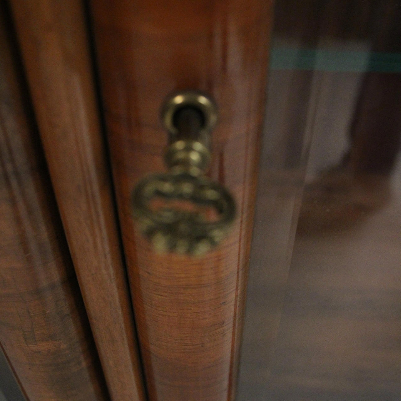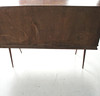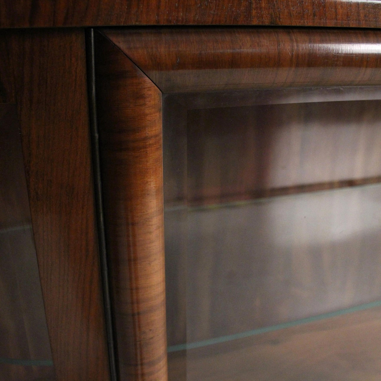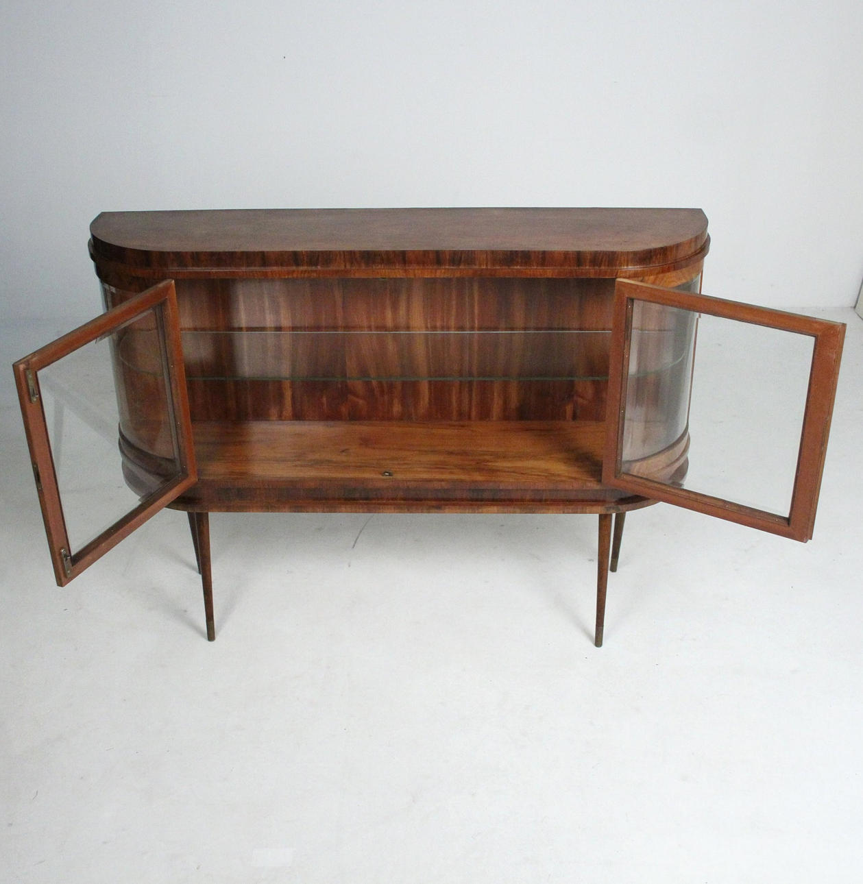 Materiaali: Kirkas lakattu pähkinä, messinki, lasi Mitat: K: 101 cm, L: 140 cm, S: 37 cm.