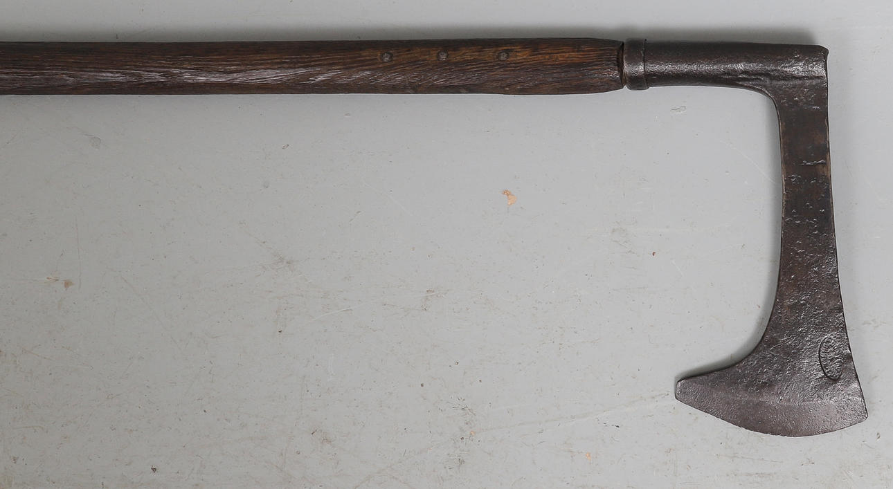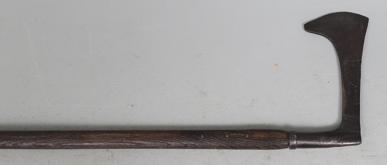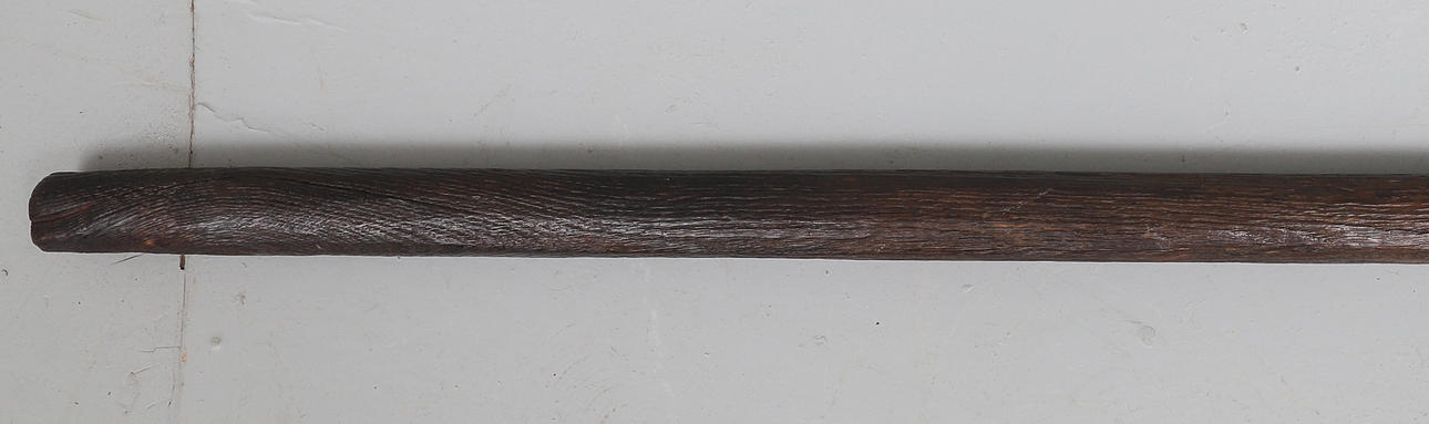 puinen, rakeinen, osittain nastoitettu varsi, kuilusta irrotettava parrakirveenpää, 114cm korkea.