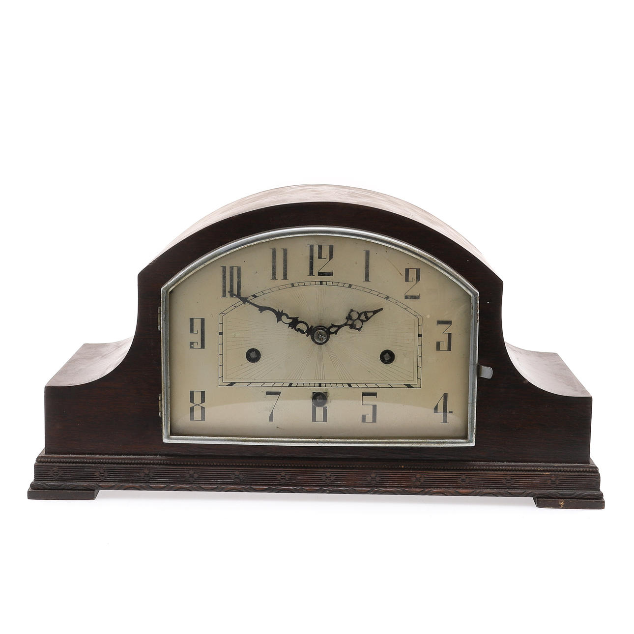 kaarevassa tummassa tahratussa kotelossa hopeoitu kellotaulu arabialaisilla numeroilla, kolmella junaäänellä, 40cm x 15cm x 22cm korkea, avaimella.