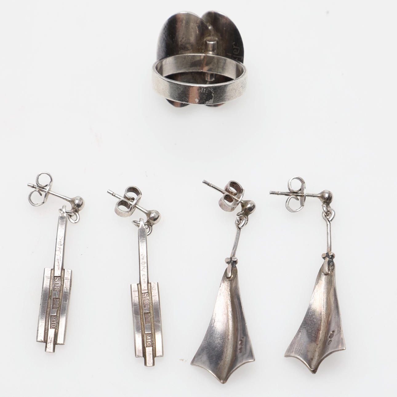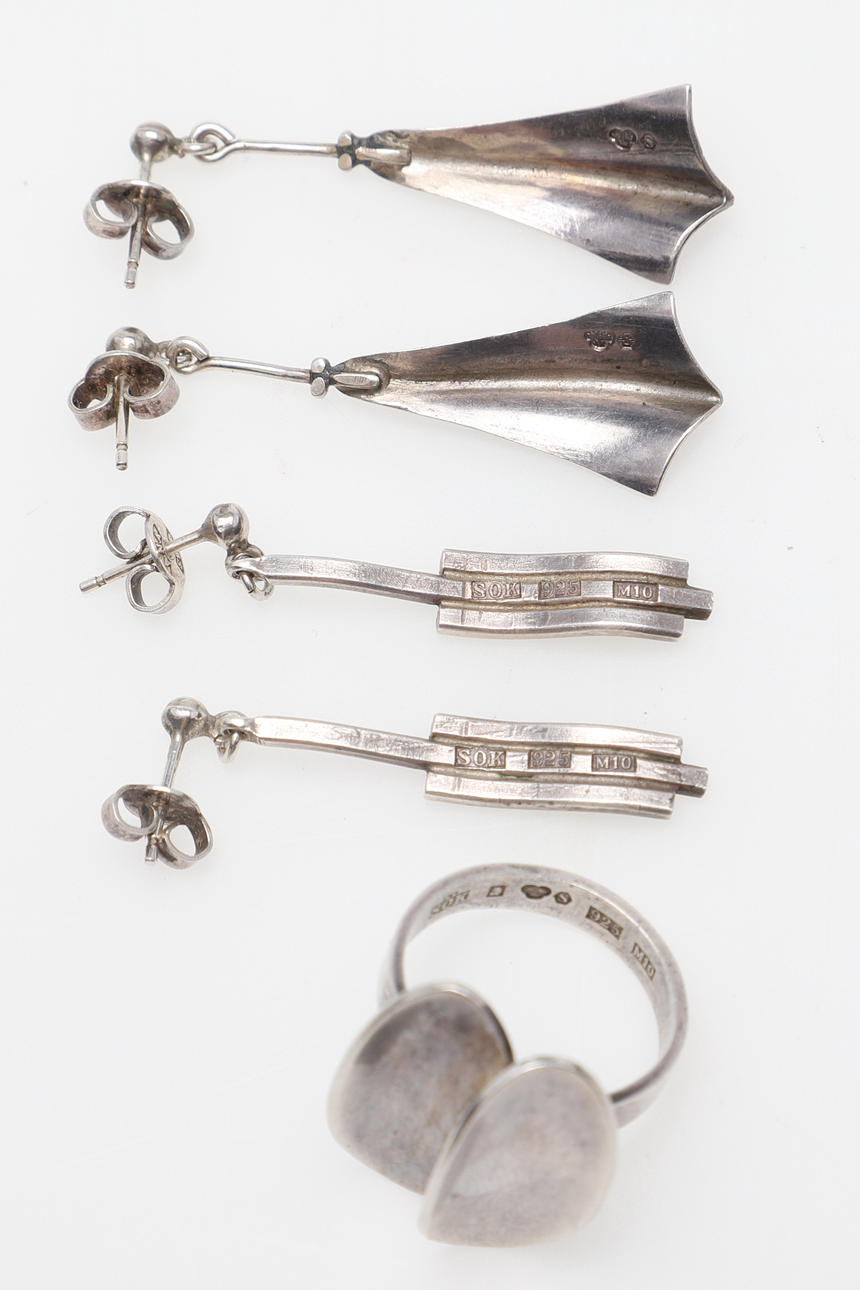 Korvakorut, 2 paria, pari Stina Sökjer-Peters, n. 39 & 42 mm pitkät. Sormus, Stina Sökjer-Peters, koko n. 17,25/54,5. Paino noin 14,6 grammaa.
