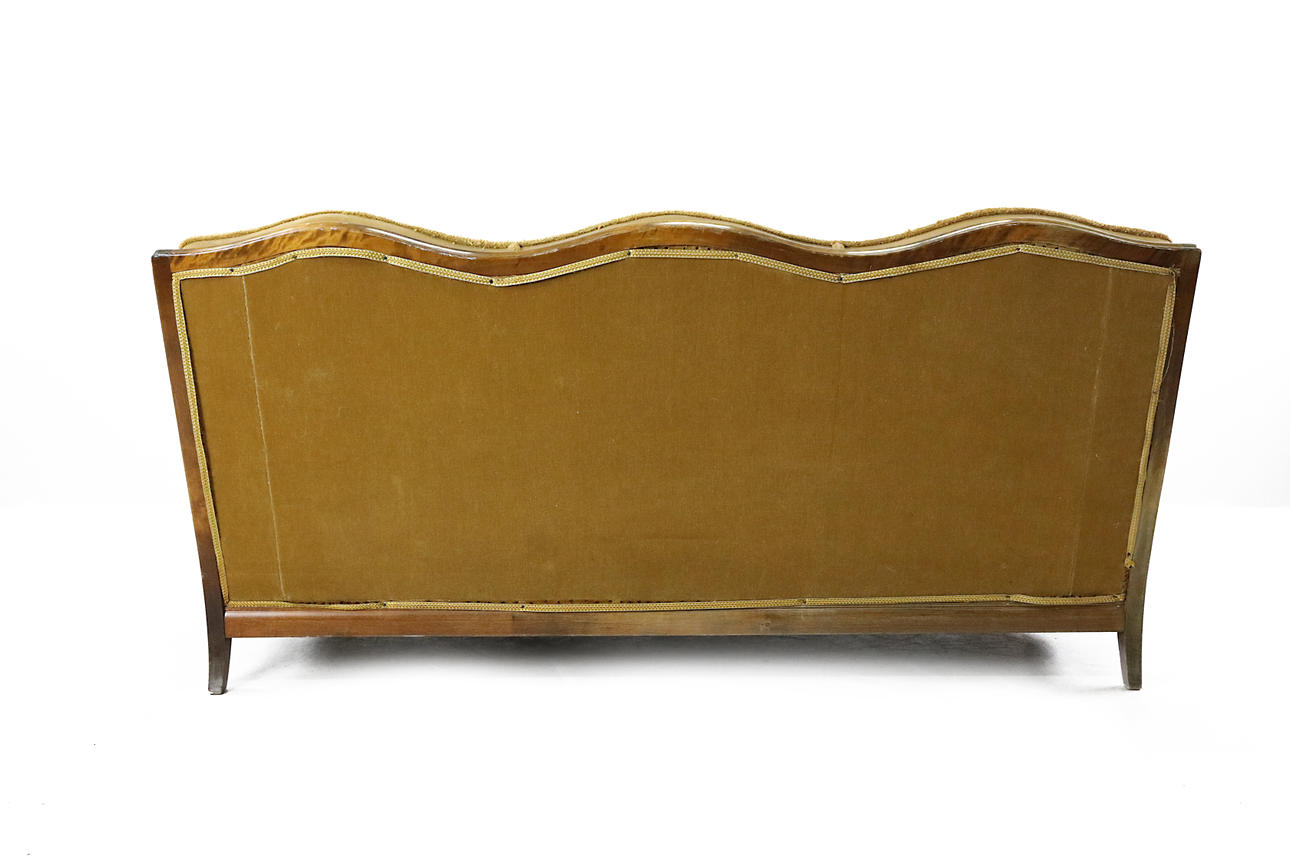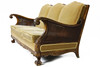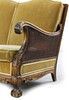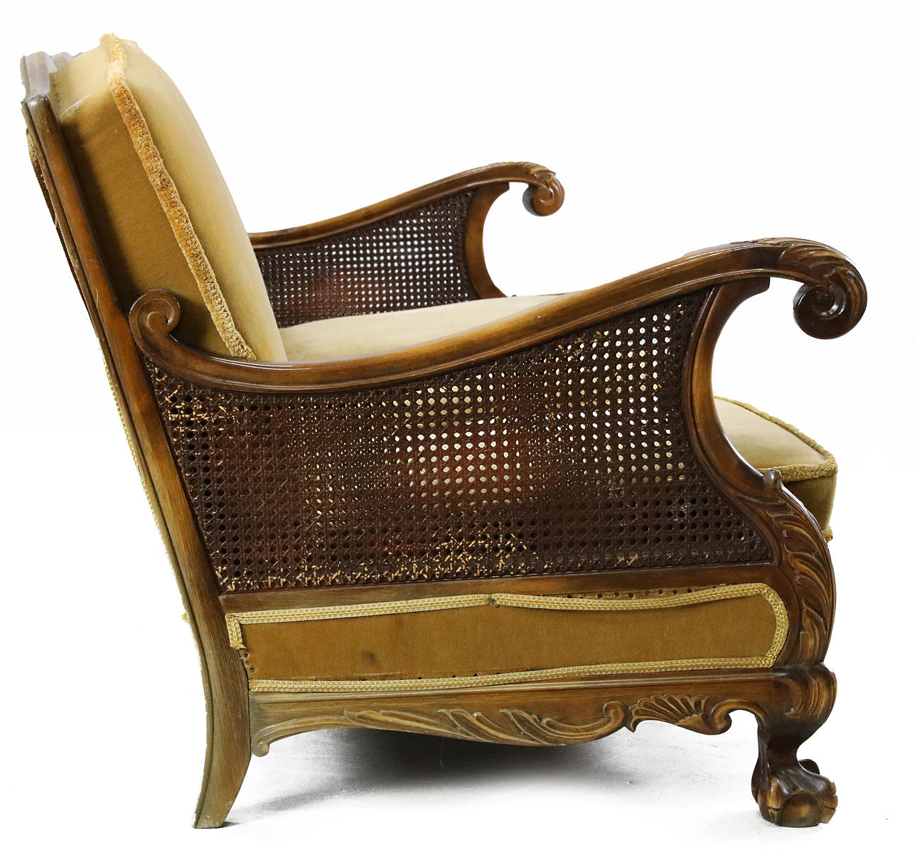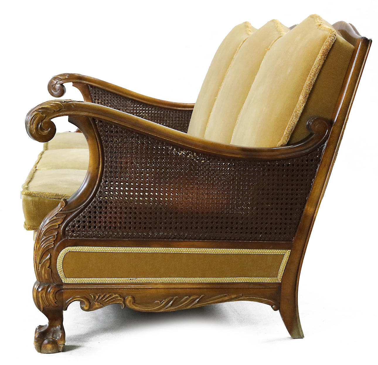Kiinteä pehmustettu verhoilu selässä, löysät istuintyynyt. Runsasleikattu koriste rungossa, rottinki kädenteitä pitkin.