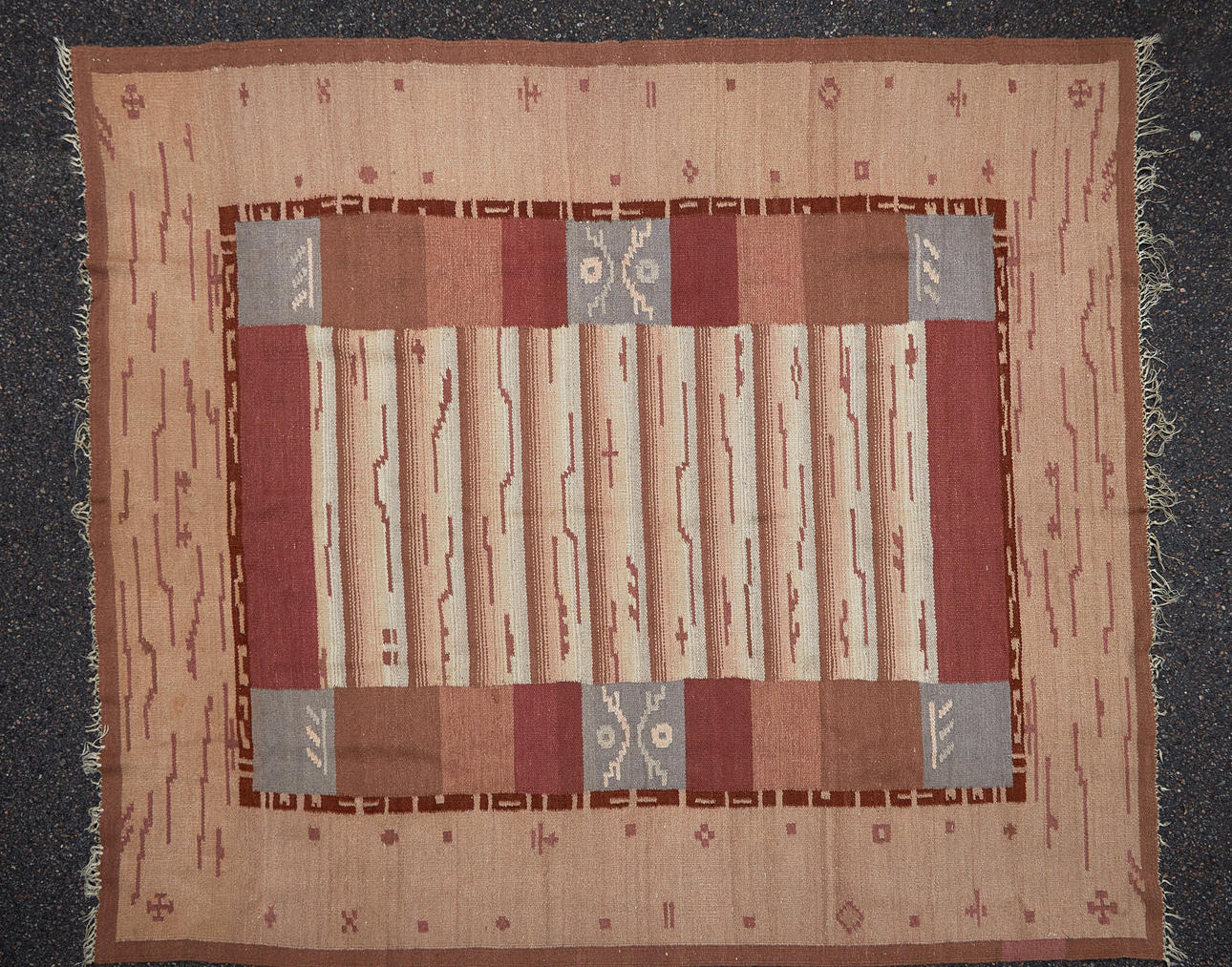 Geometrinen kuvio, ruskea, punainen ja harmaa. 243x315 cm.