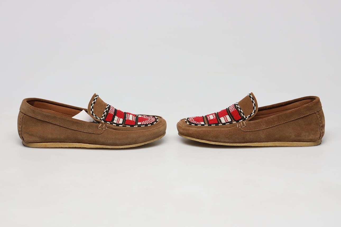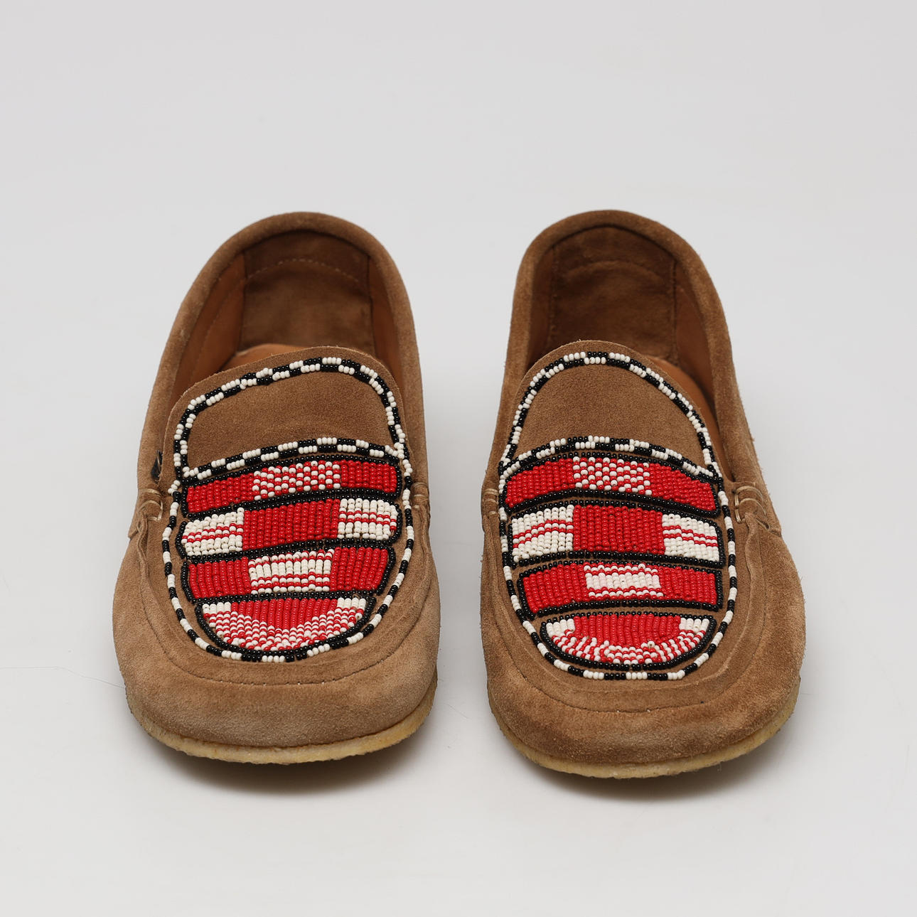 Loaferit beigeä mokkanahkaa, jossa helmikirjonta, malli Mocassin Anaco. Ilmoitettu koko 40. Mukana tarrat ja kenkälaukku ja kenkälaatikko.