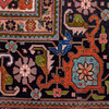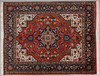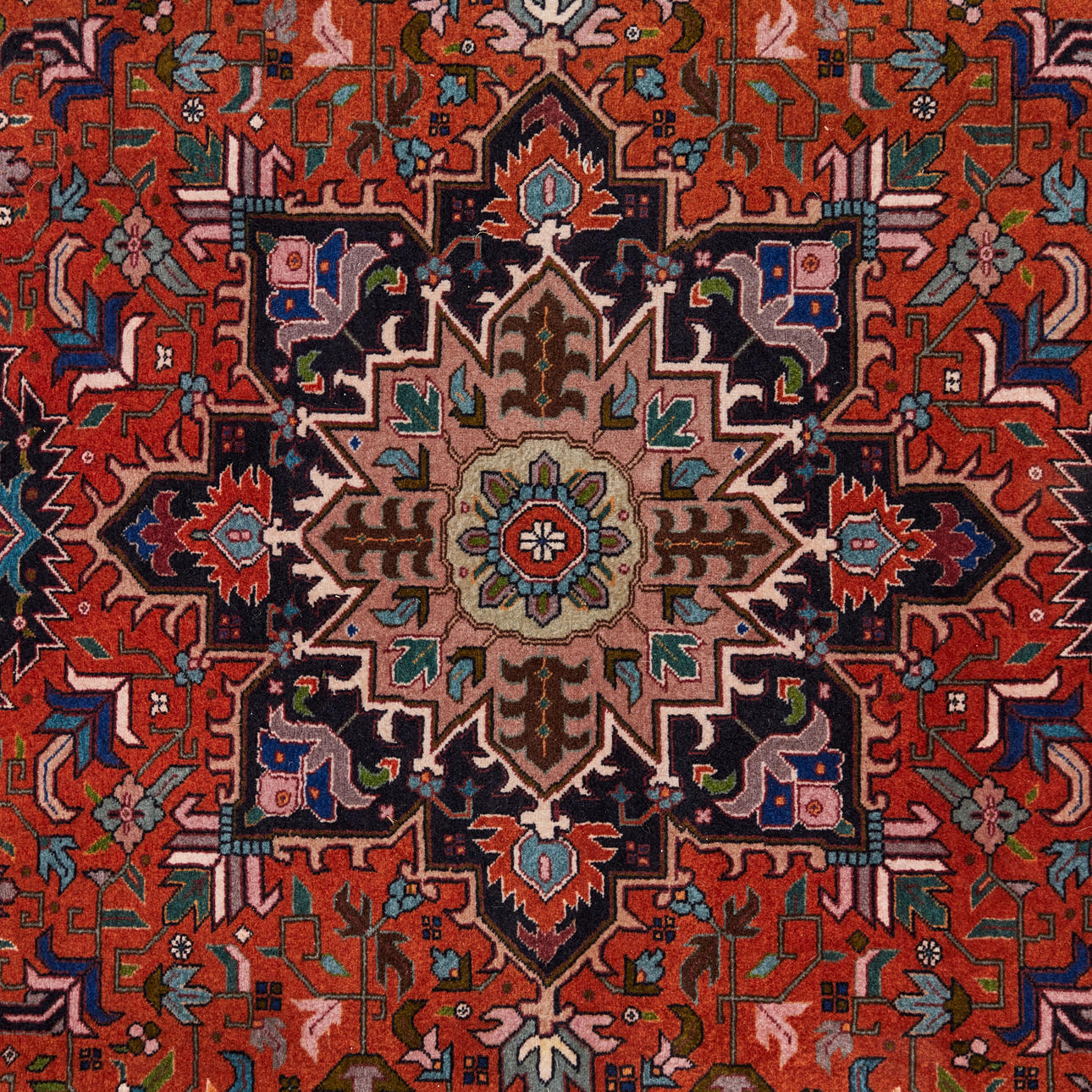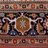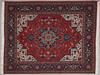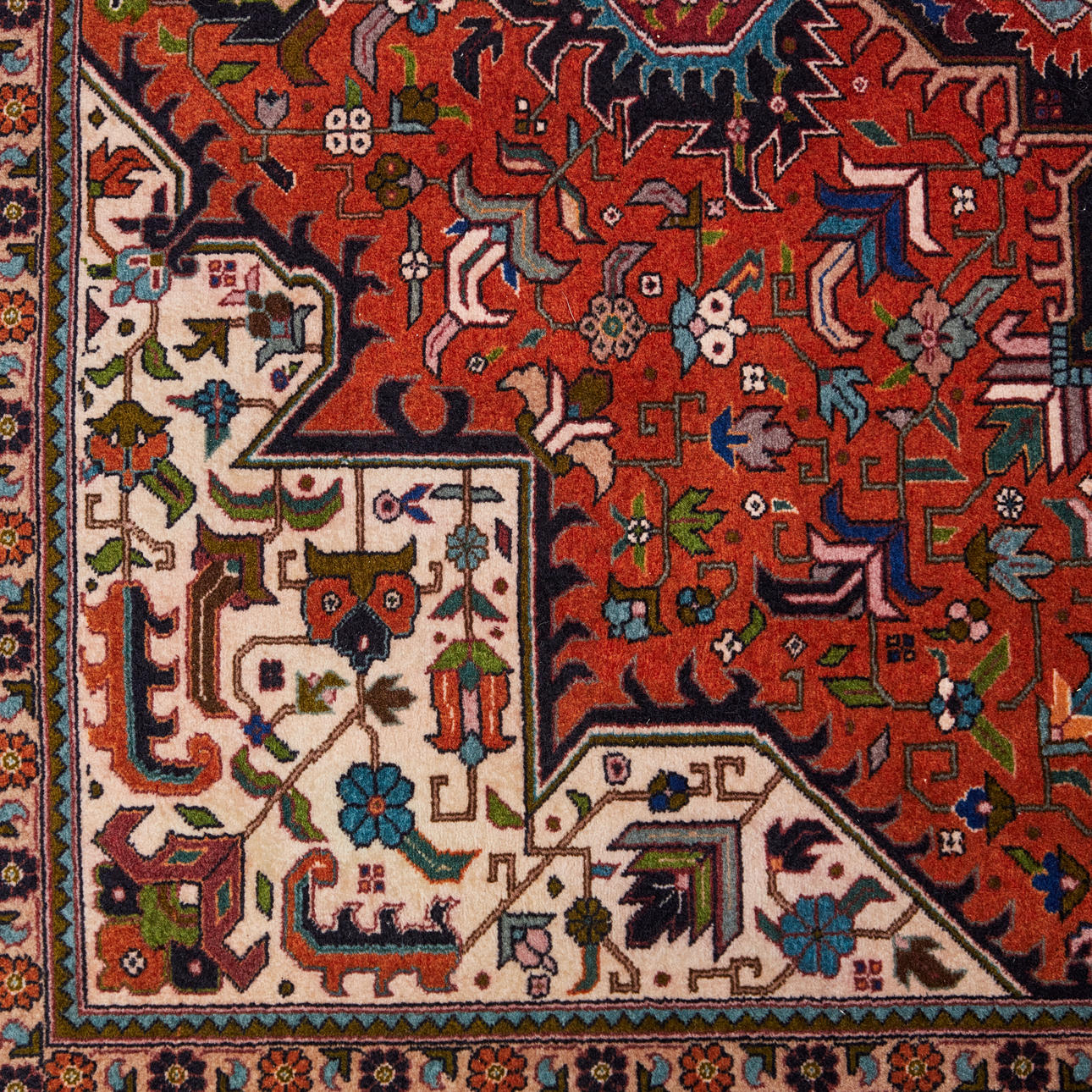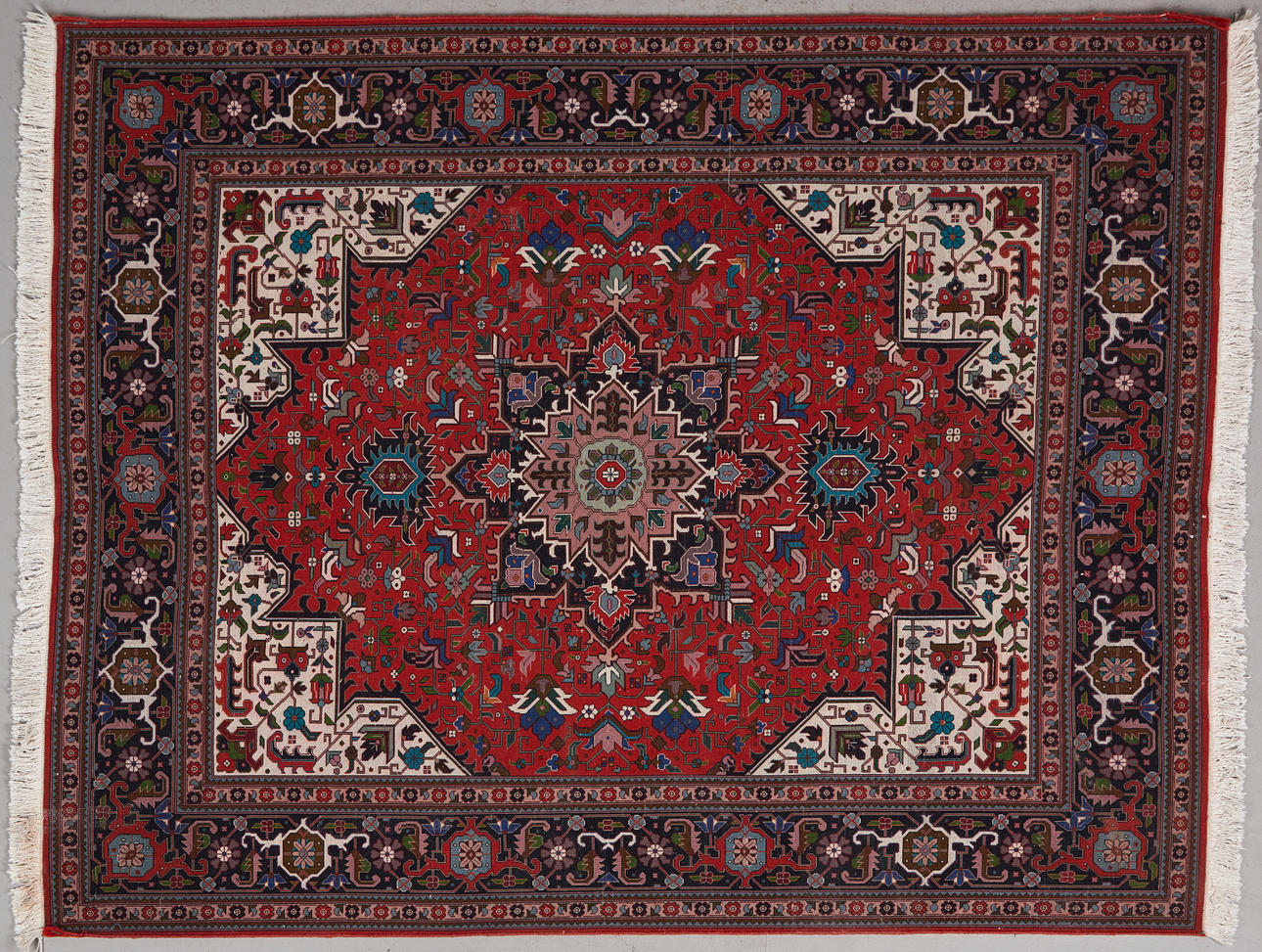 Tabriz matto / lattiamatto, villa, Iran. Villamatto, jossa monivärinen koristelu punaisella taustalla tyylitelty kukkakoristeita kuvaava, mustalla taustalla ympäröity reunus, keskellä cartussi ja sivuilla valkoiset hapsut, 190x150cm.