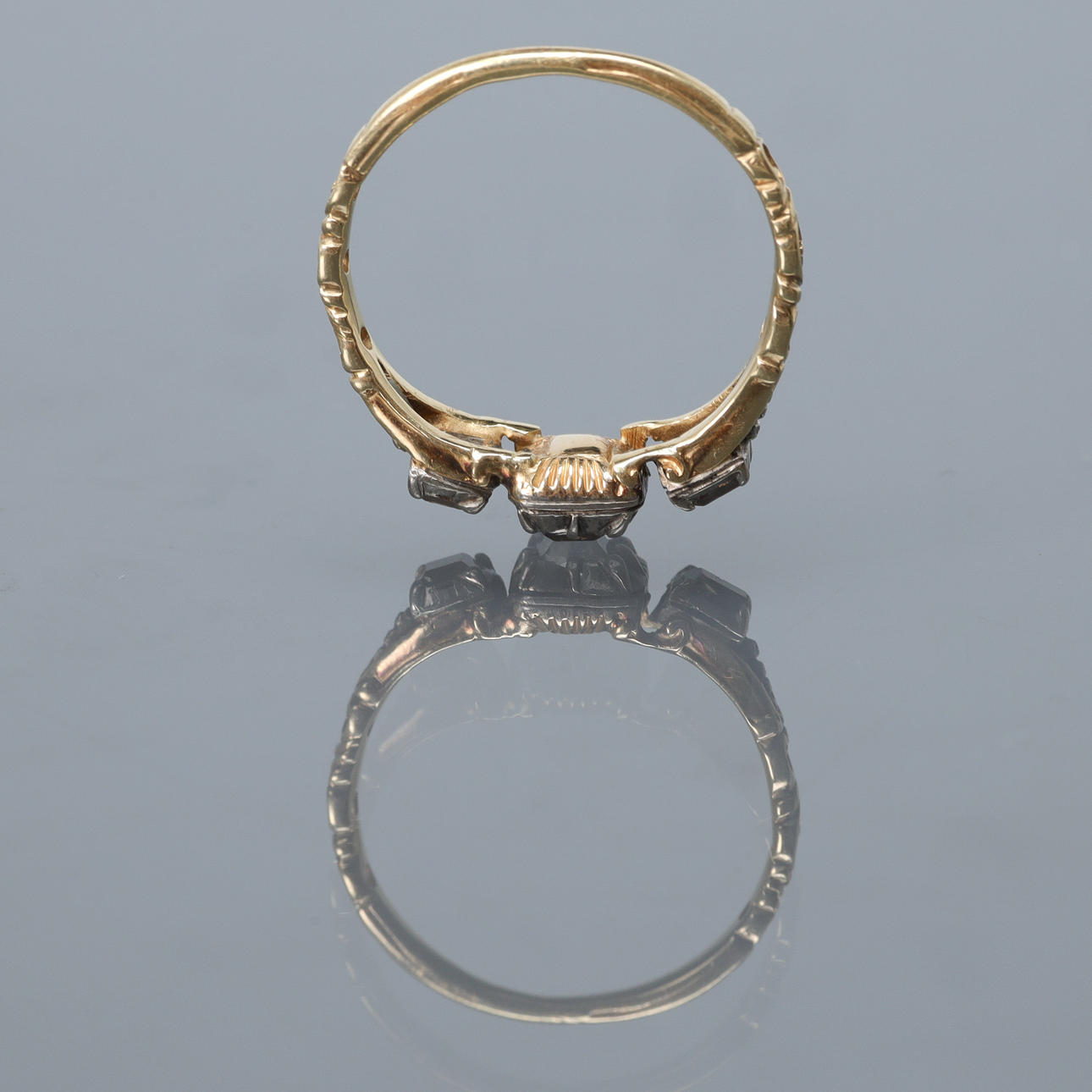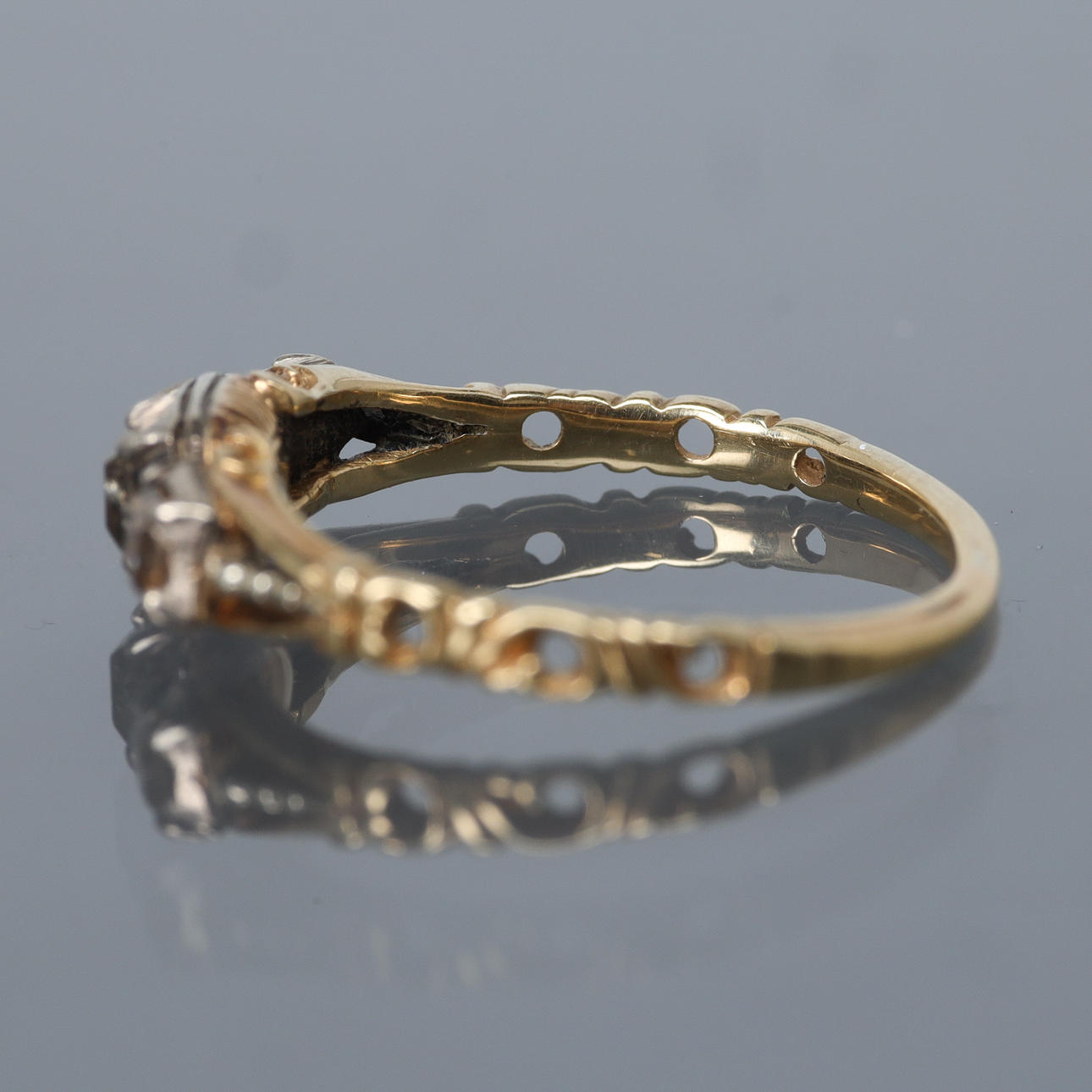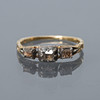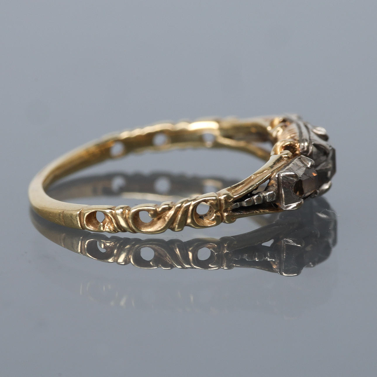 1800-luvun puoliväli/toinen puolisko. Sormus 3 sarjalla ruskeita timantteja, P2. Sormuksen koko noin 53 (17 mm). Paino noin 2,6 grammaa.