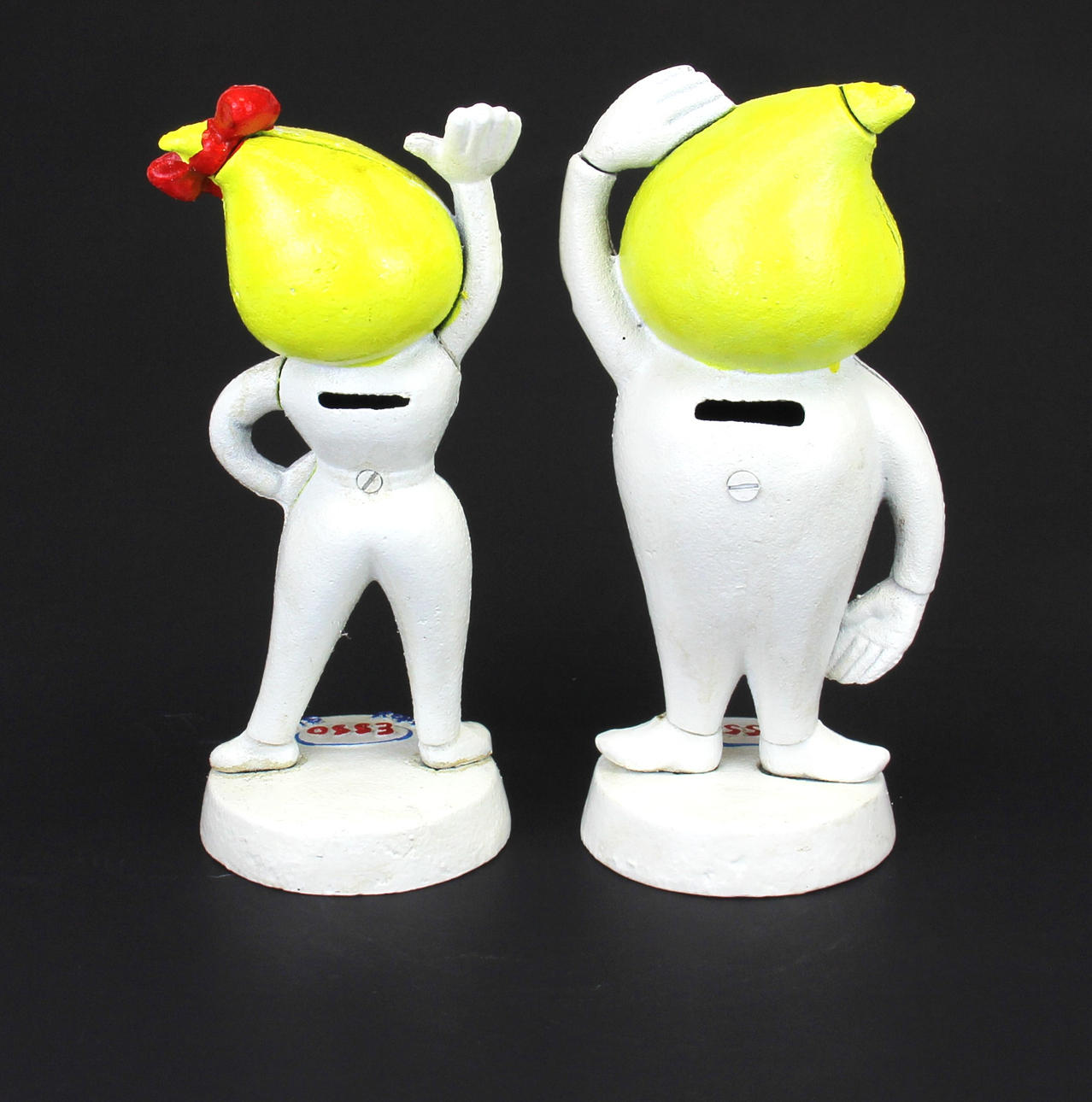 Pari valurautaista Esso-mainosrasiaa Abby ja Andy Slick, H, 23,5 cm.