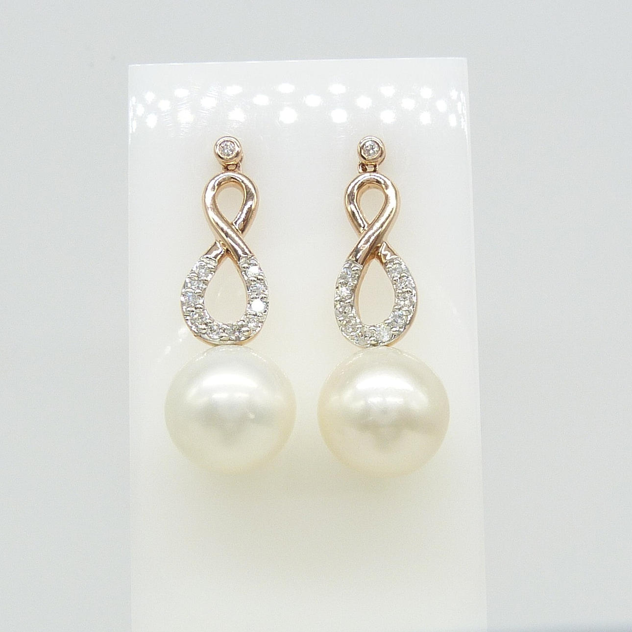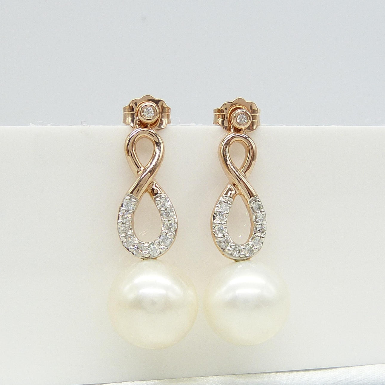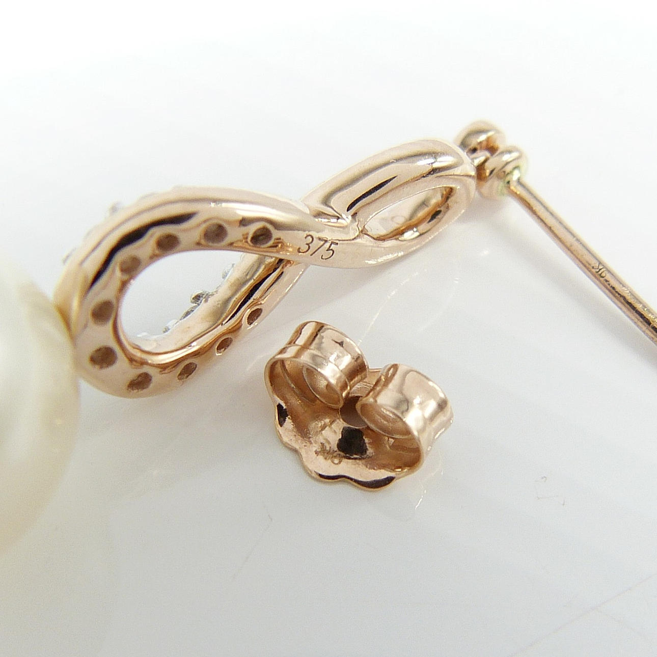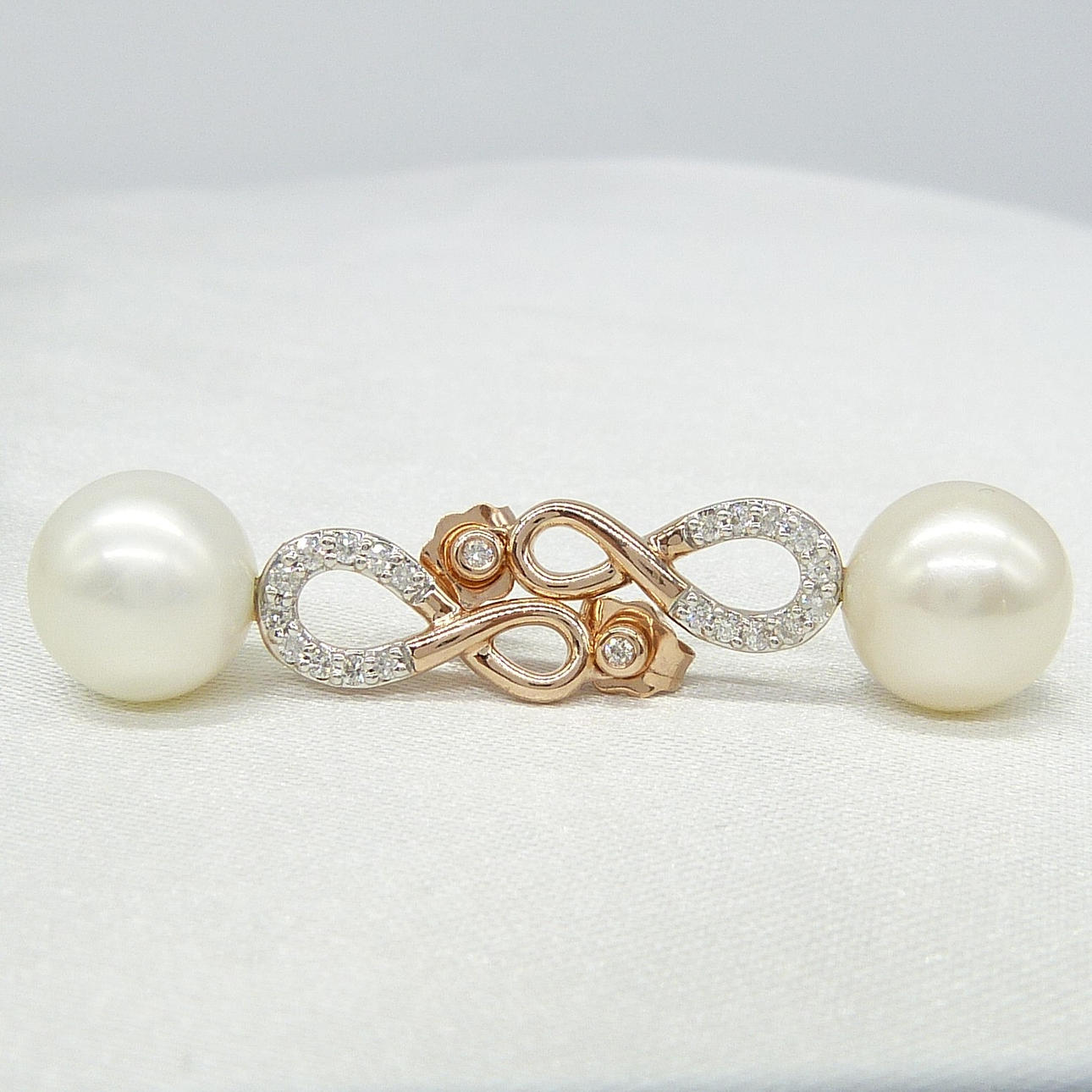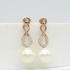 Tyylikäs ruusukulta-korvakorupari, jossa on valkoisia viljeltyjä helmiä ja 0,20 karaatin timantteja, perhosselkä.