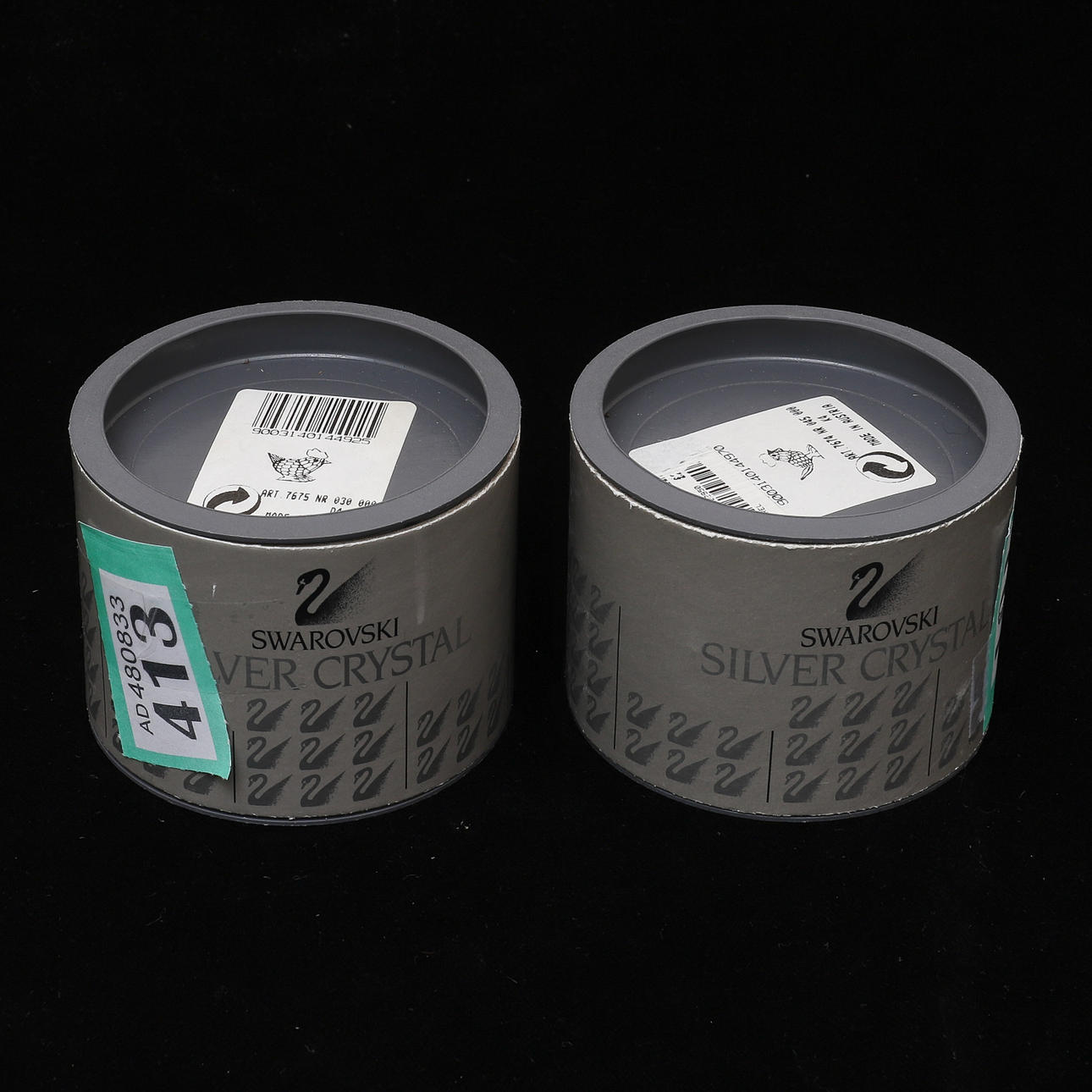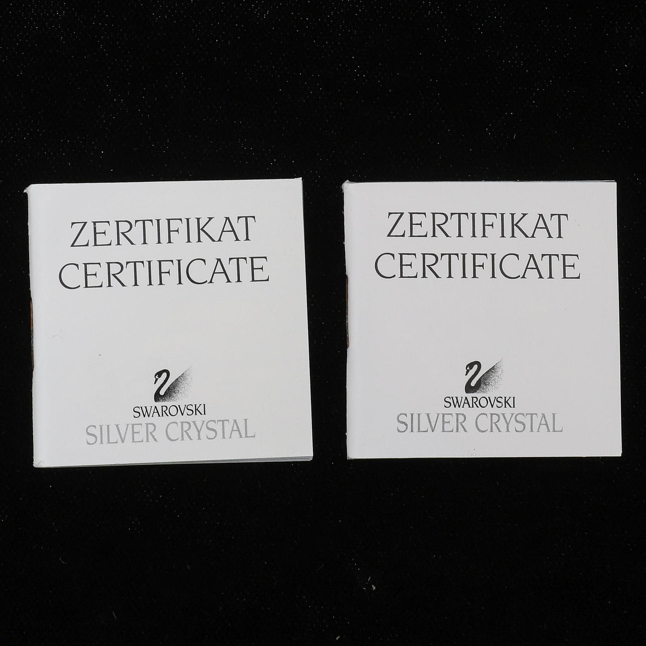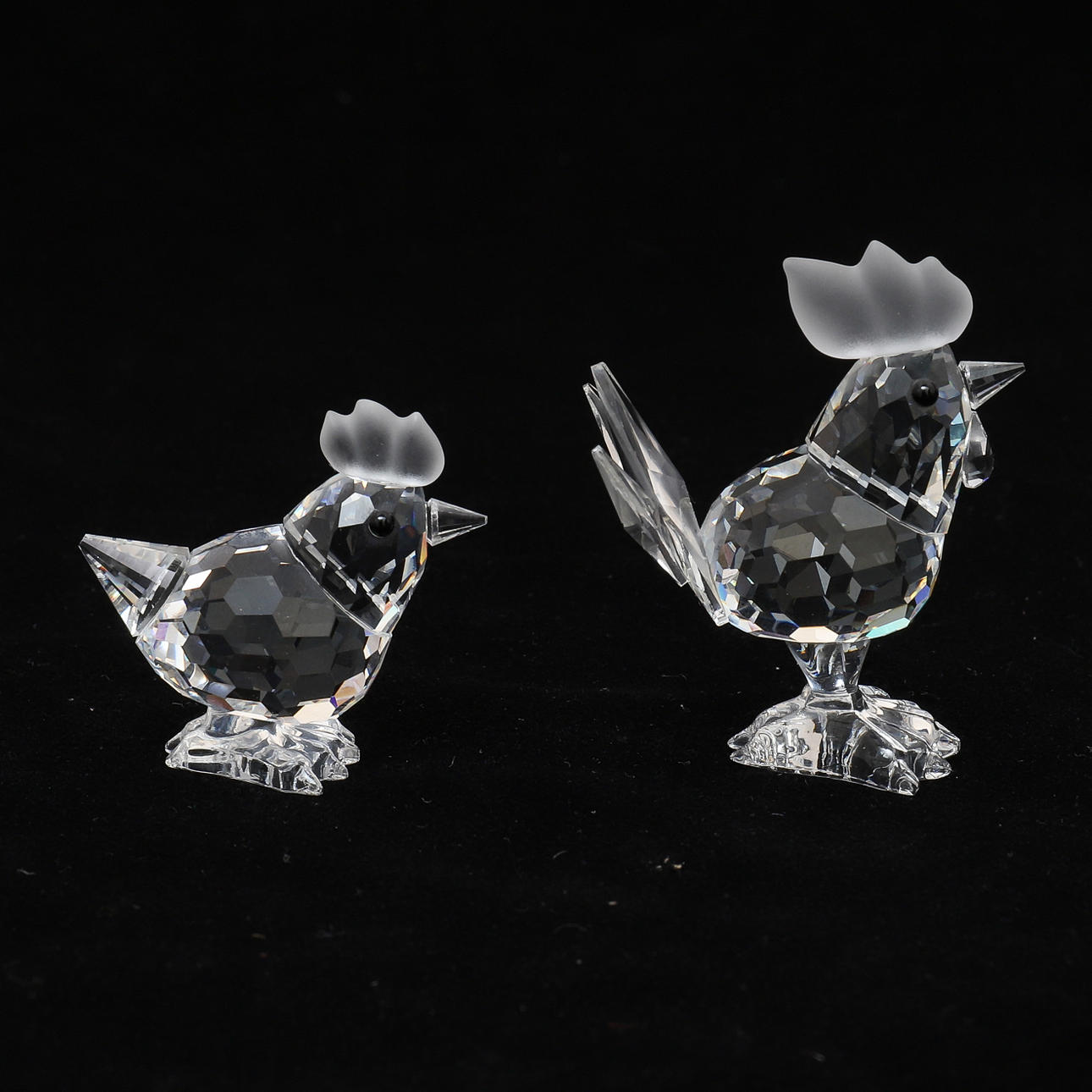 numero 7674 045 000, kirkkaassa fasetoidussa kristallissa himmeällä kruunulla ja mustilla silmillä, 4,5 cm korkea yhdessä Mini Henin kanssa, numero 7675 030 000, kirkkaassa fasetoidussa kristallissa, jossa on himmeä kruunu ja mustat silmät, 3 cm korkea, sekä sertifikaateilla että alkuperäisessä laatikot (2).