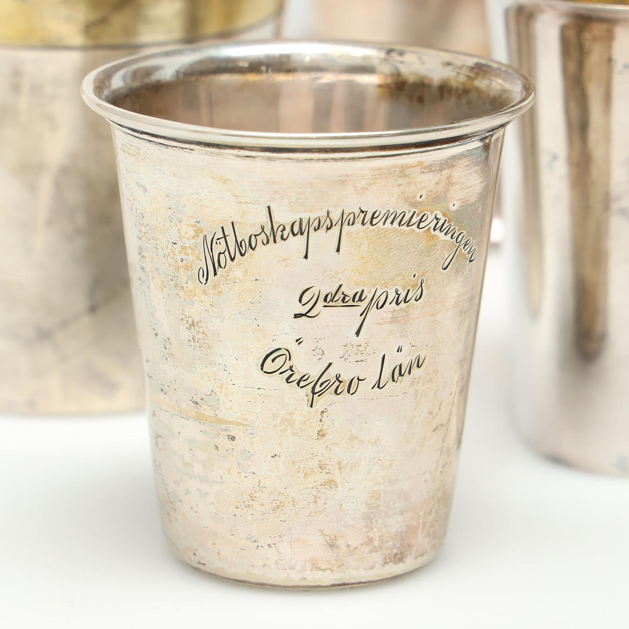 Pokal S. Drakenberg, Tukholma 1928, korkeus 18 cm Pokal Möllenborg, Tukholma 1897, korkeus 17 cm Dekantterilasi, sisältä kullattu, CGH, Tukholma 1959, korkeus 6,5 cm Dekantterilasi, puntaa, sisältä kullattu, GAB, Tukholma 1954, korkeus 7 cm Dekantterilasi 1909 , korkeus 6 cm, kokonaispaino n. 768 g.