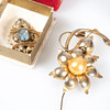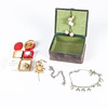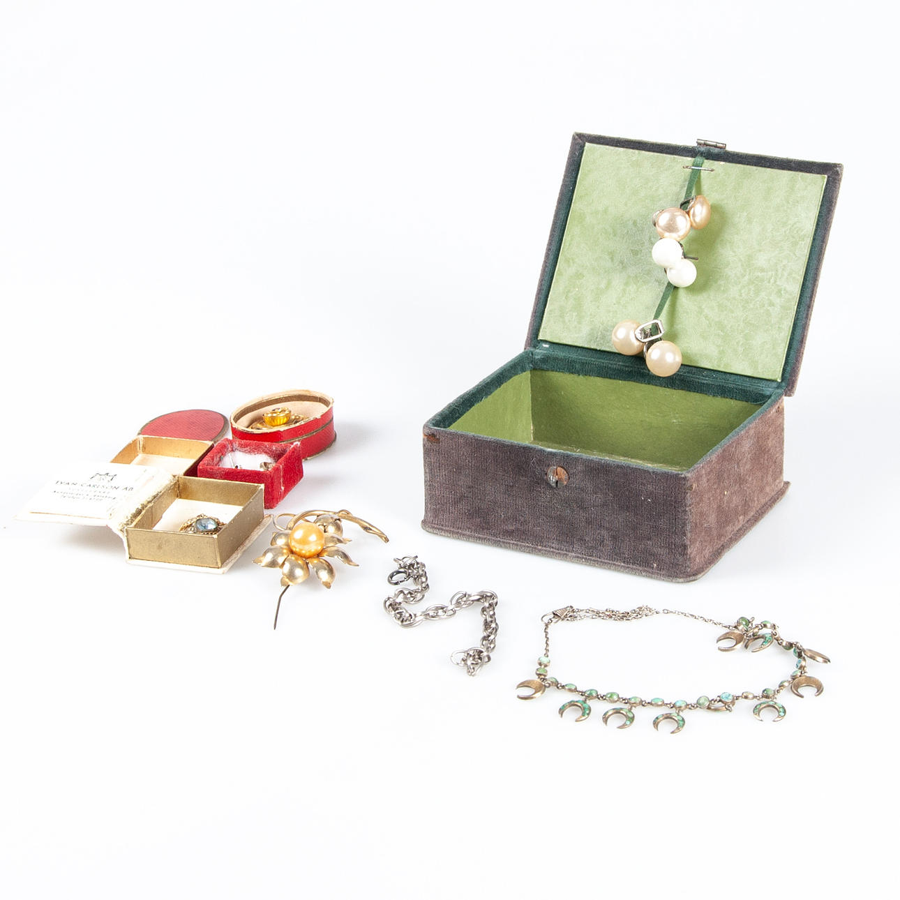 4 paria korvakoruja, joista 3 paria klipsiä 1 rannekoru, 20 cm 1 riipus ketjulla, keltaista metallia ja akvamariinia, 48 cm 1 kaulakoru, keltaista metallia ja turkoosia, 40 cm 2 rintakoruja, keltaista metallia. Yksi filigraanityössä.