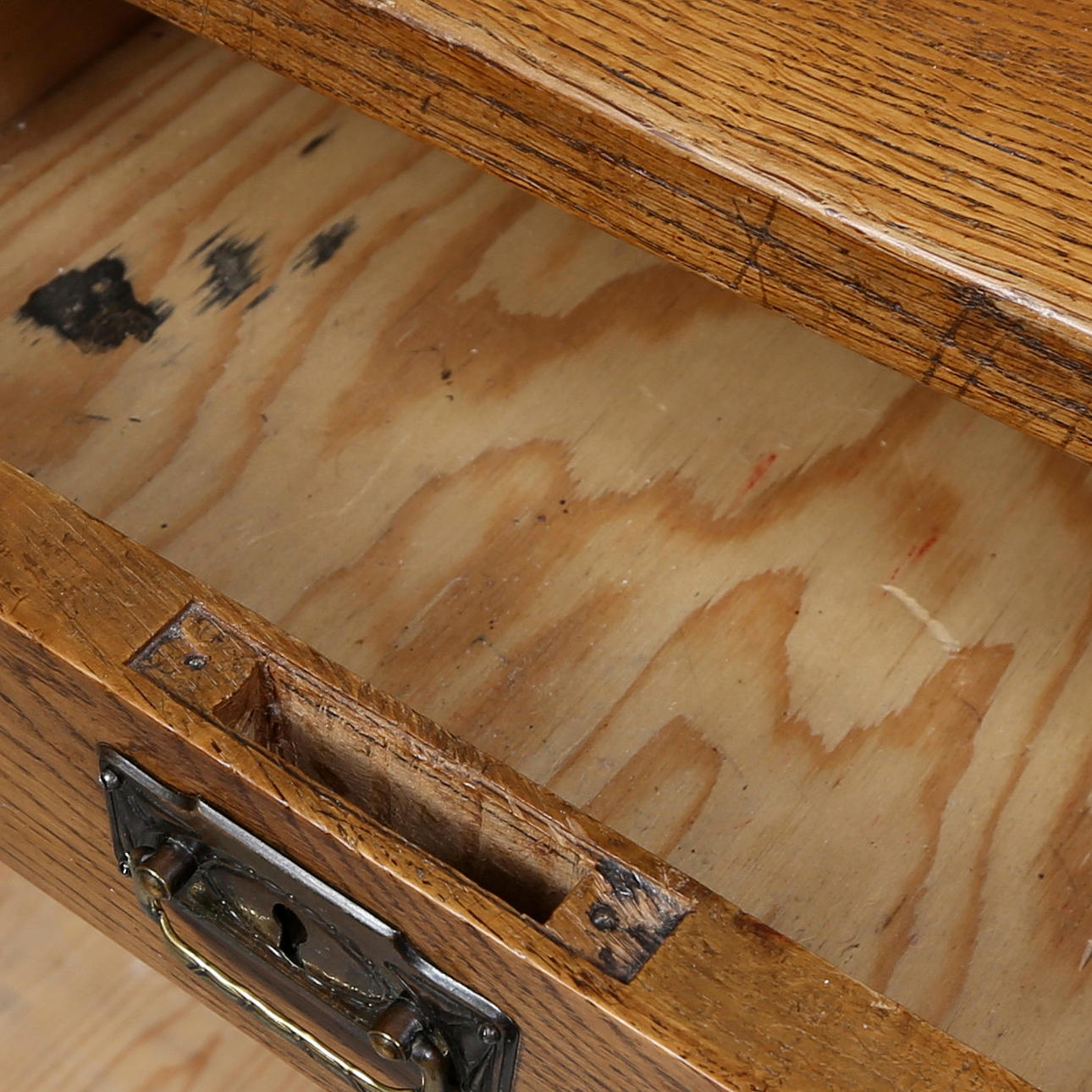 Naarmut, tahrat, halkeamat, iskujäljet, asennusreiät, puoli naulattua koukkua.