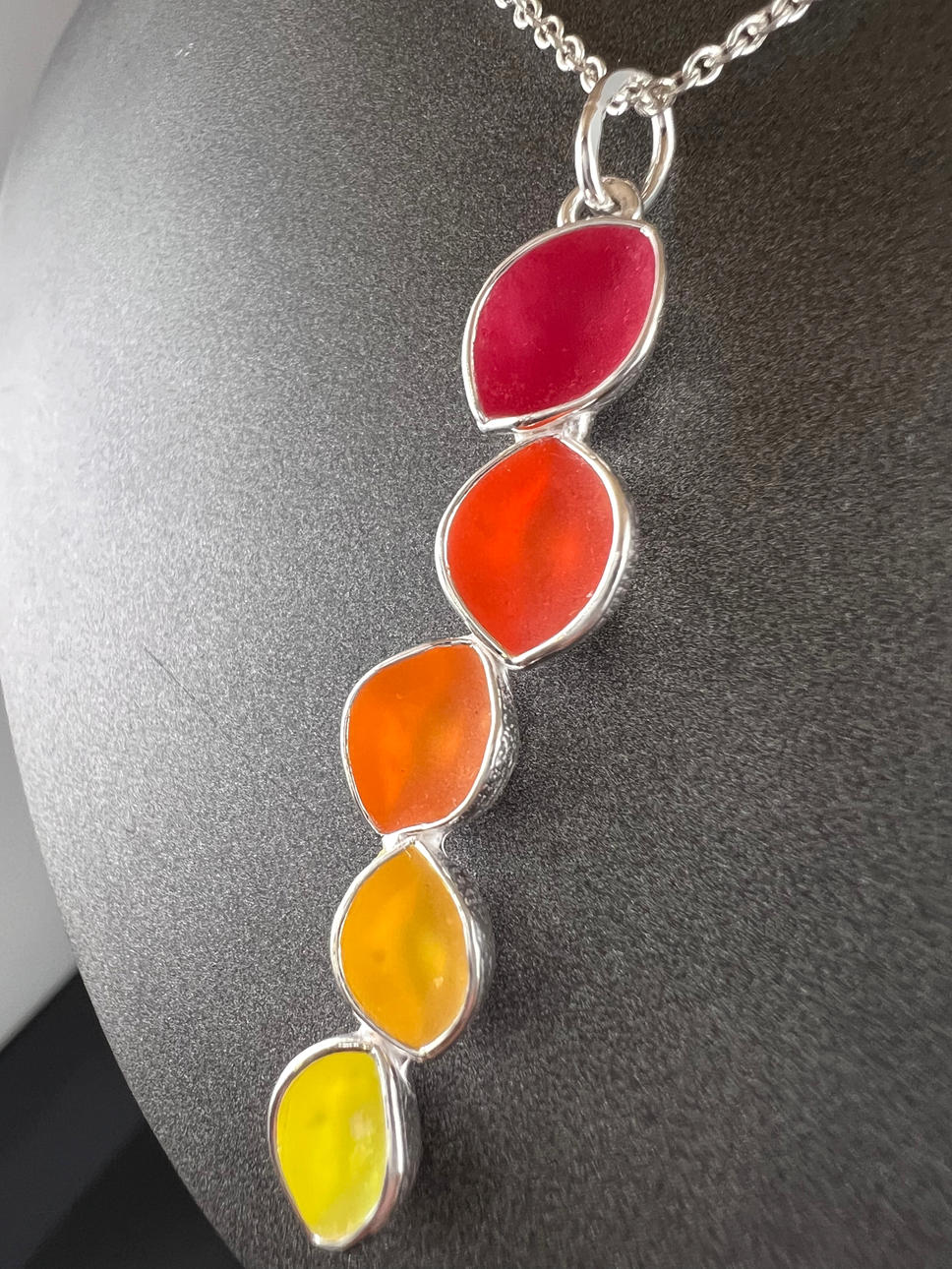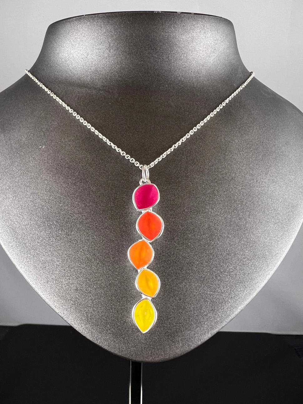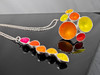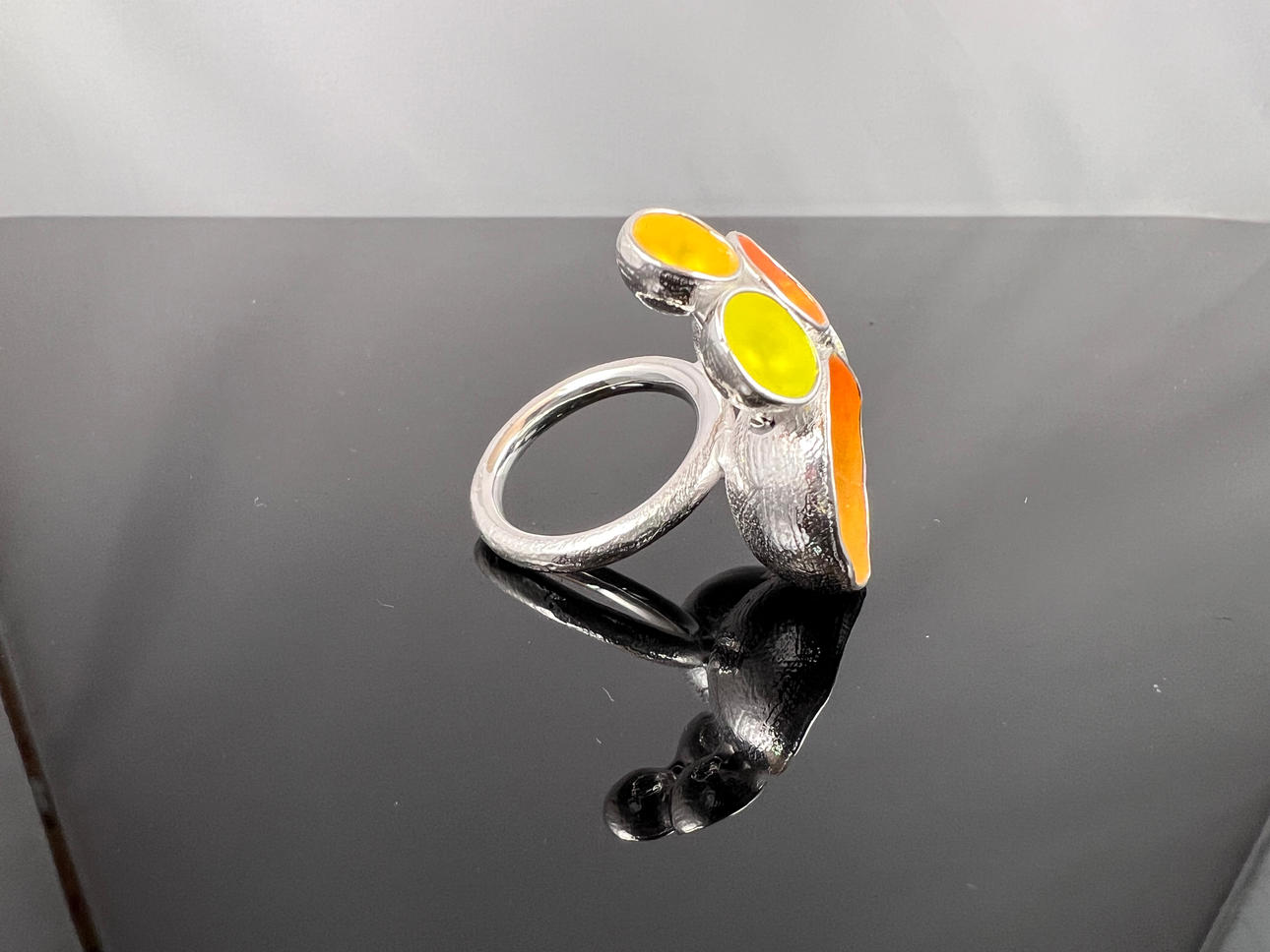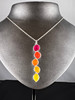 Materiaali: 925/000 hopea, emaloitu Sormus: Leveys: 56 Mitat: n. 3,5 x 3,3 cm Paino: 16,9 g Ketju: Pituus: 45 cm Riipuksen pituus: 5 cm Paino: 6,6 g.
