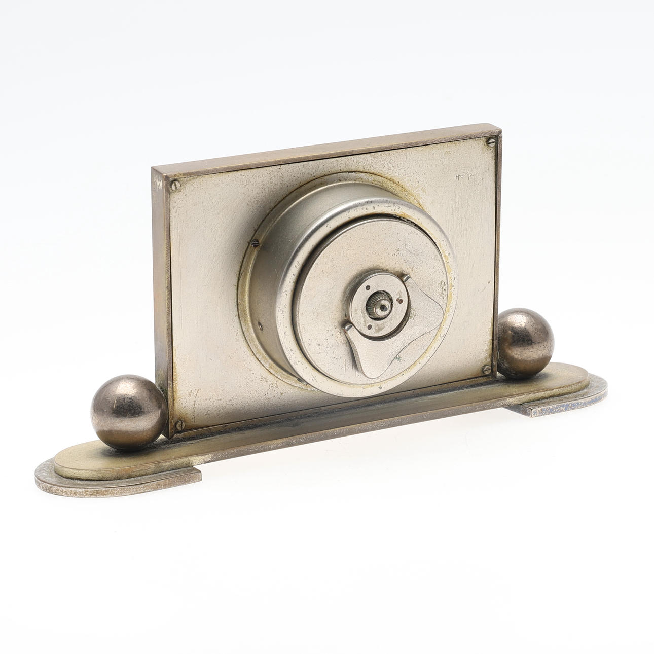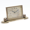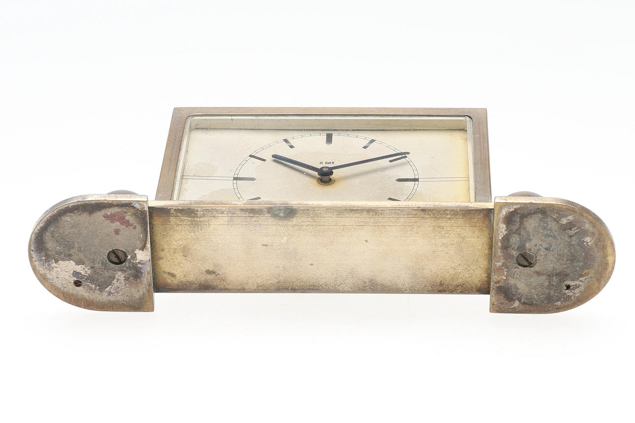 Manuaalisesti kierretty 8 päivän liike, 5,5 cm kellotaulu sauvanumeroilla, sijoitettu kiillotettuun messinkimaljakkoon porrastetulla pohjalla, 8 cm korkea x 17 cm leveä.