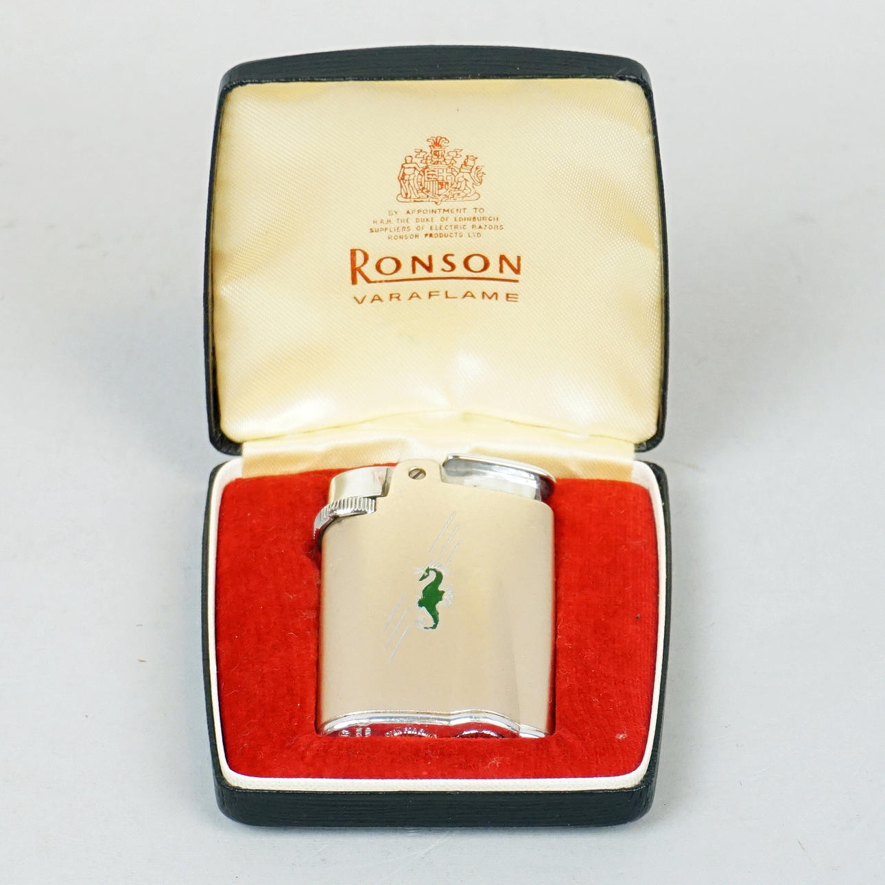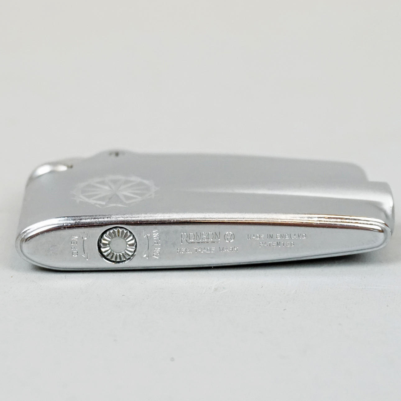Yksi Ronsonin sytytin, korkeus n. 4 cm, leveys 6,5 cm.