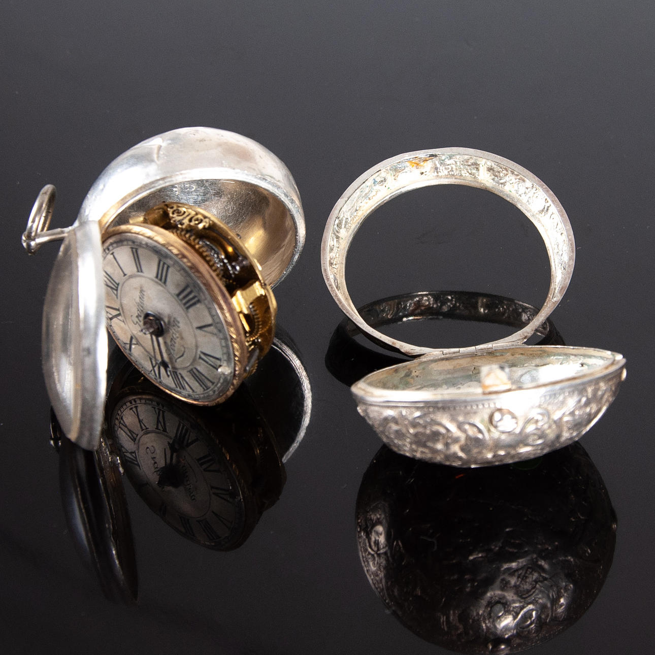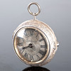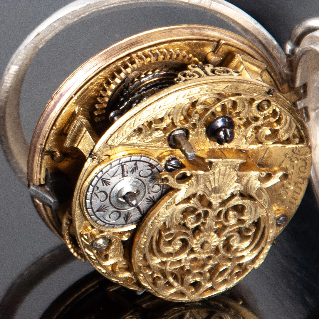 Hopea (leimaamaton), liike ja kellotaulu "Graham London". Kellotaulu mustilla roomalaisilla numeroilla, ulkoreuna minuuttijaolla. Runsaasti koristeltu kellokotelo. Halkaisija n. 40mm ja n. 49mm kotelon kanssa.
