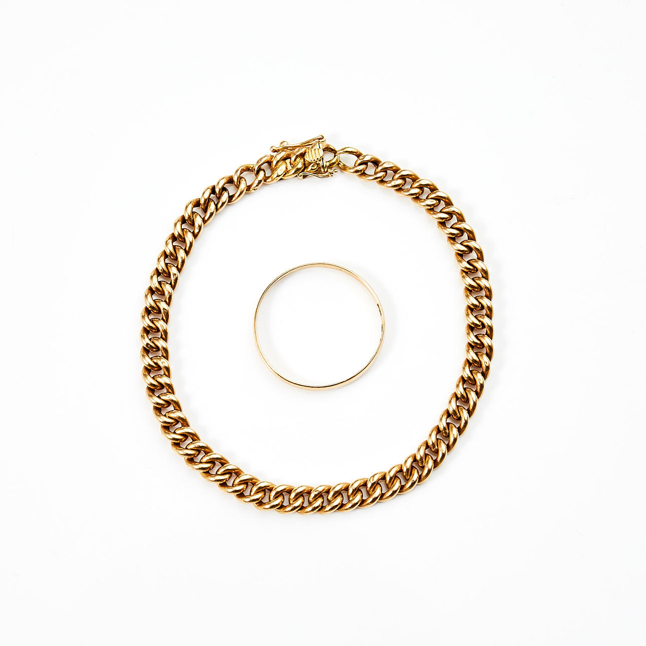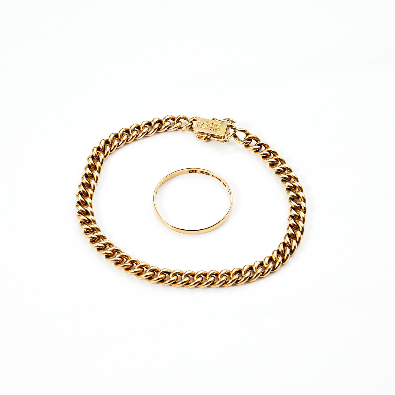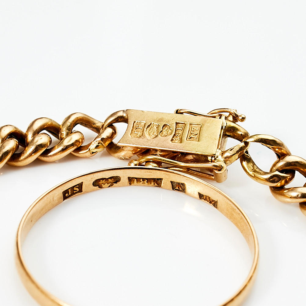 Sormusleima Svensson J, Kalmar, 1919 Rannekoru leimattu Petterssons Eftr Juvelerar Ab Joh., 1915 kokonaispaino 8,5 g sormuskoko nro. 30 / 22,25 mm rannekorun pituus 20 cm.