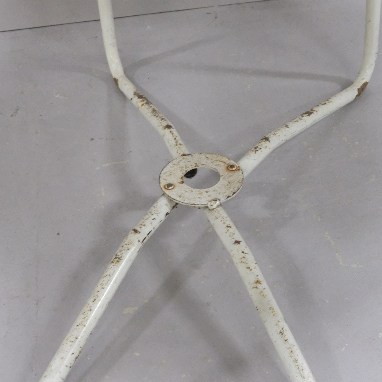 Runko valkoiseksi maalattua metallia ja pyöreä puinen kansi.