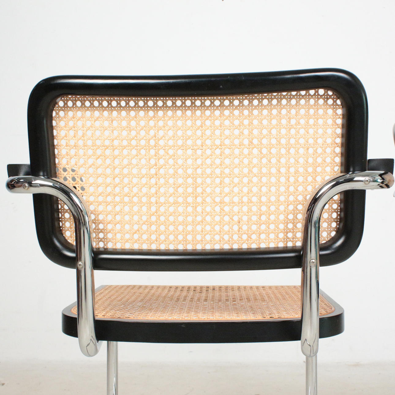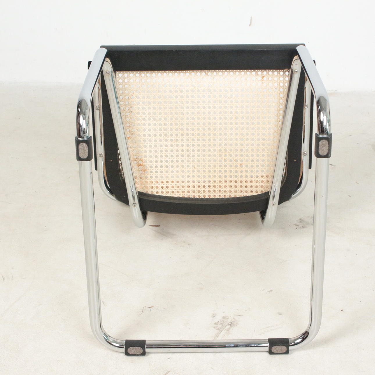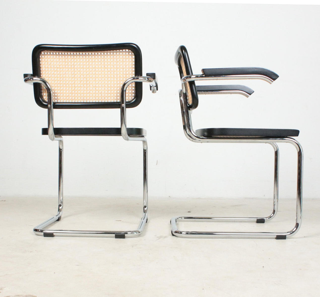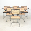 Kuusi uloketuolia käsinojilla Bauhaus tyyliin, teräsrunko, rottinkikudos, mitat n.: K. 80 cm, L. 58 cm, halkaisija 56 cm.