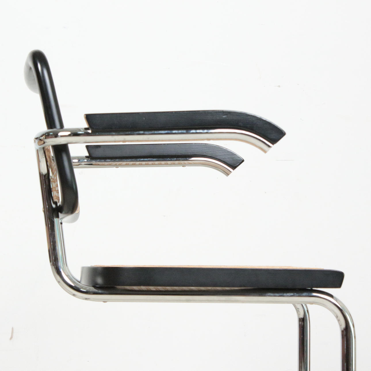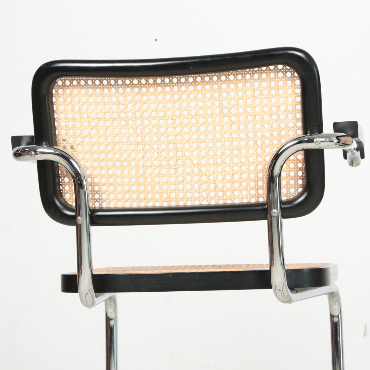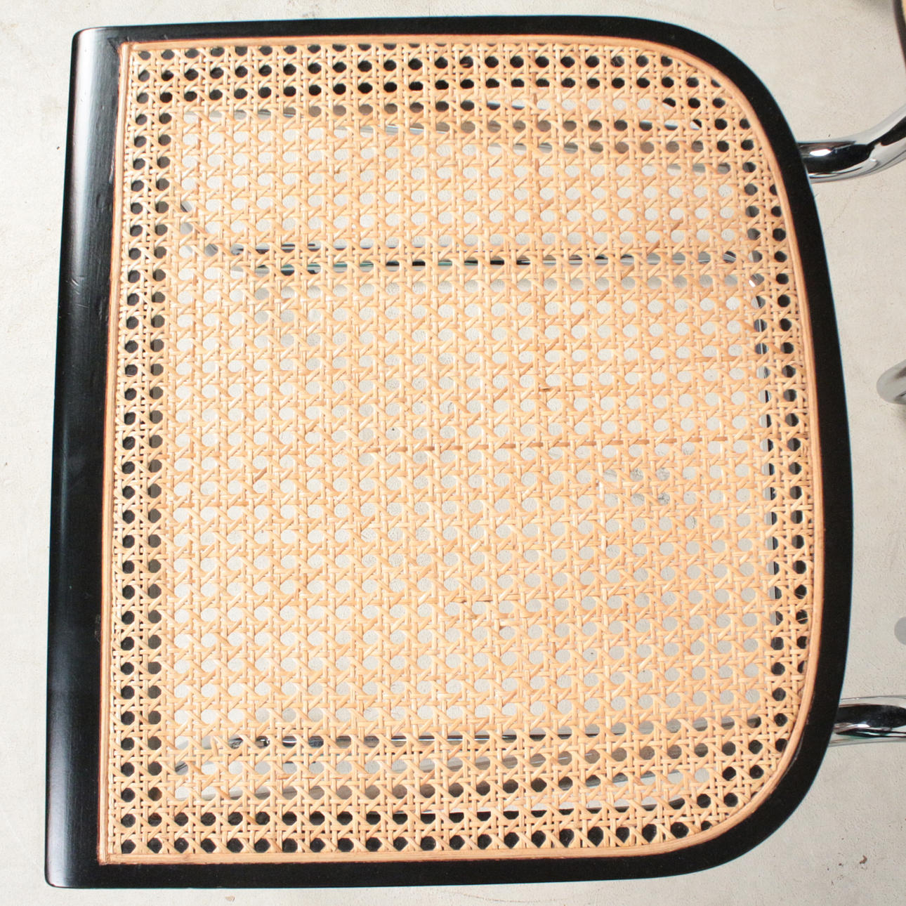 Kuusi uloketuolia käsinojilla Bauhaus tyyliin, teräsrunko, rottinkikudos, mitat n.: K. 80 cm, L. 58 cm, halkaisija 56 cm.