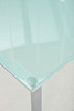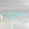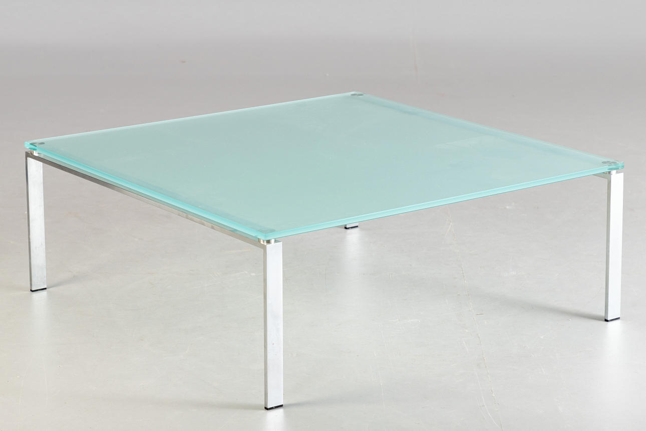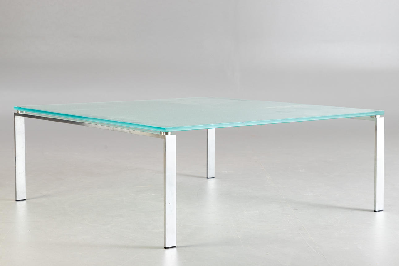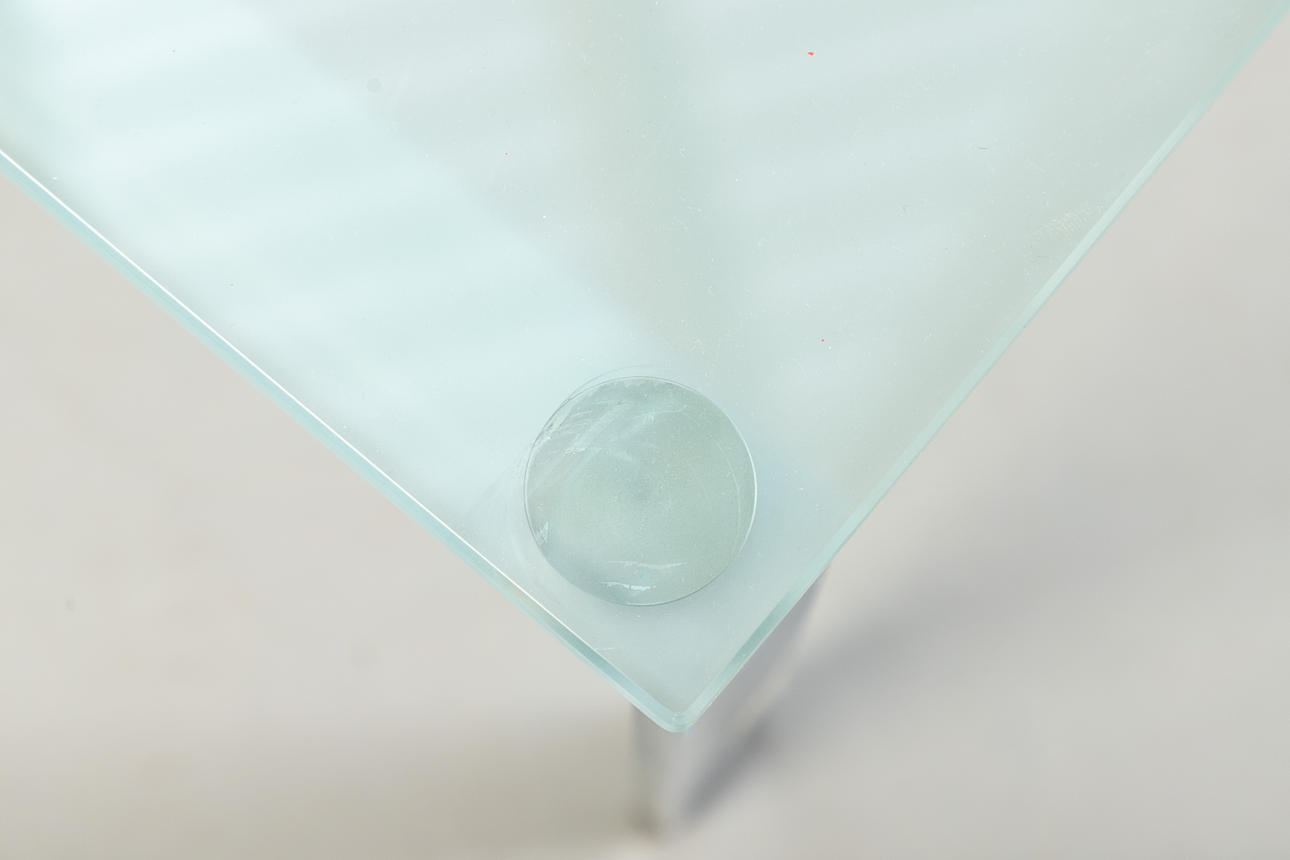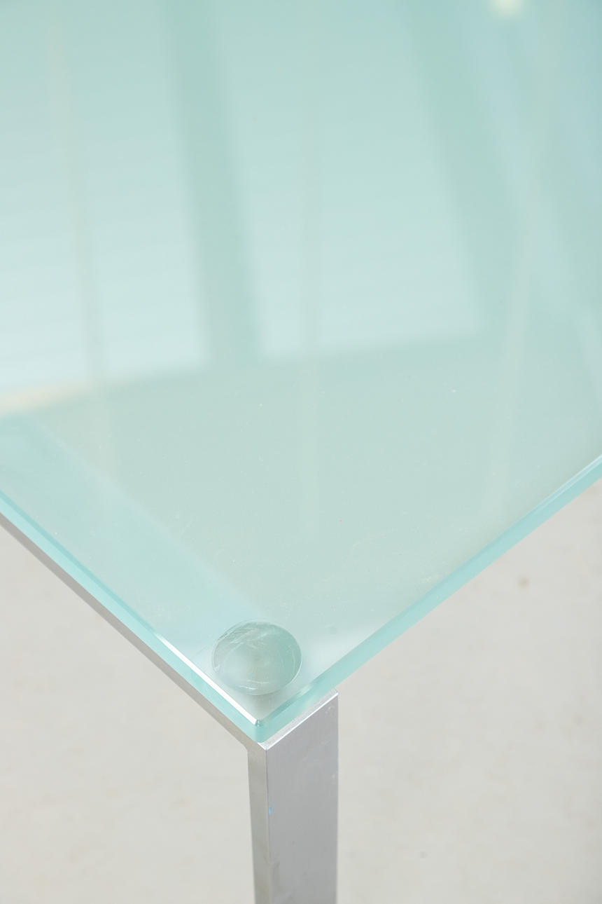 Neliönmuotoinen lasipöytä/sohvapöytä teräsjalustalla.